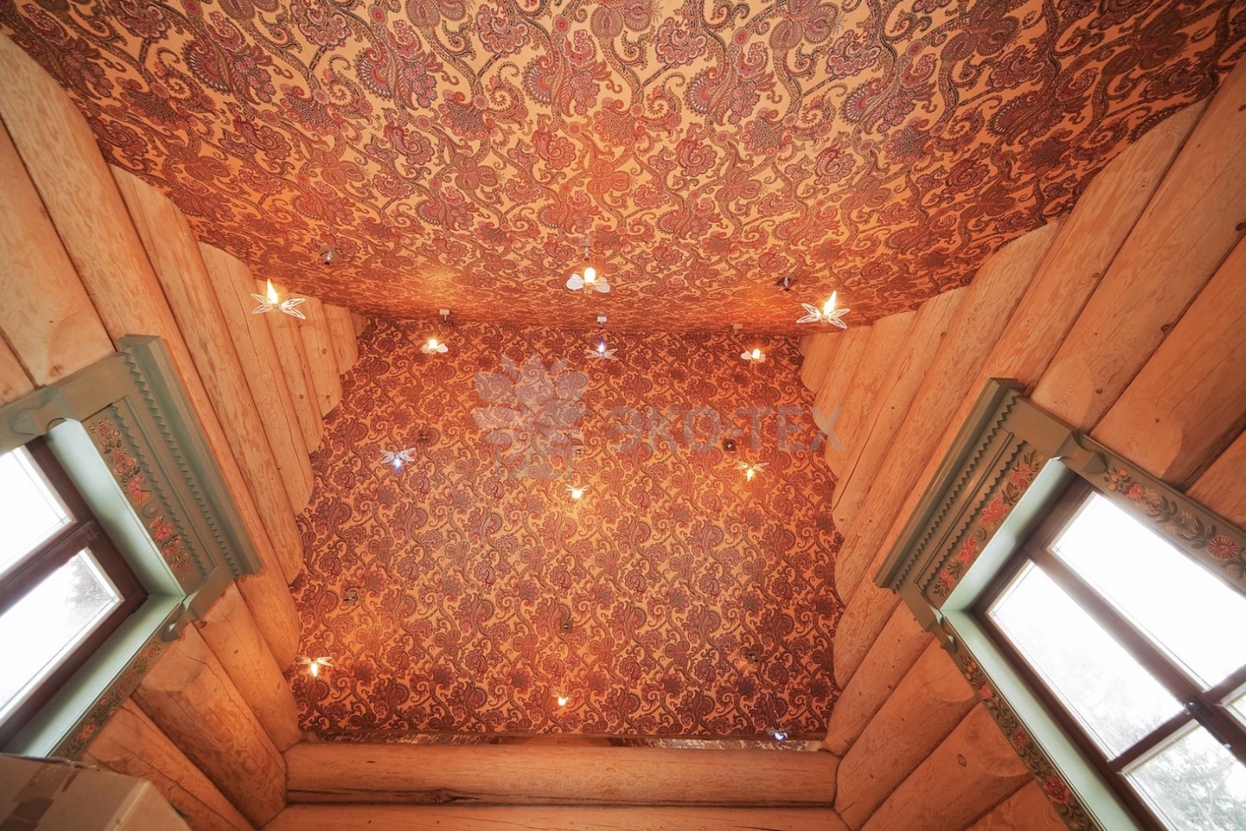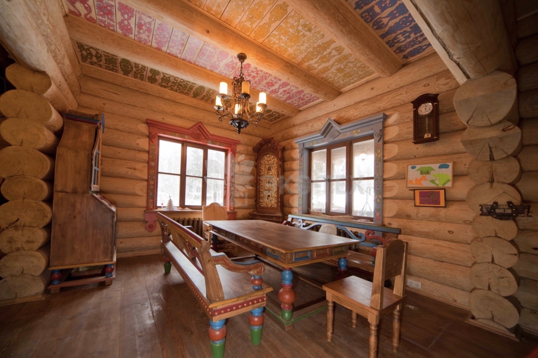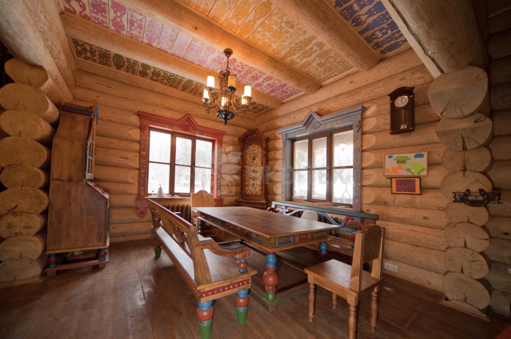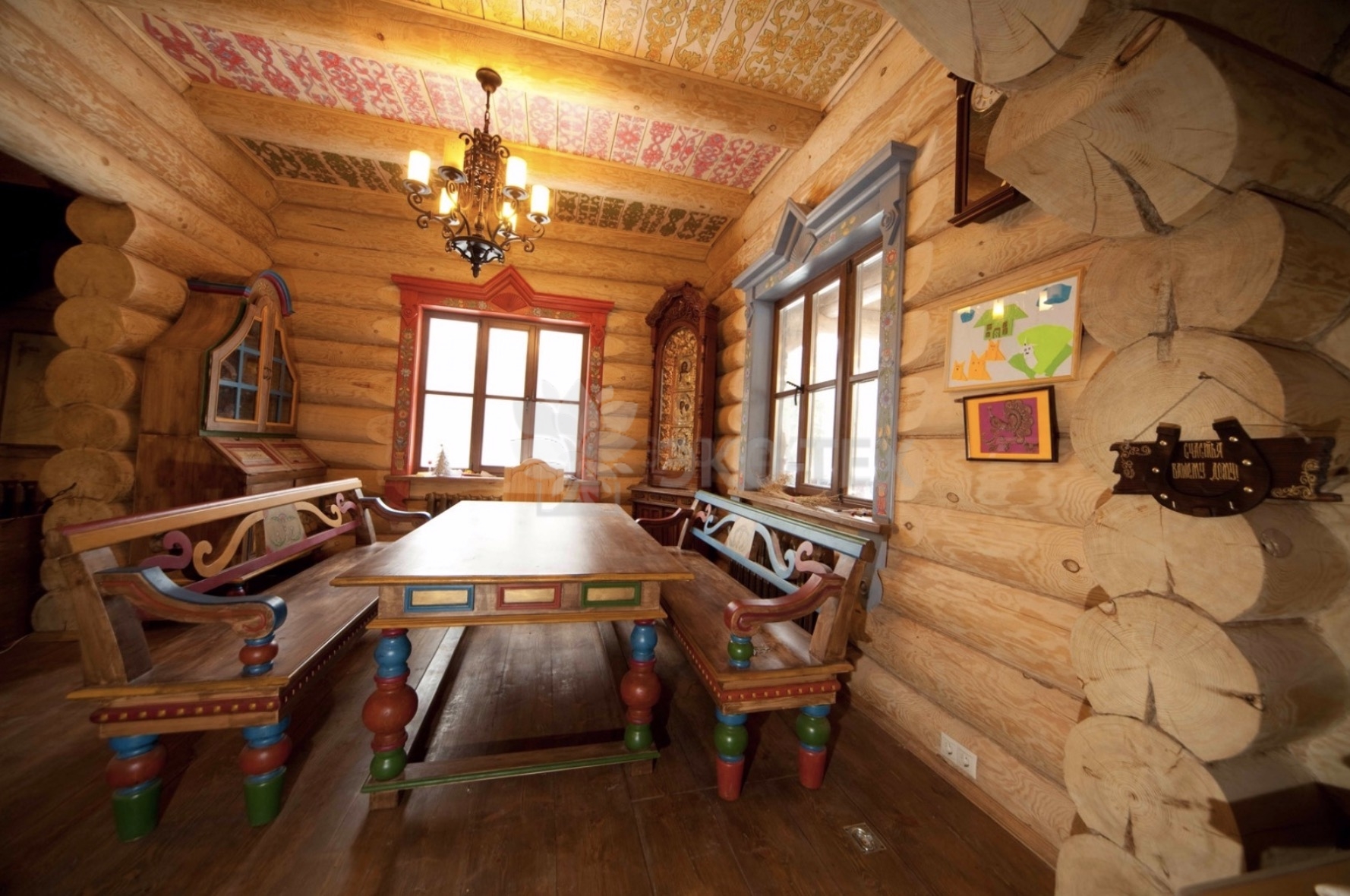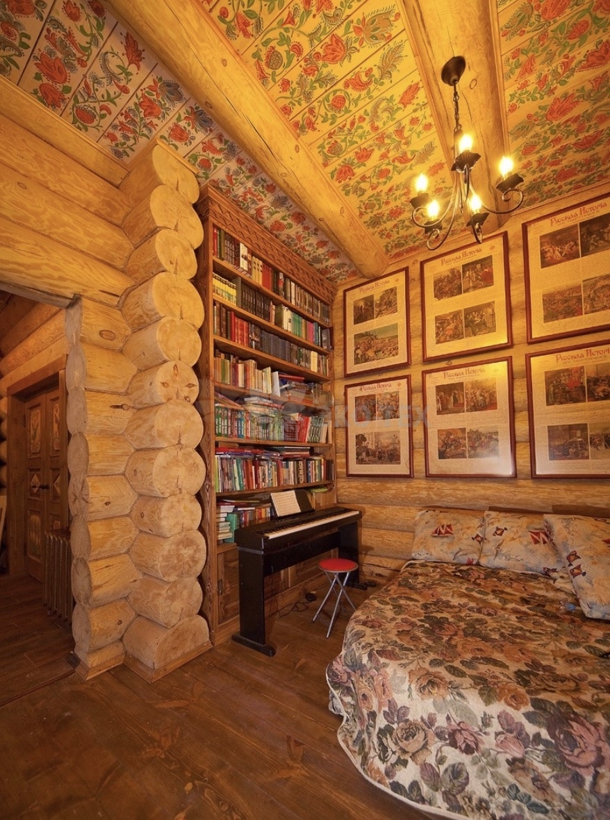 Внутренний интерьер соответствует общему дизайну дома – массивная резная мебель, бревенчатые стены, русская печь. На фасадах – художественная резьба, текстиль с русскими мотивами. Цветовая палитра – естественный цвет натурального дерева.