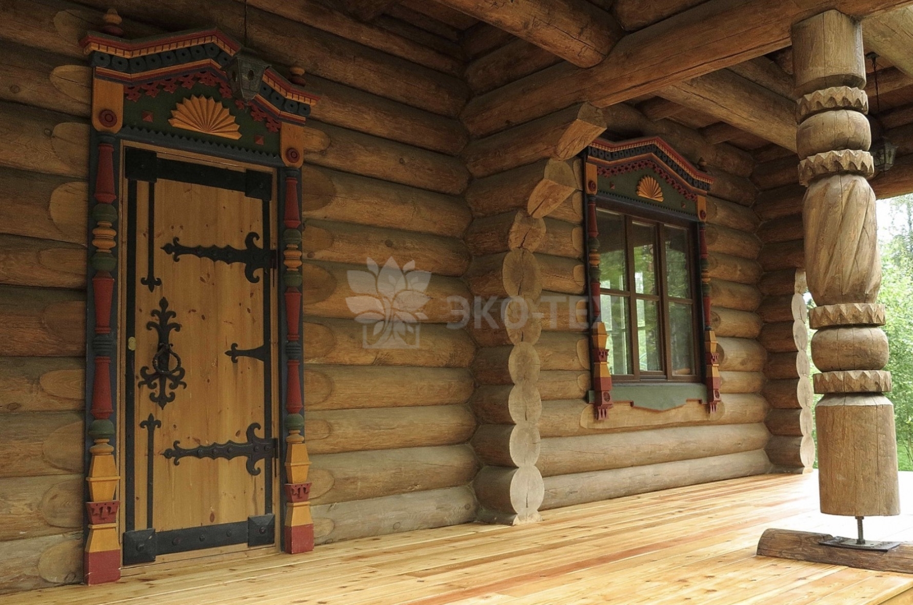 Отдельные элементы крыши характерны для русской деревянной архитектуры 17-18 века. Окна, двери украшены резными декоративными наличниками.