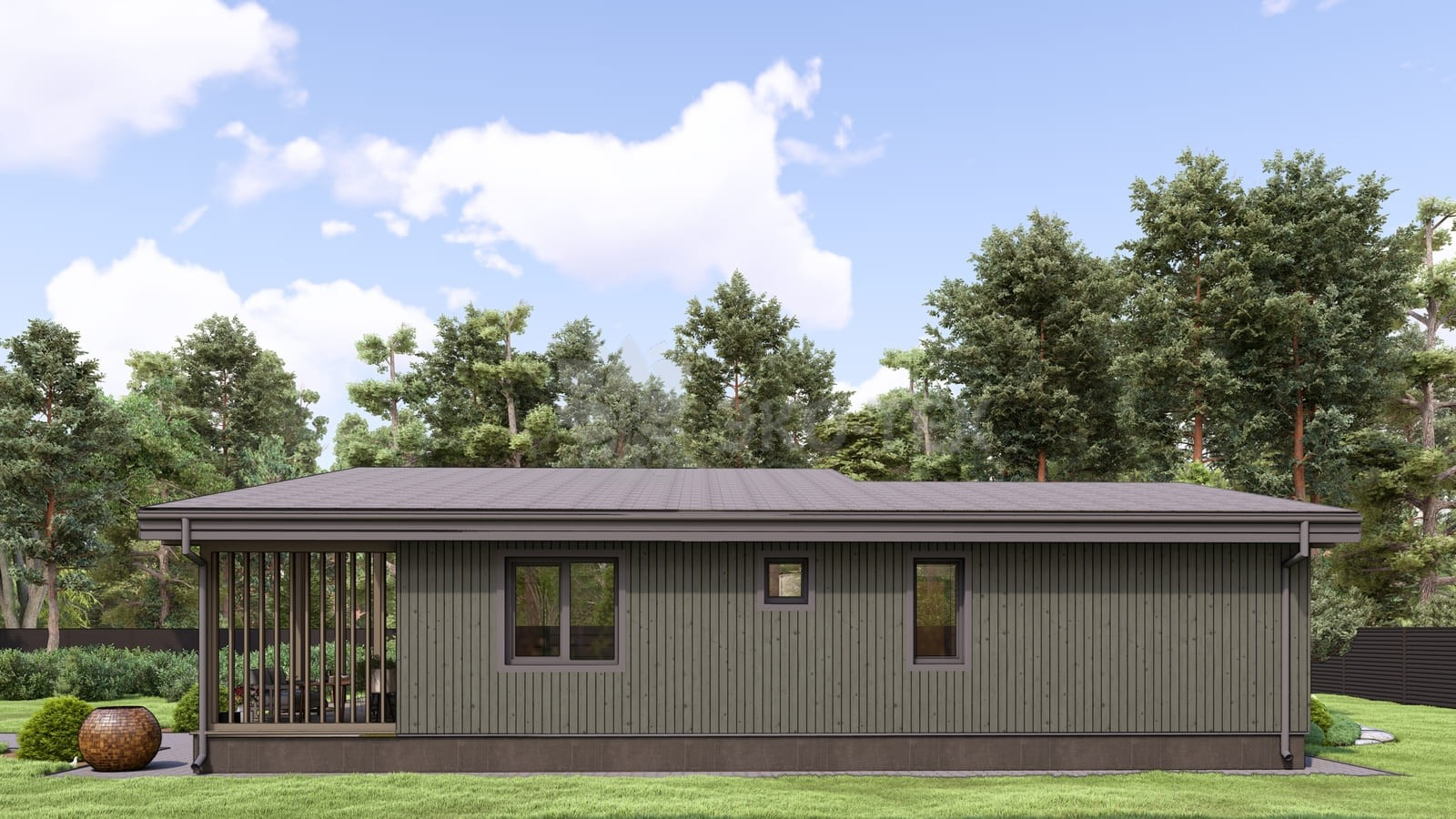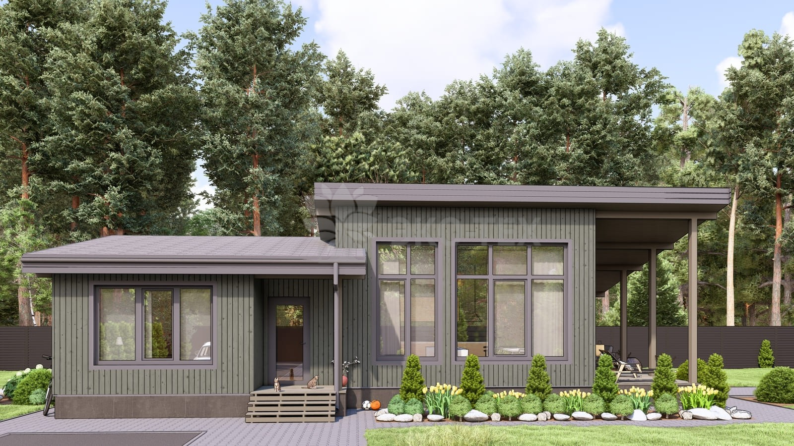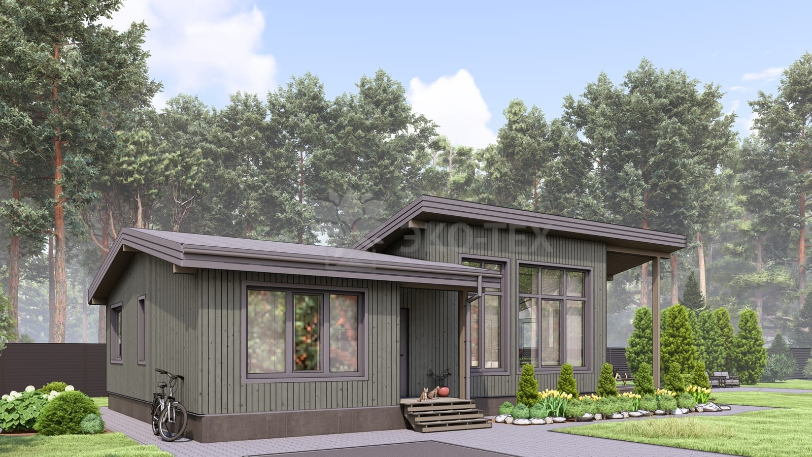Каркасный дом для постоянного проживания c кровлей металлочерепица, отделка, окна, фундамент железобетонные сваи сечение 150*150 мм, L (длина) - 3 000 мм