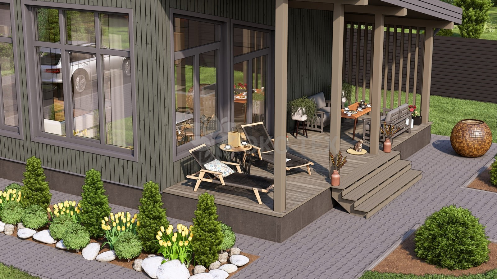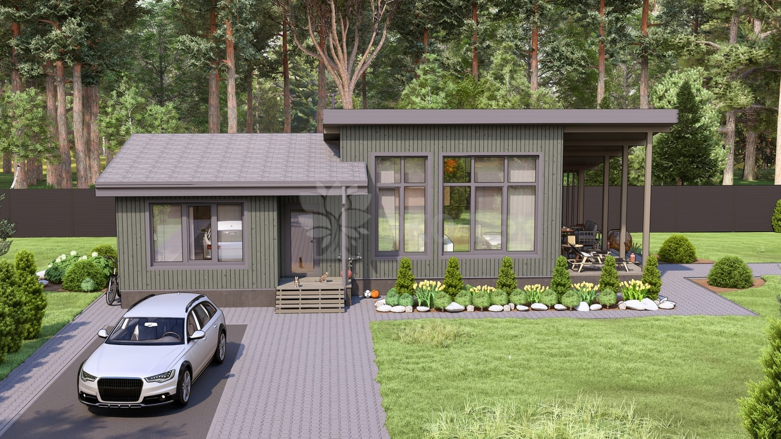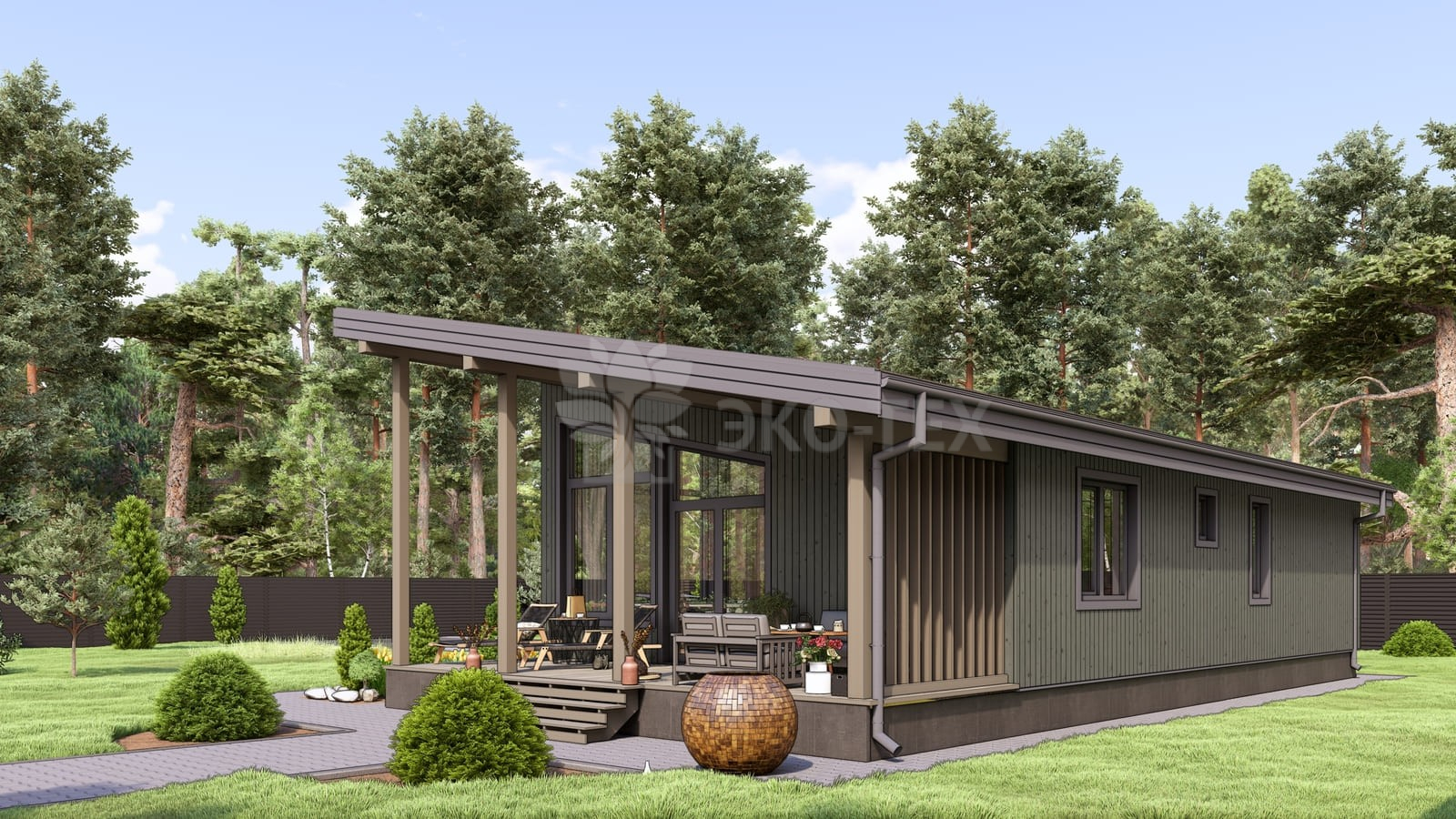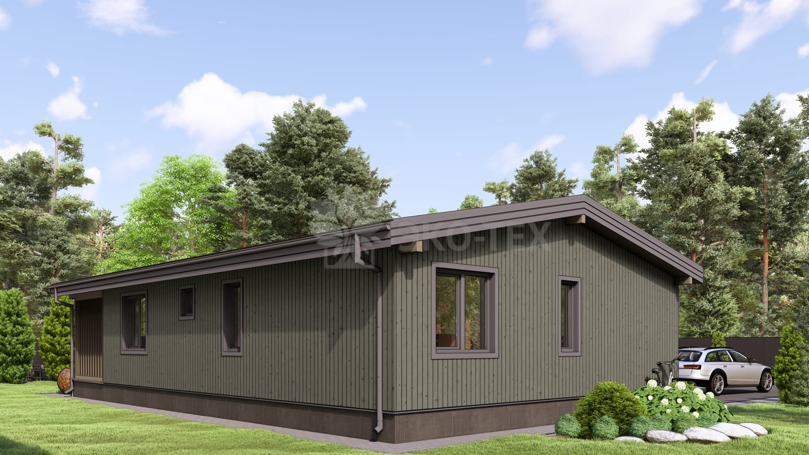 Каркасный дом для постоянного проживания c кровлей металлочерепица, отделка, окна, фундамент железобетонные сваи сечение 150*150 мм, L (длина) - 3 000 мм