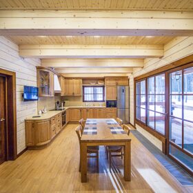 Дома из клееного бруса требуют профессионального подхода при обустройстве. Когда и как отделывать постройку, решает бригада опытных мастеров. Это зависит от специфики материала, плана выполнения работ и проектных сроков установки конструкции дома. Проёмы для дверей и окон, как правило, конструируются с учетом усадки, поэтому опытные монтажники ответственно подходят к процессу сборки. Обеспечение равномерной усадки связано с обустройством глухого венца (можно применять балку-перетяжку), устраняемого при организации дальнейших работ. Добиться прочности и долговечности конструкции можно, если установить нагели: при этом специалисты рекомендуют строго придерживаться технических правил. В среднем, применяется пара деталей на один венец. Размер проёмов строго фиксируется: допроектное состояние отличается от постпроектного.