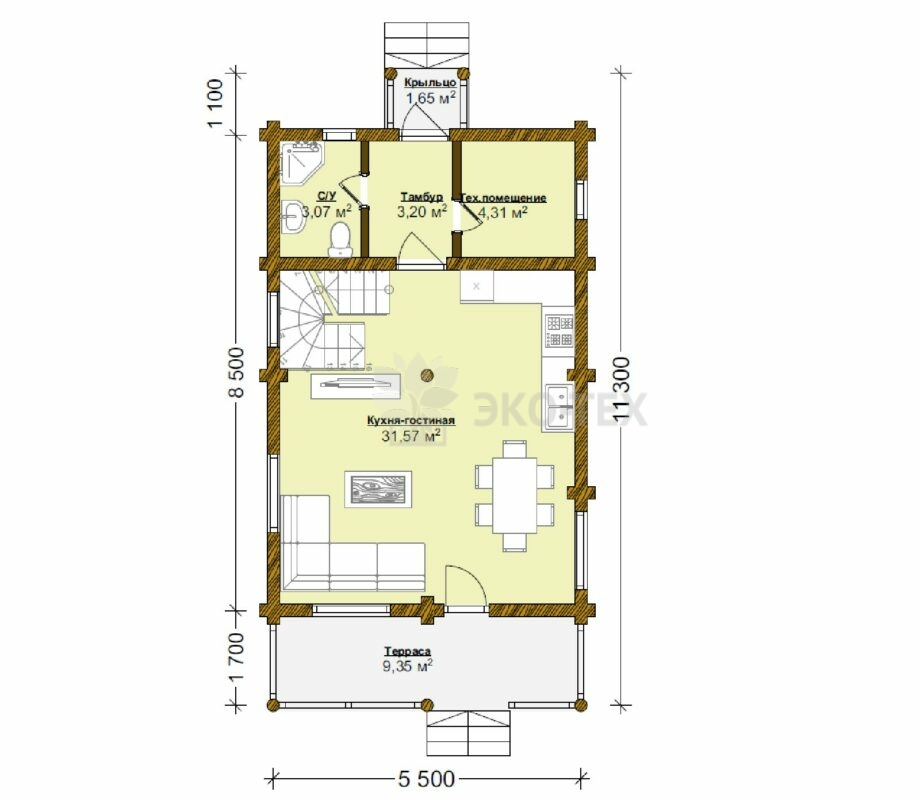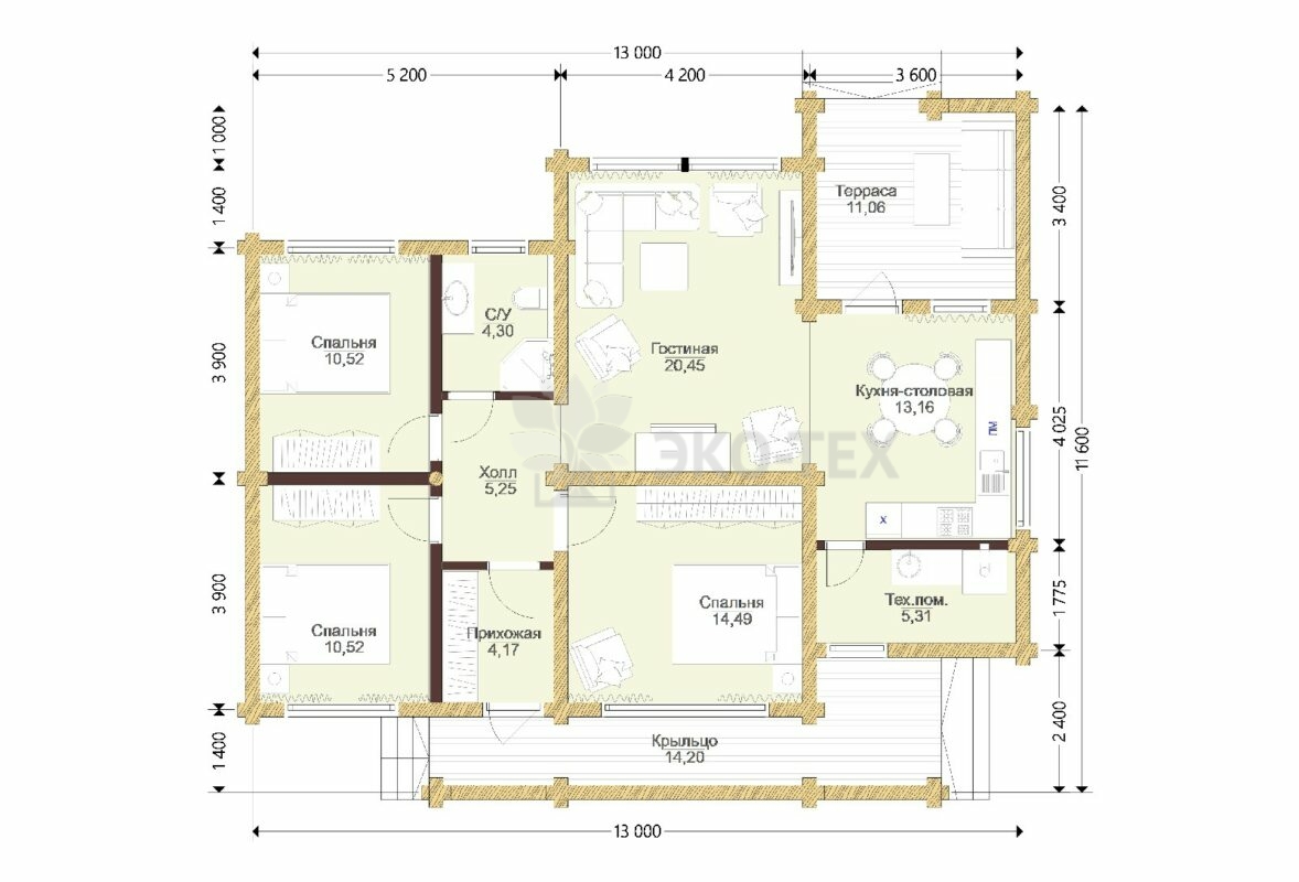 В доме также находится гостиная — столовая, котельная и прихожая, ведущая на удобное крыльцо с широкими ступенями.