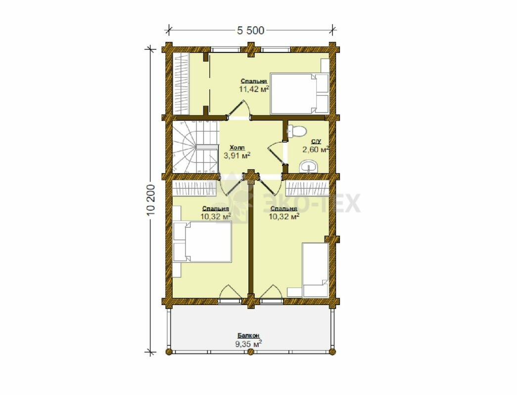 На втором этаже находятся три комнаты различной площади и гардеробная. Все комнаты объединены холлом, на верхнем этаже имеется собственный санузел. Самая большая комната имеет выход на балкон.