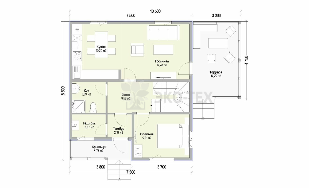 Общая площадь дома составляет 101 м², В доме имеются две жилые комнаты, которые холлом отделены от просторной гостиной, совмещённой с кухней.