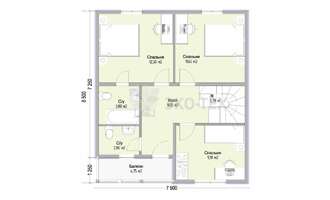На верхнем этаже находится три жилые комнаты, которые связывает общий холл, выход с которого идёт на балкон. Приятным дополнением к дому является летняя терраса.