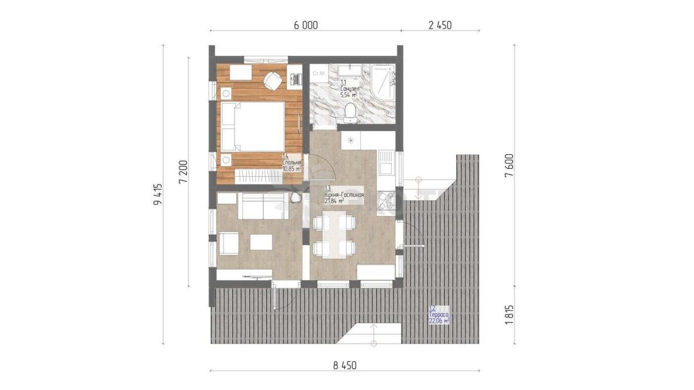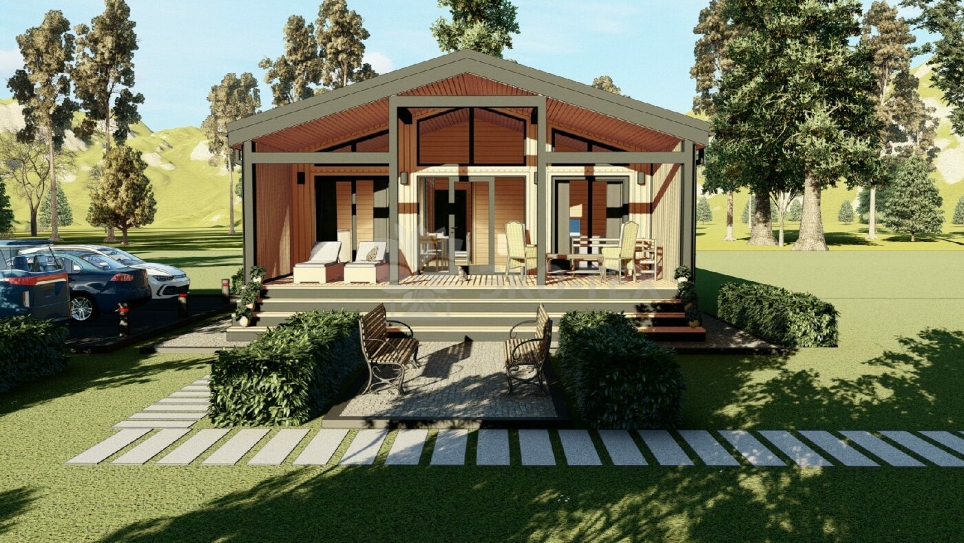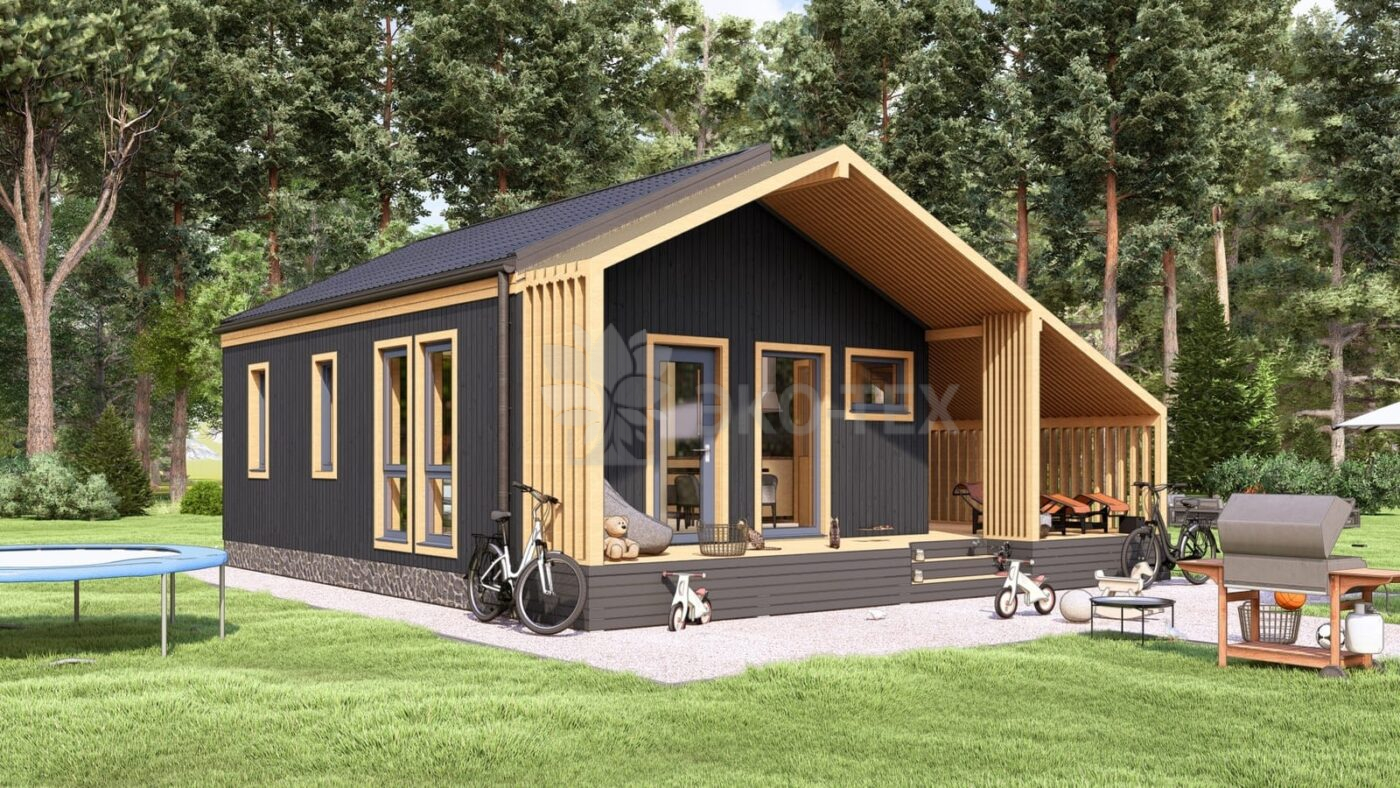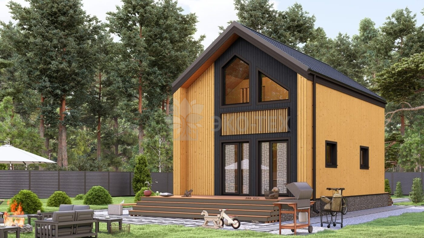 Красивый и стильный дом, общей площадью 112 м², включает в себя две жилые комнаты и просторную кухню-гостиную.