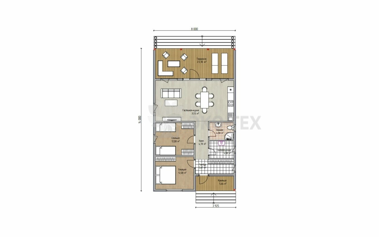 Дом имеет большую угловую террасу и два независимых входа, что позволяет добиться автономности и независимости.