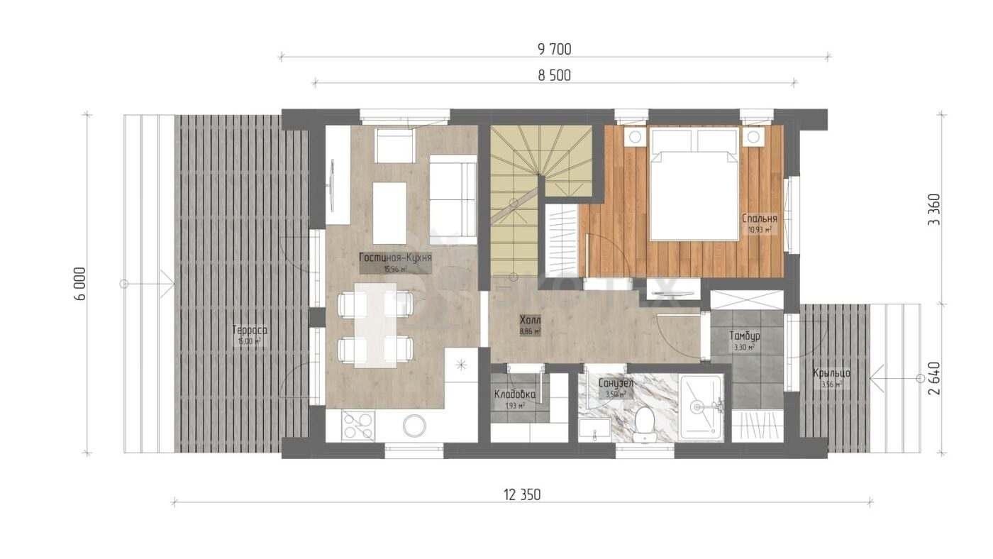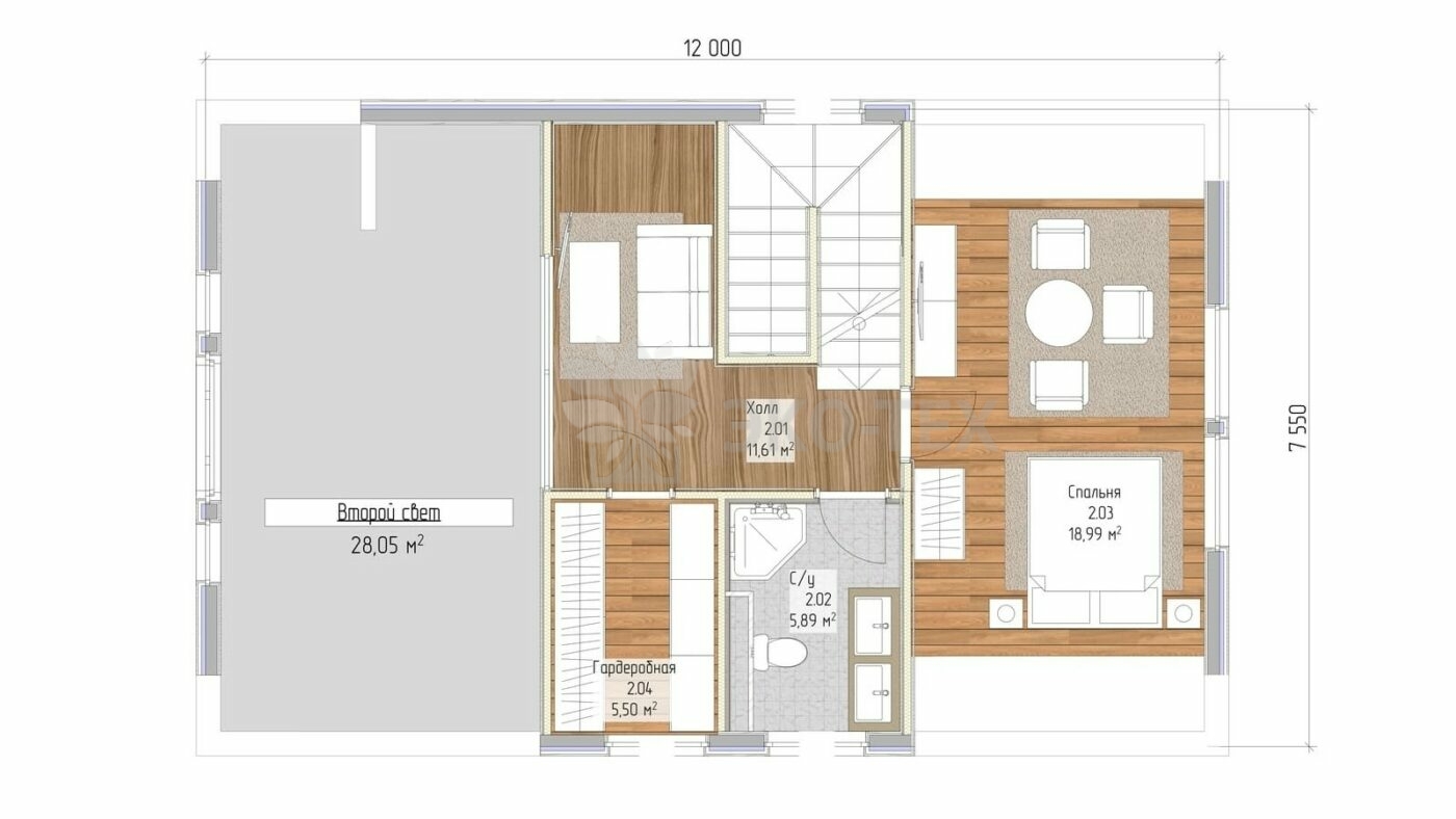 На втором этаже имеется спальня, собственный санузел, гардеробная и удобный большой холл.