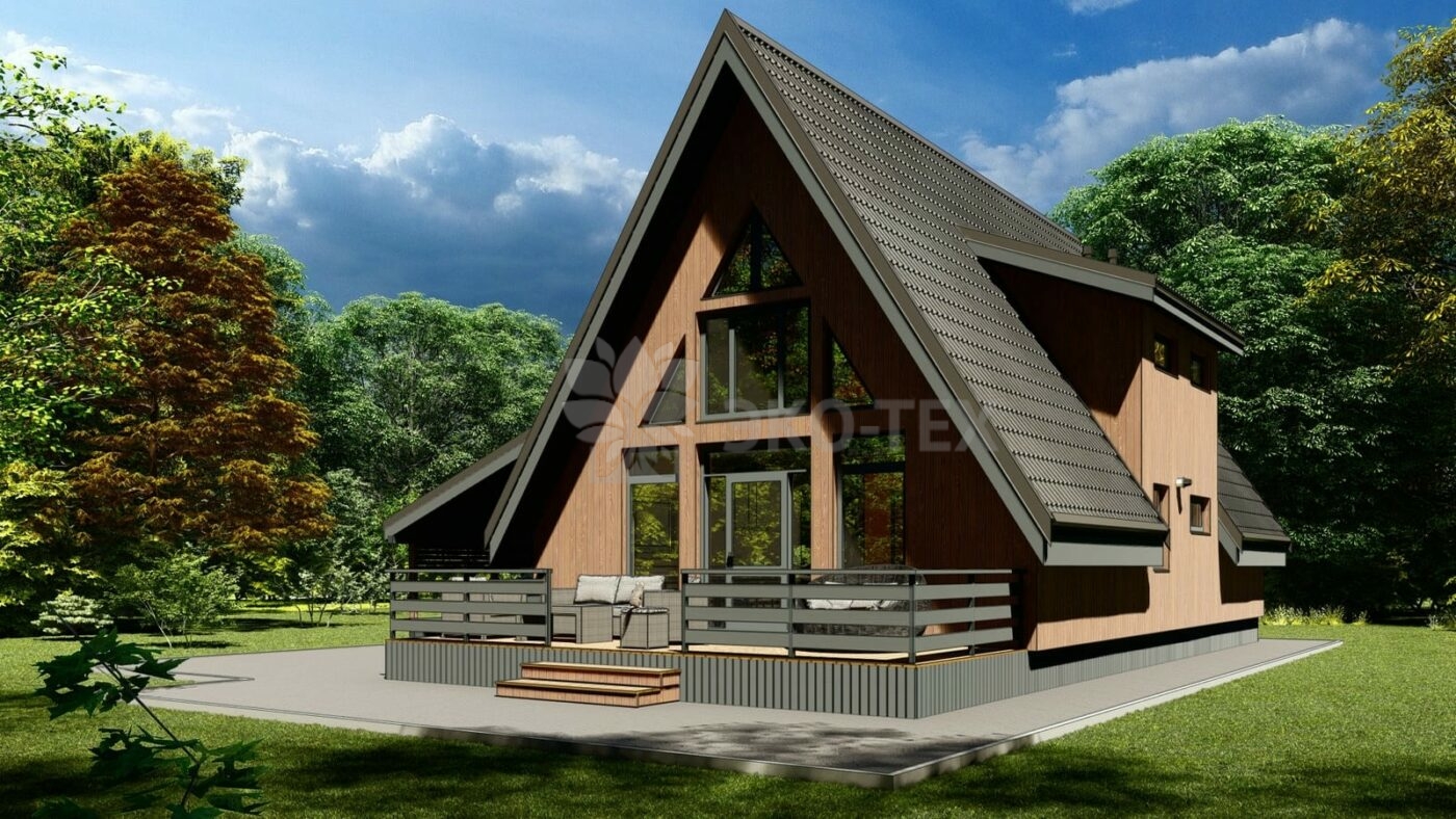 Отличительной чертой планировки являются необычная терраса, которая расширяет пространство полезной площади, практически, вдвое. Площадь дома составляет почти 80 м². Потолок переменной высоты, которая изменяется в пределах от 2,5 до 4 м.