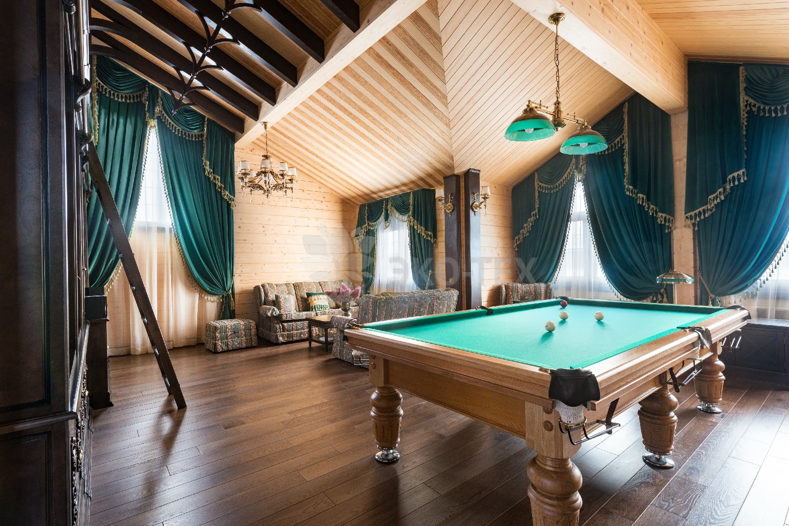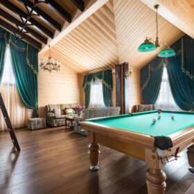 Зона отдыха в виде кальянной, бильярдной или домашнего кинотеатра ещё популярное одно решение для мансардных этажей.