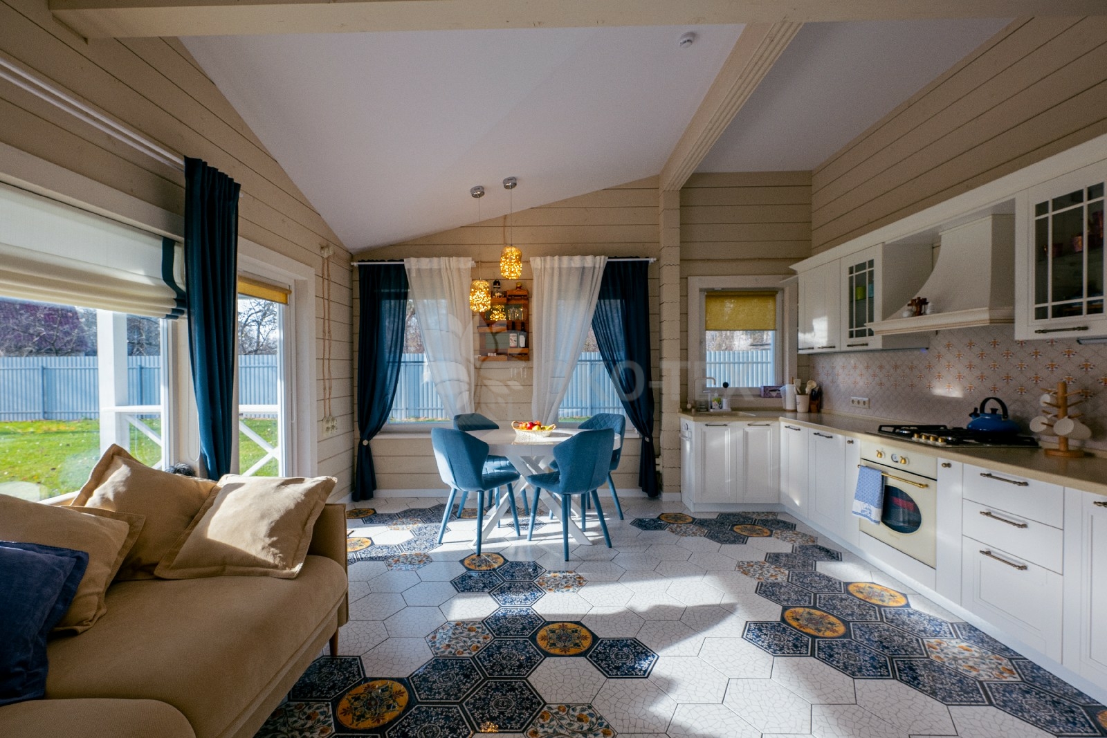 Полезная площадь вашего дома может быть расширена за счёт веранды, на которую можно сделать выход прямо из кухни. В теплое время года она может выполнять  даже роль гостиной, ведь что  может  сравниться с летним чаепитием под трели цикад и сверчков.