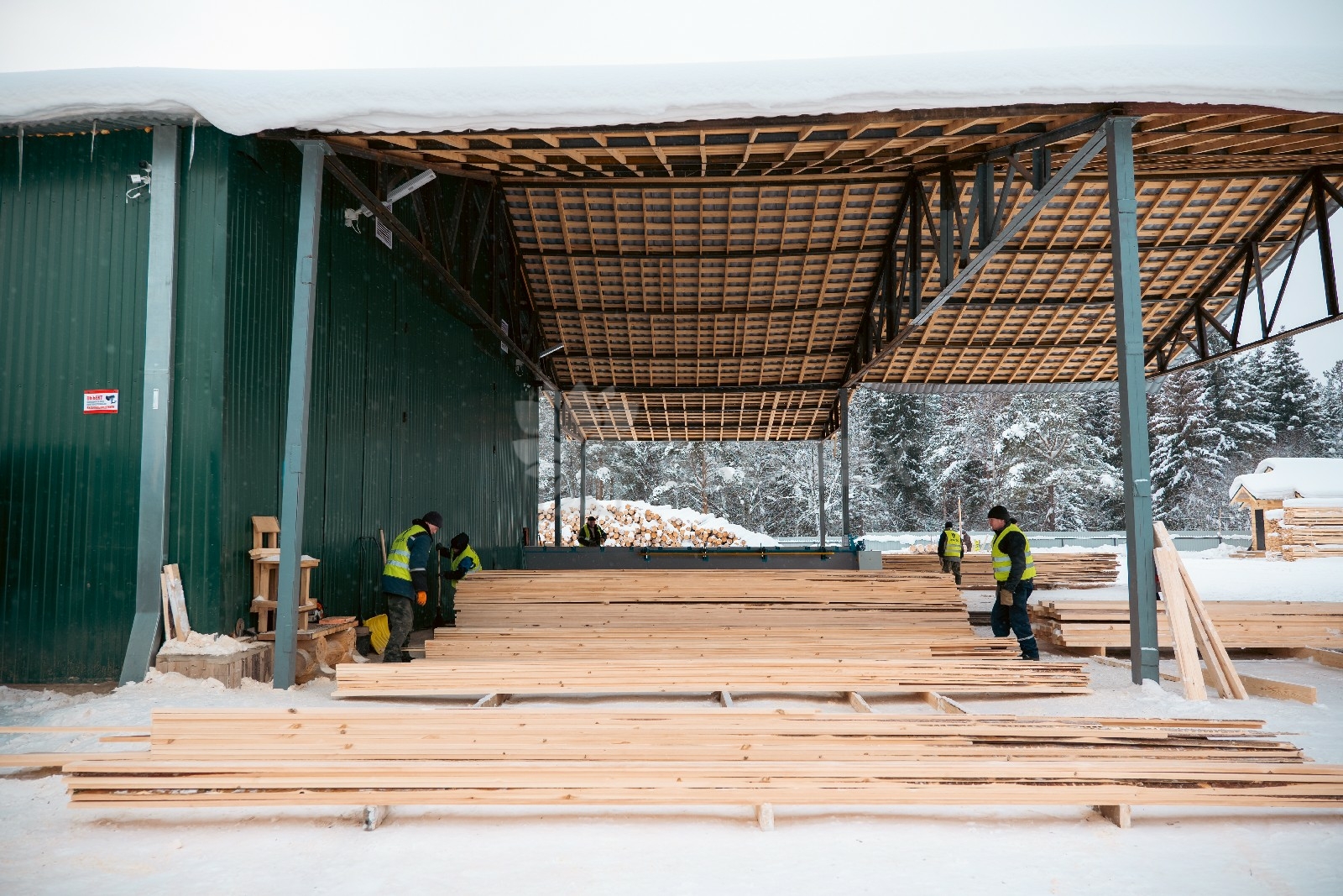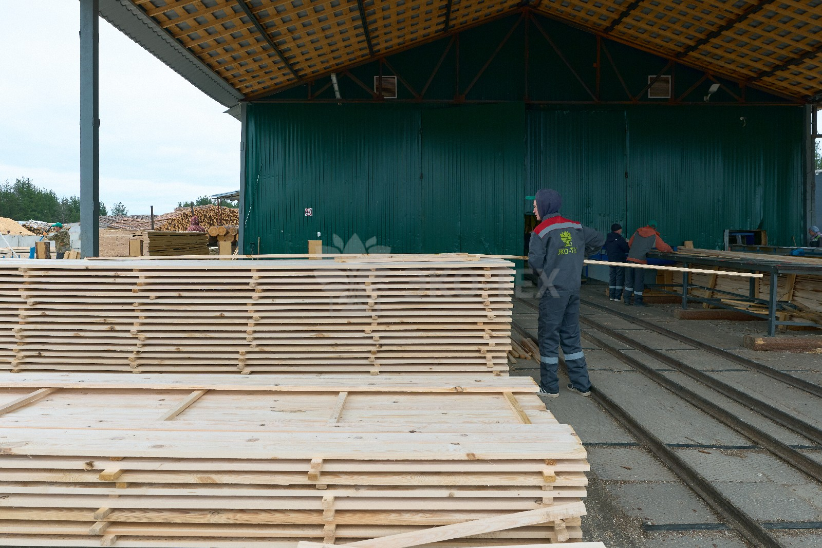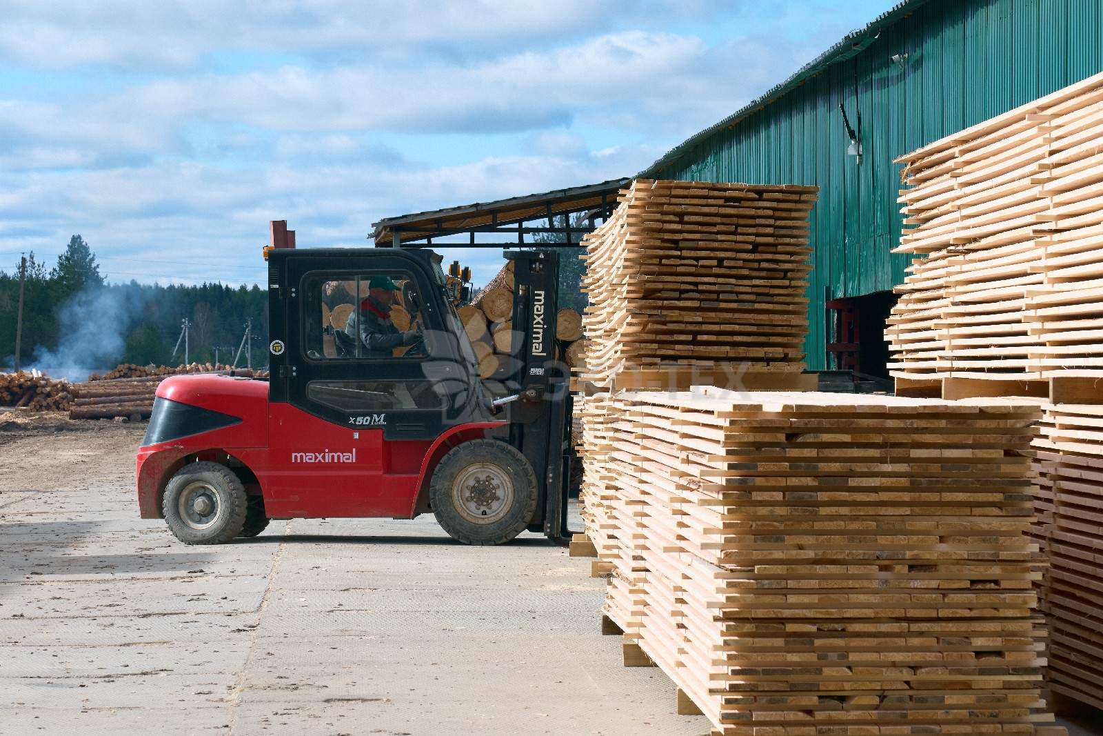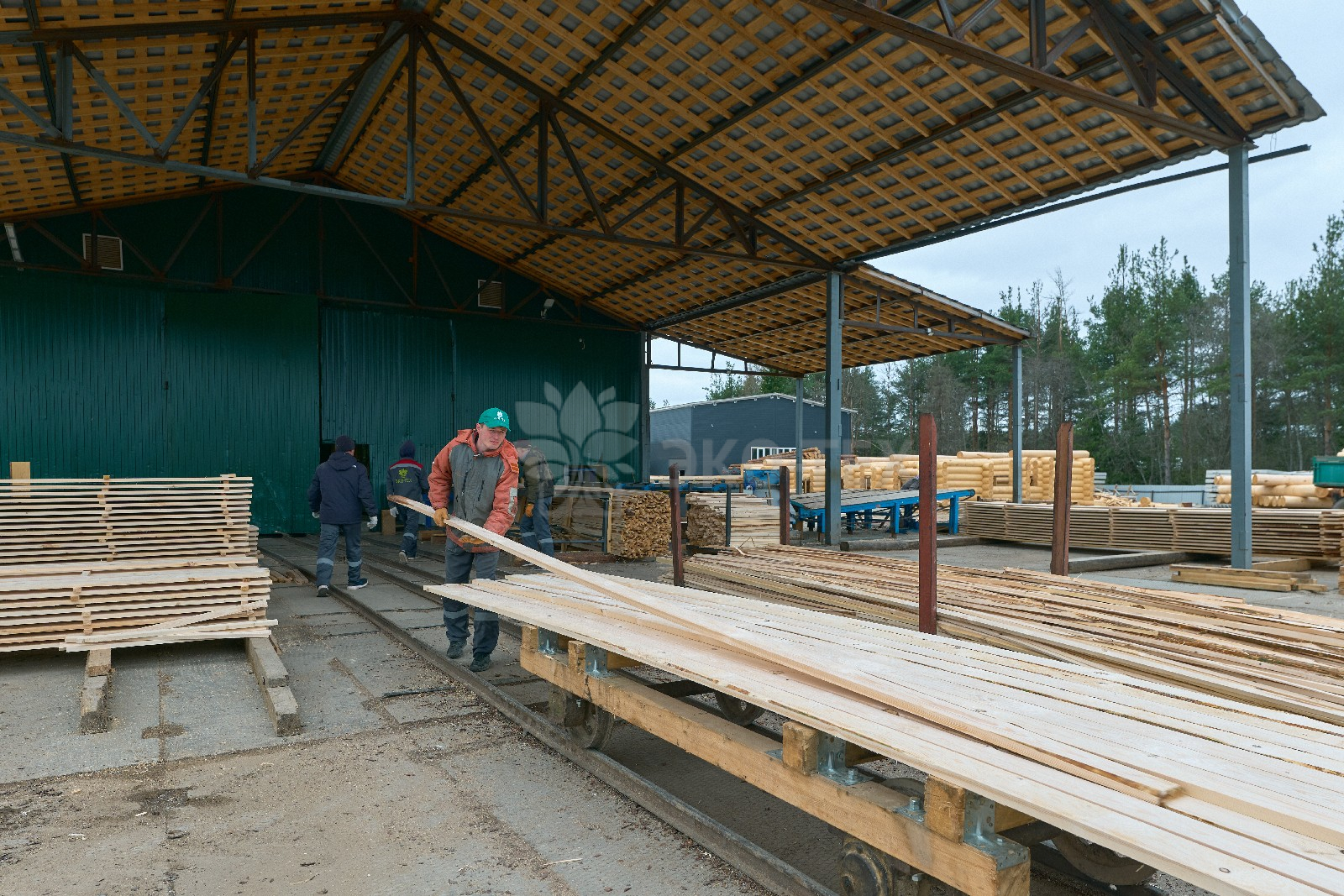 Ежемесячный выпуск продукции составляет более 10 000 м³, включая пиломатериалы, клееный брус, термодоску и другие изделия.