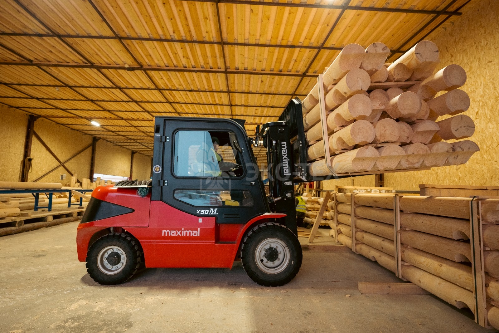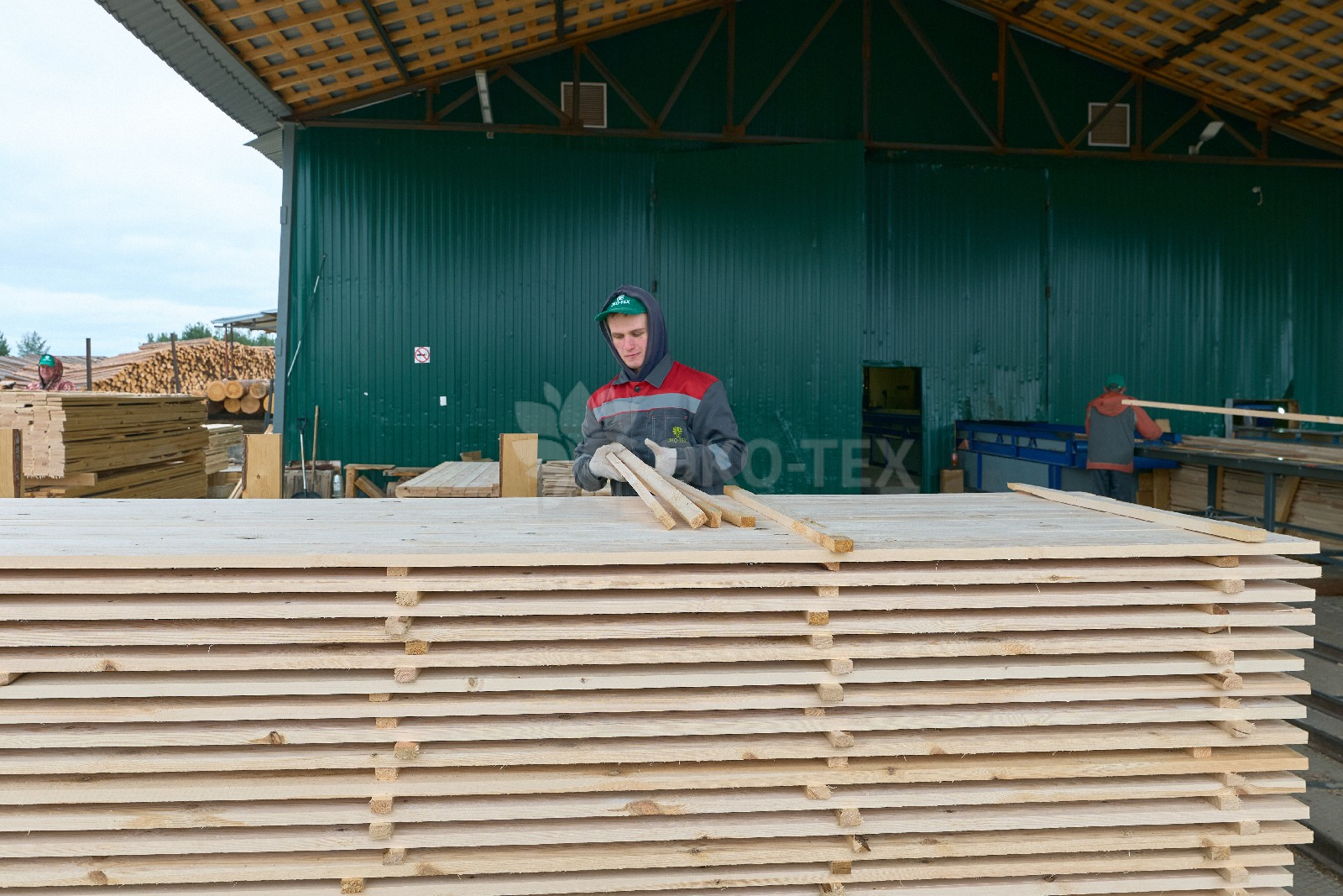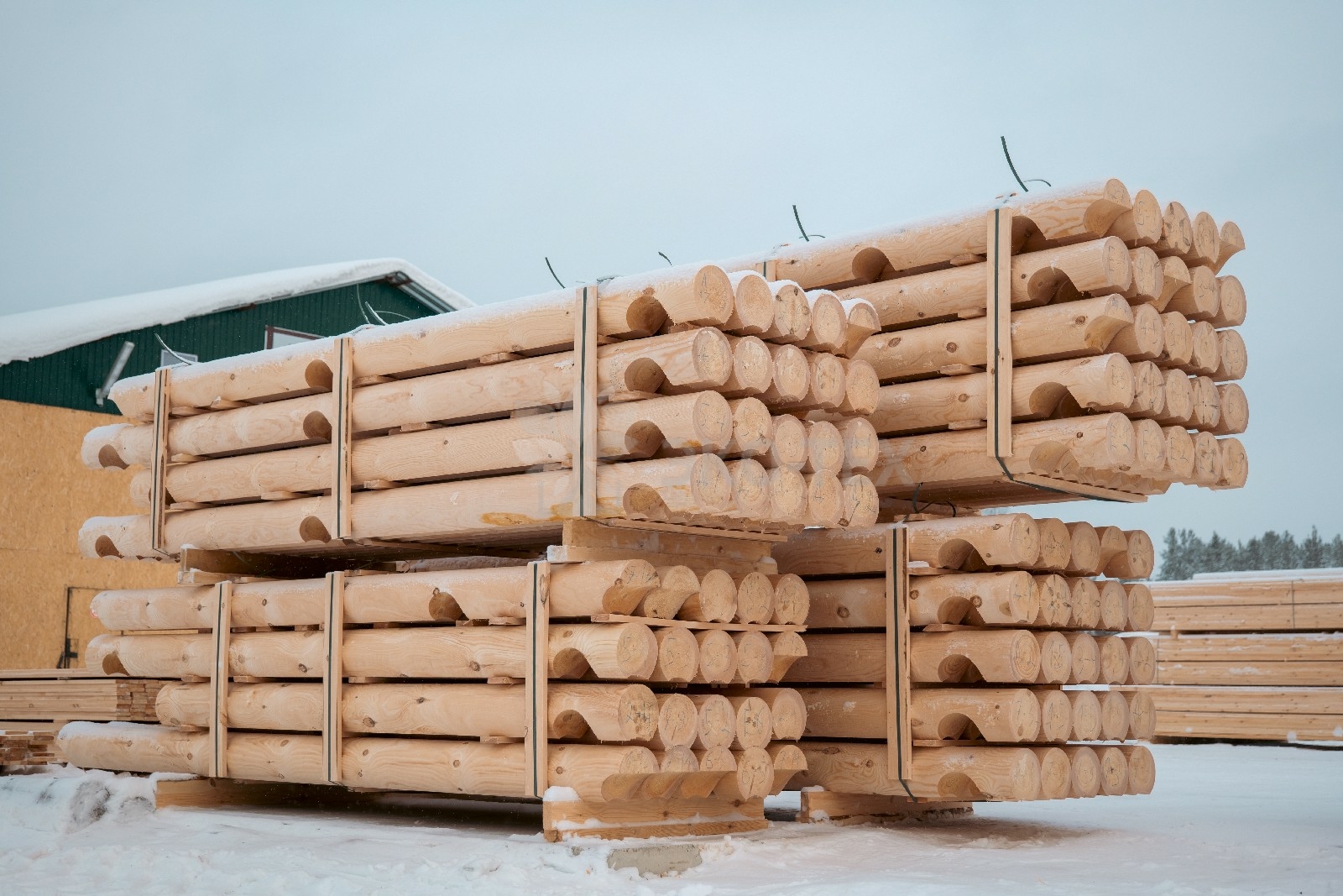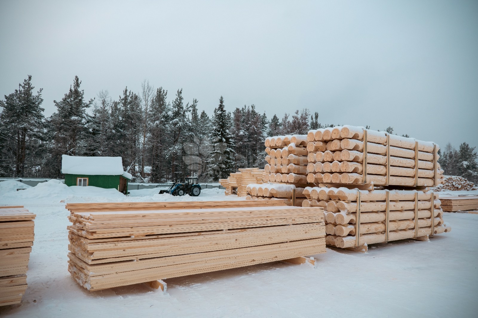 Ежемесячный выпуск продукции составляет более 10 000 м³, включая пиломатериалы, клееный брус, термодоску и другие изделия.