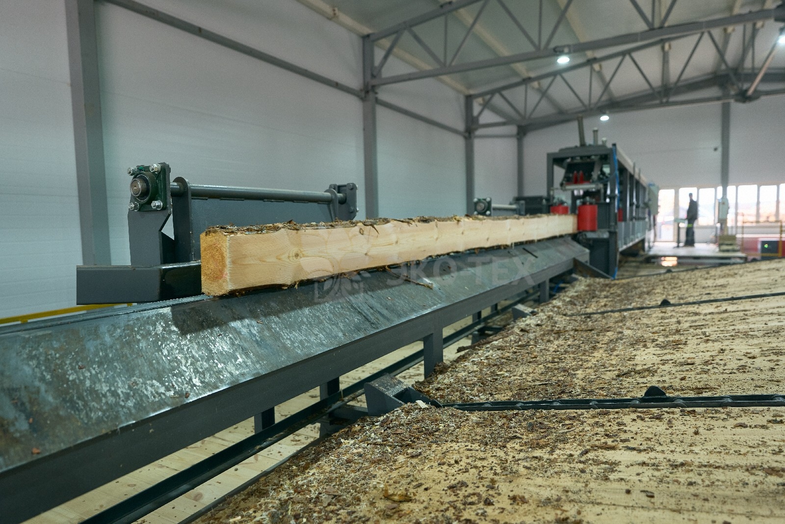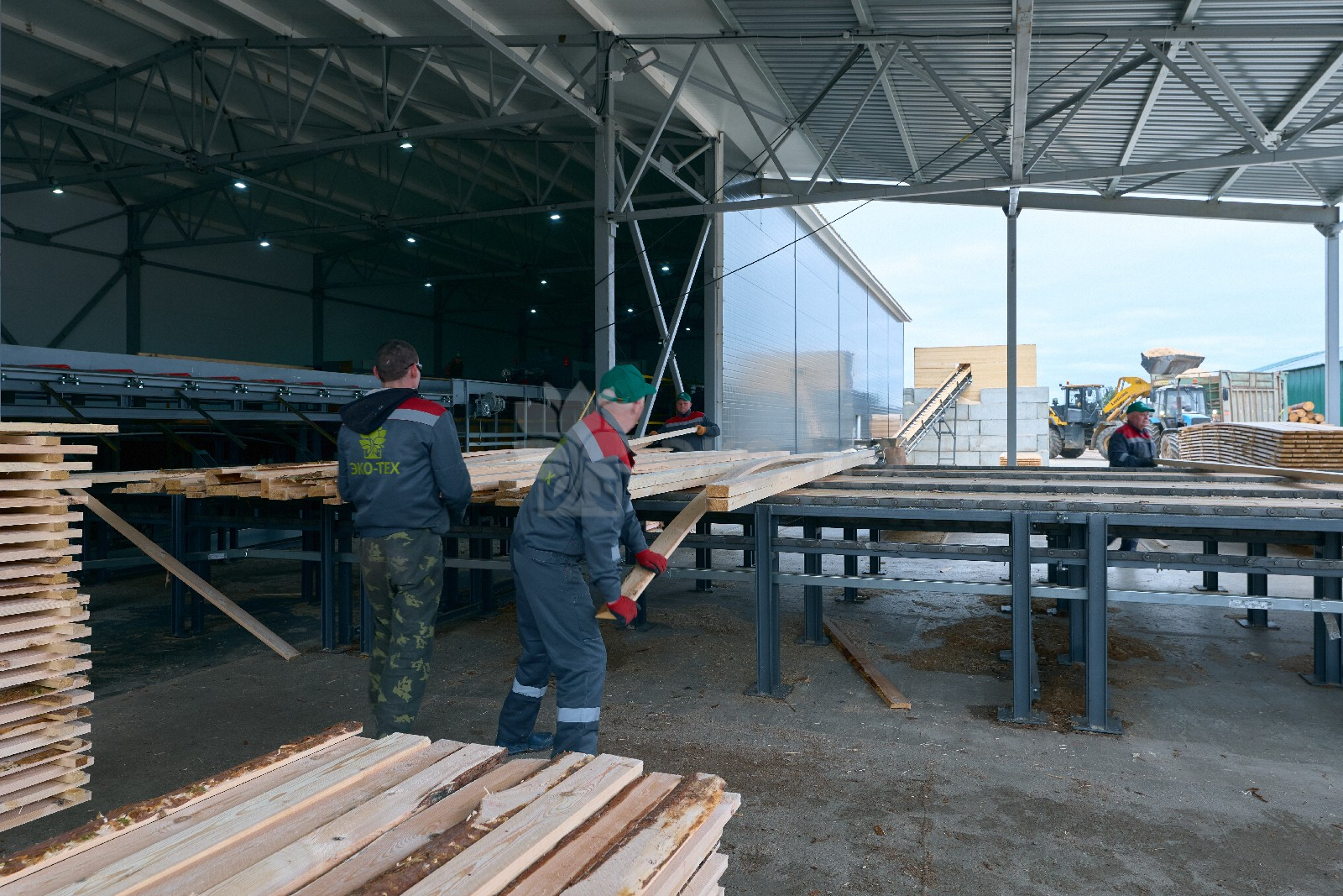 Горбыльная и подгорбыльная доска обрезаются на кромкообрезном станке, а лафетная проходит высокоточный распил. Вся продукция сортируется по категориям, а система аспирации удаляет опилки и мелкие частицы, поддерживая чистоту в производственном помещении.