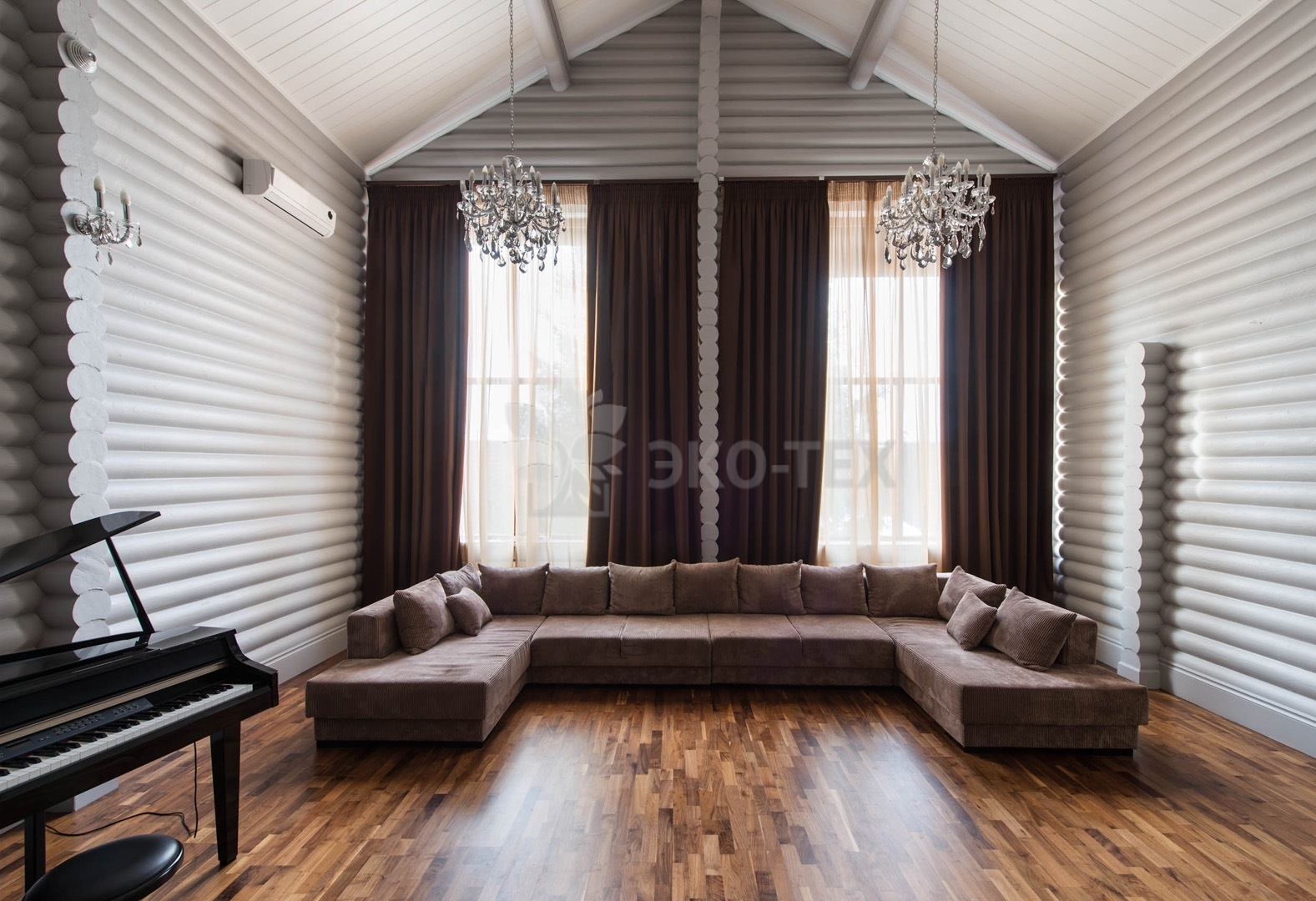 При отделке жилья стены из оцилиндрованного бревна обрабатываются специальным составом, предохраняющим дерево от механических повреждений и влажности. Проводится тонирование, придающее определённый оттенок поверхности, затем наносится поверхностное защитное покрытие для особой гладкости.