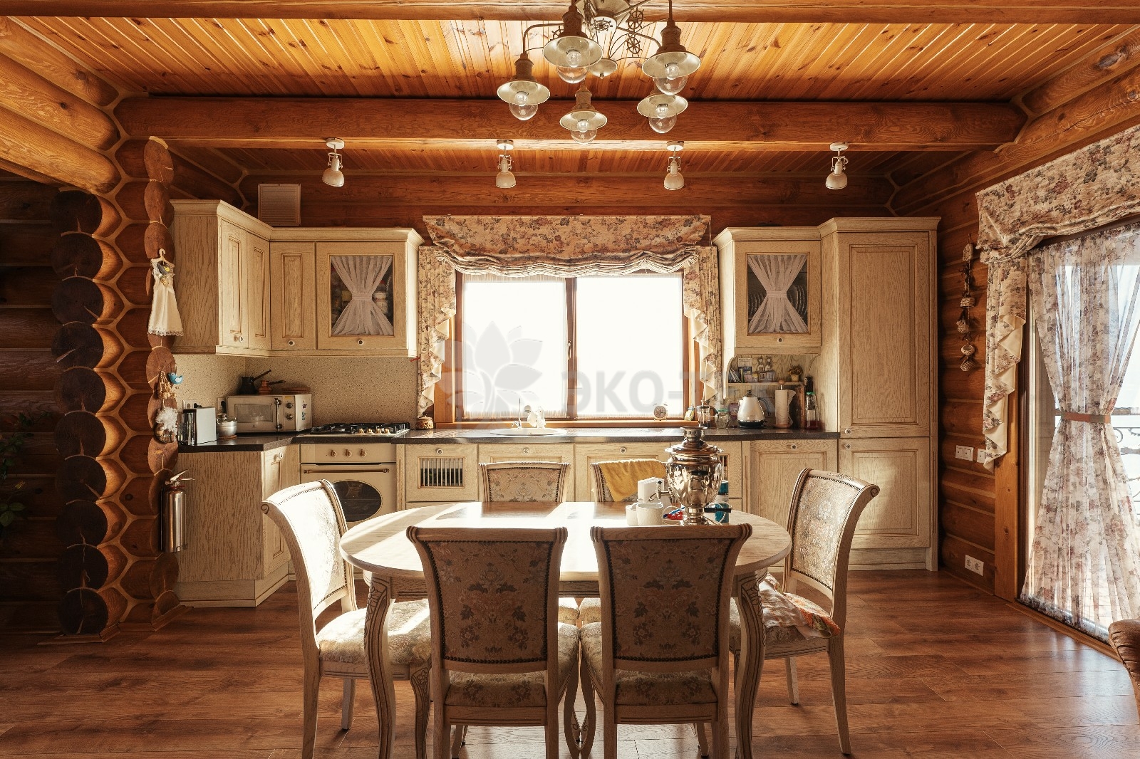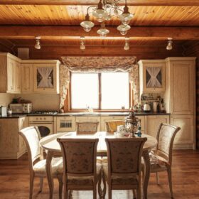 Отделка кухонно – столовой зоны в деревянном коттедже.
