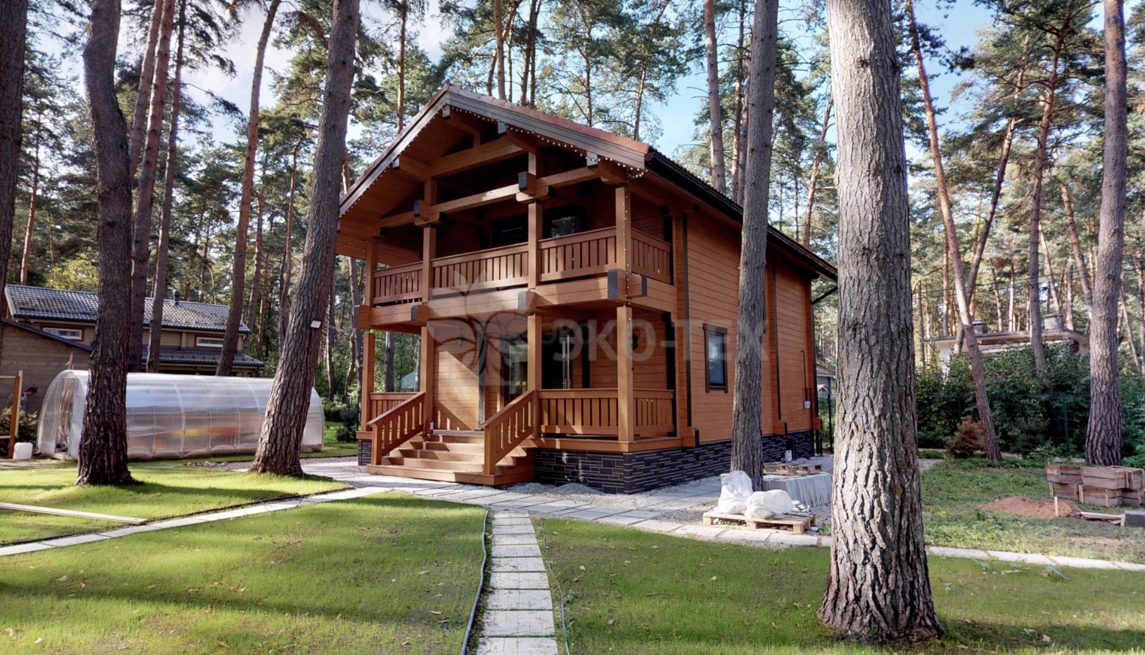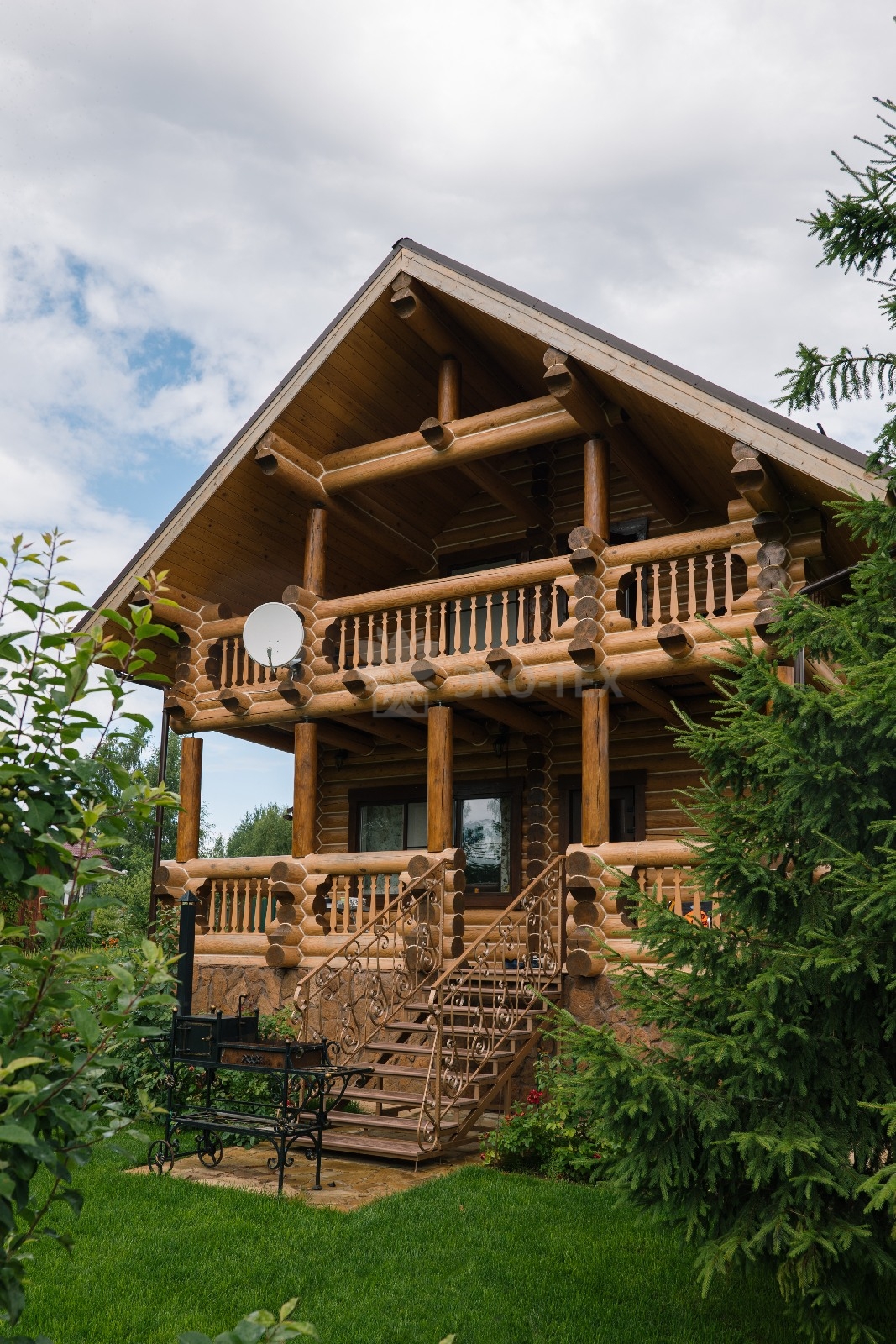 Двухэтажный дом с террасой и мансардой, материал оцилиндрованное бревно
