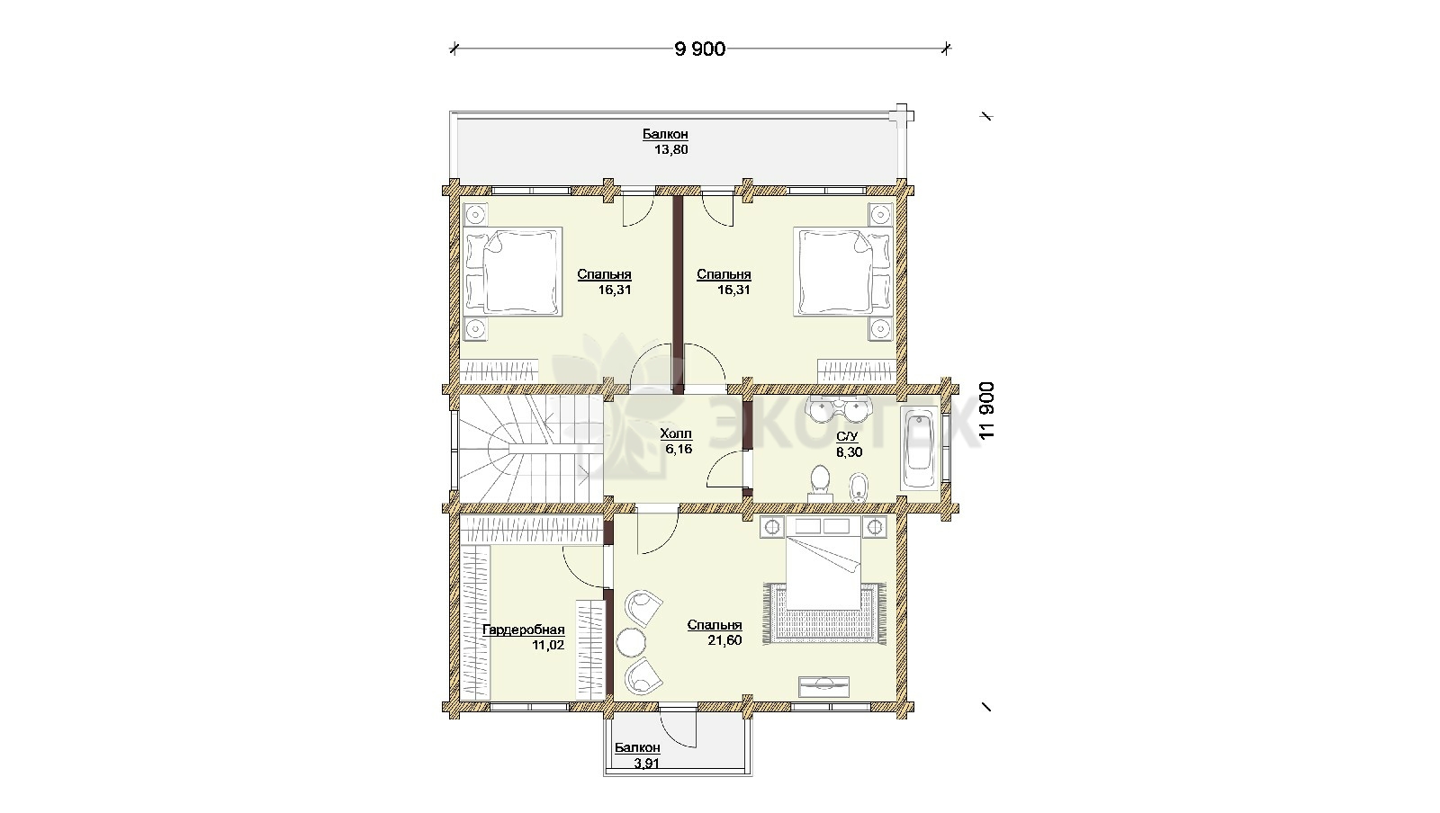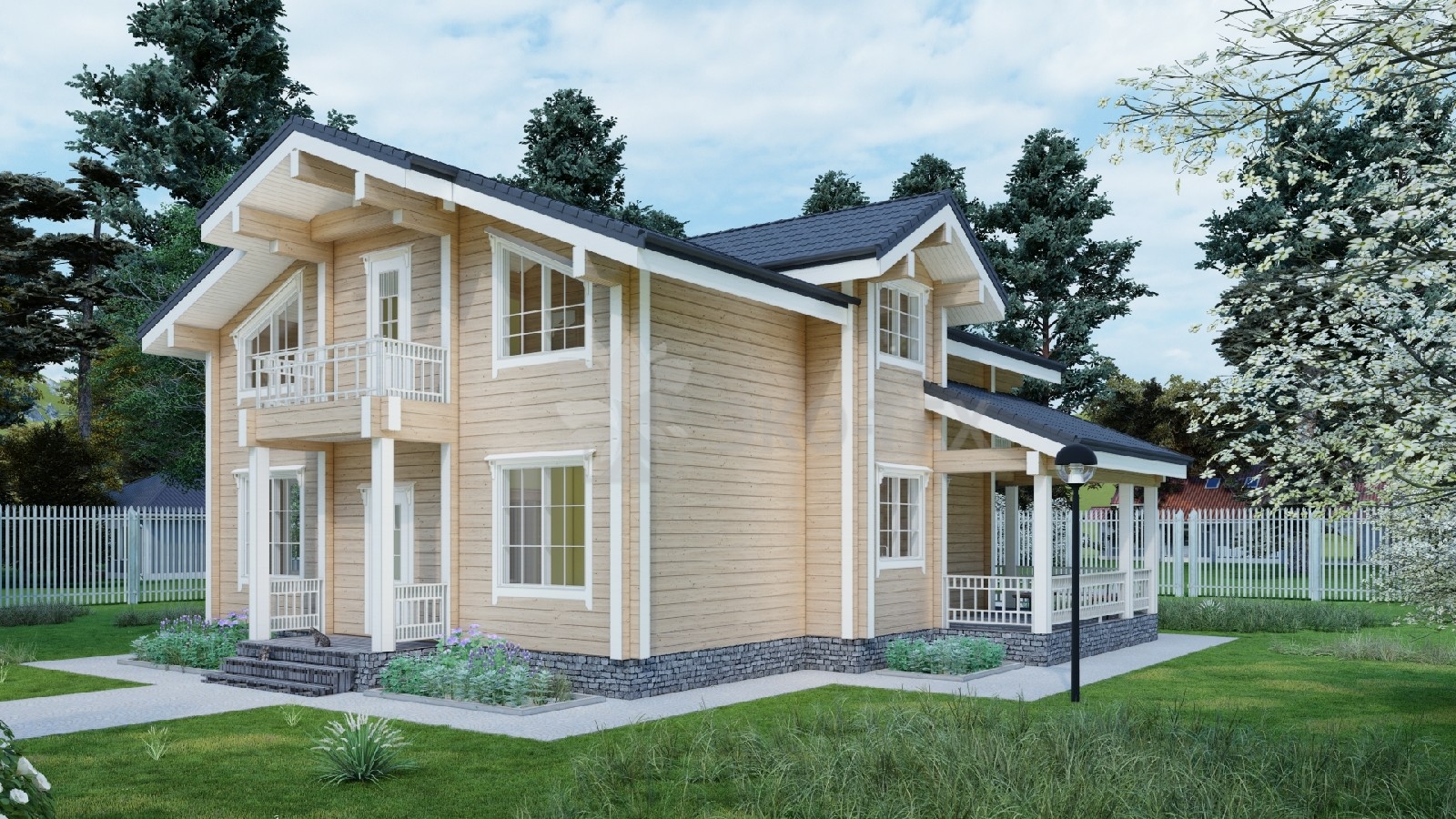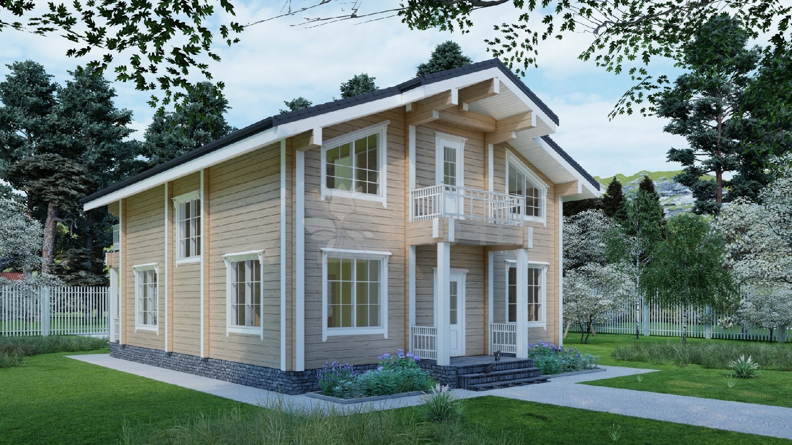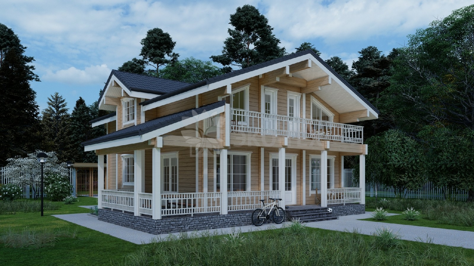 Дом с террасой и двумя балконами,материал клееный брус