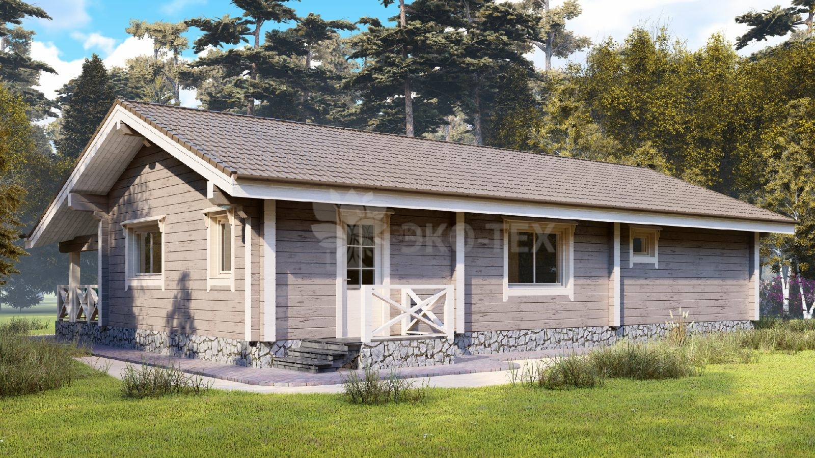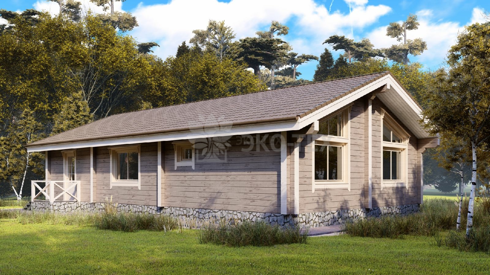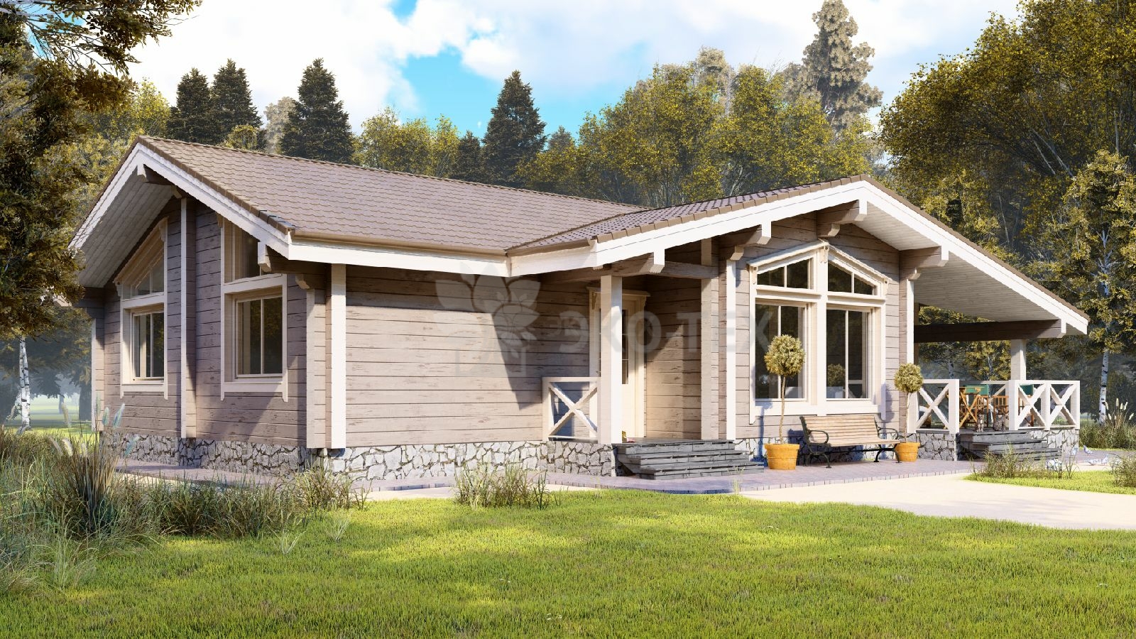 Одноэтажный дом с большой террасой и гостиной, материал клееный брус