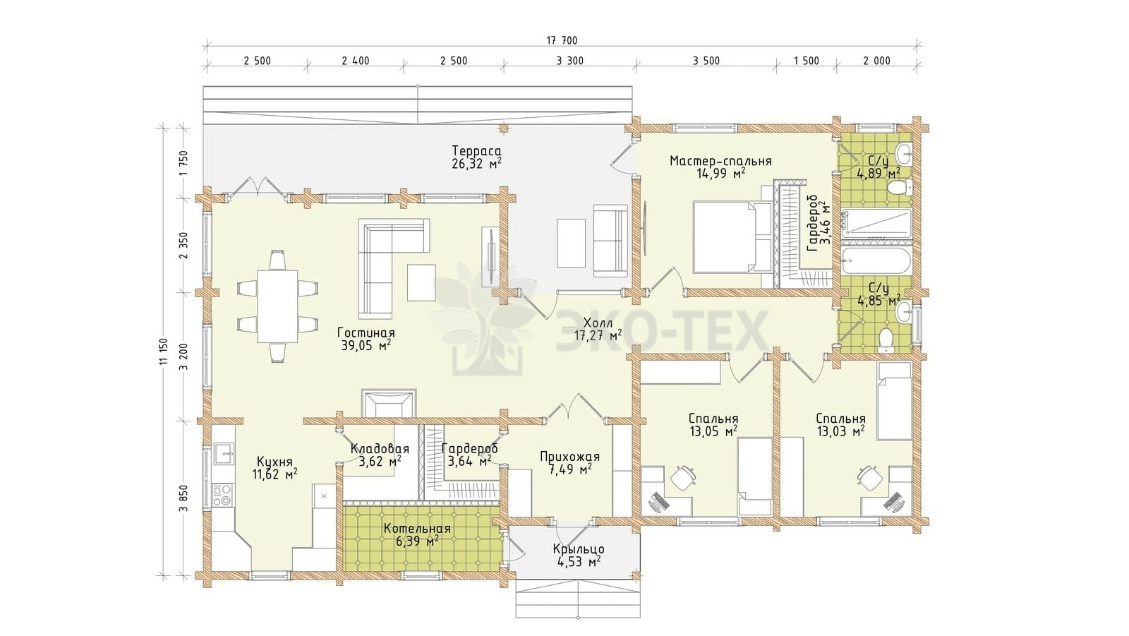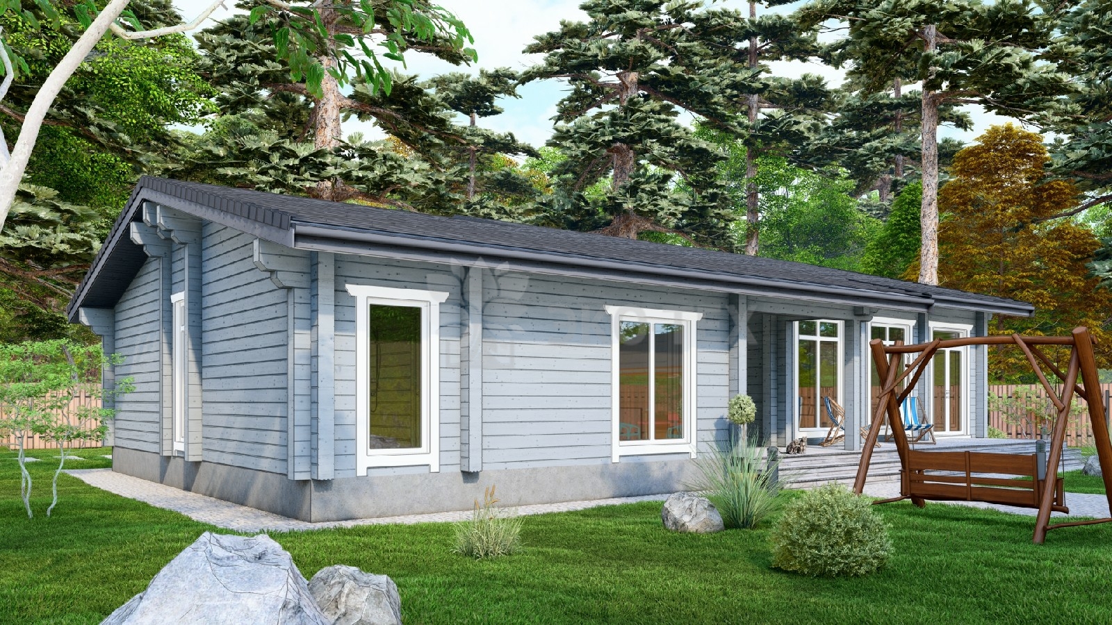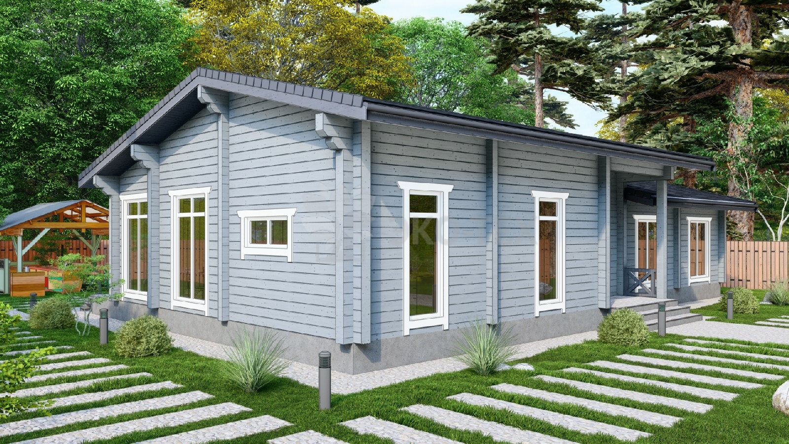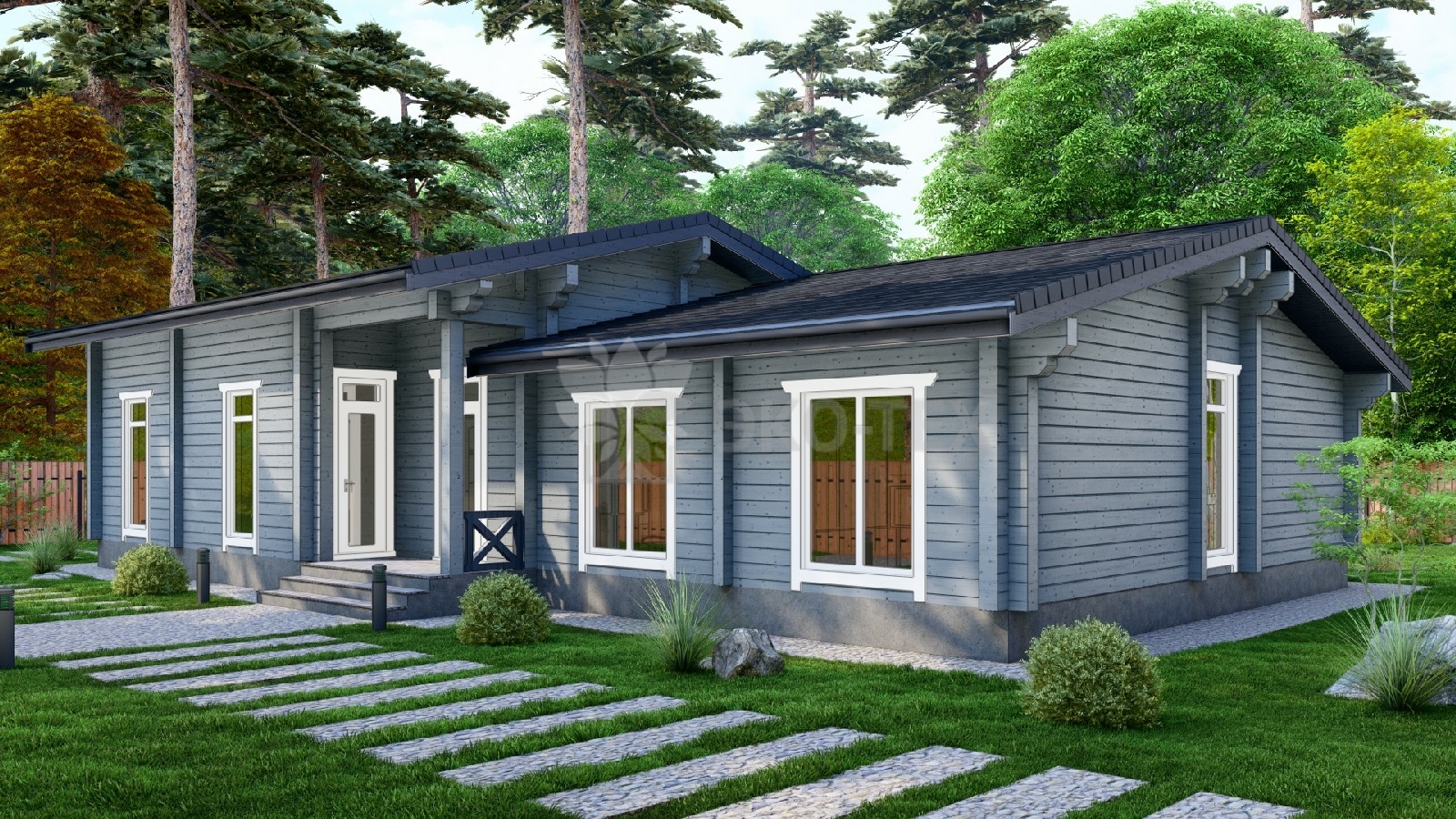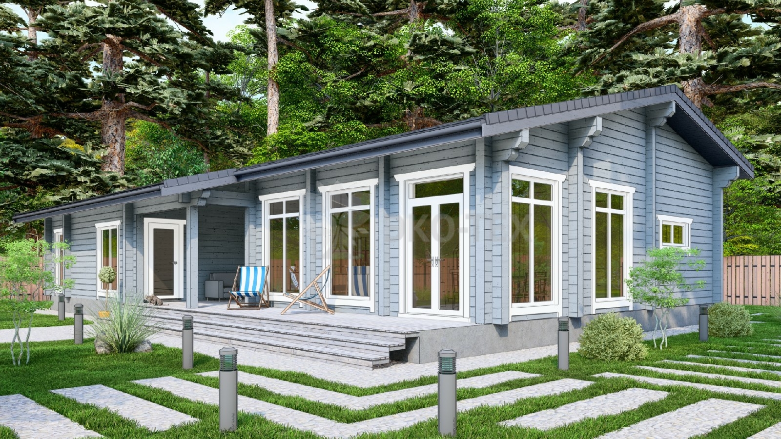 Одноэтажный дом с террасой, гостиная, 3 спальни, материал клееный брус