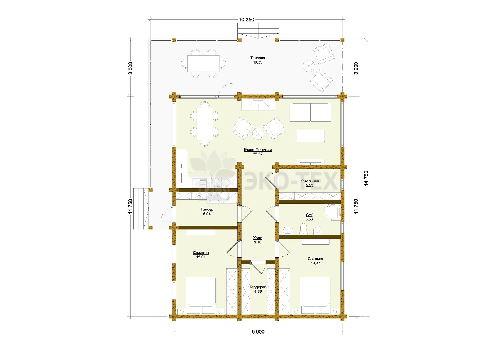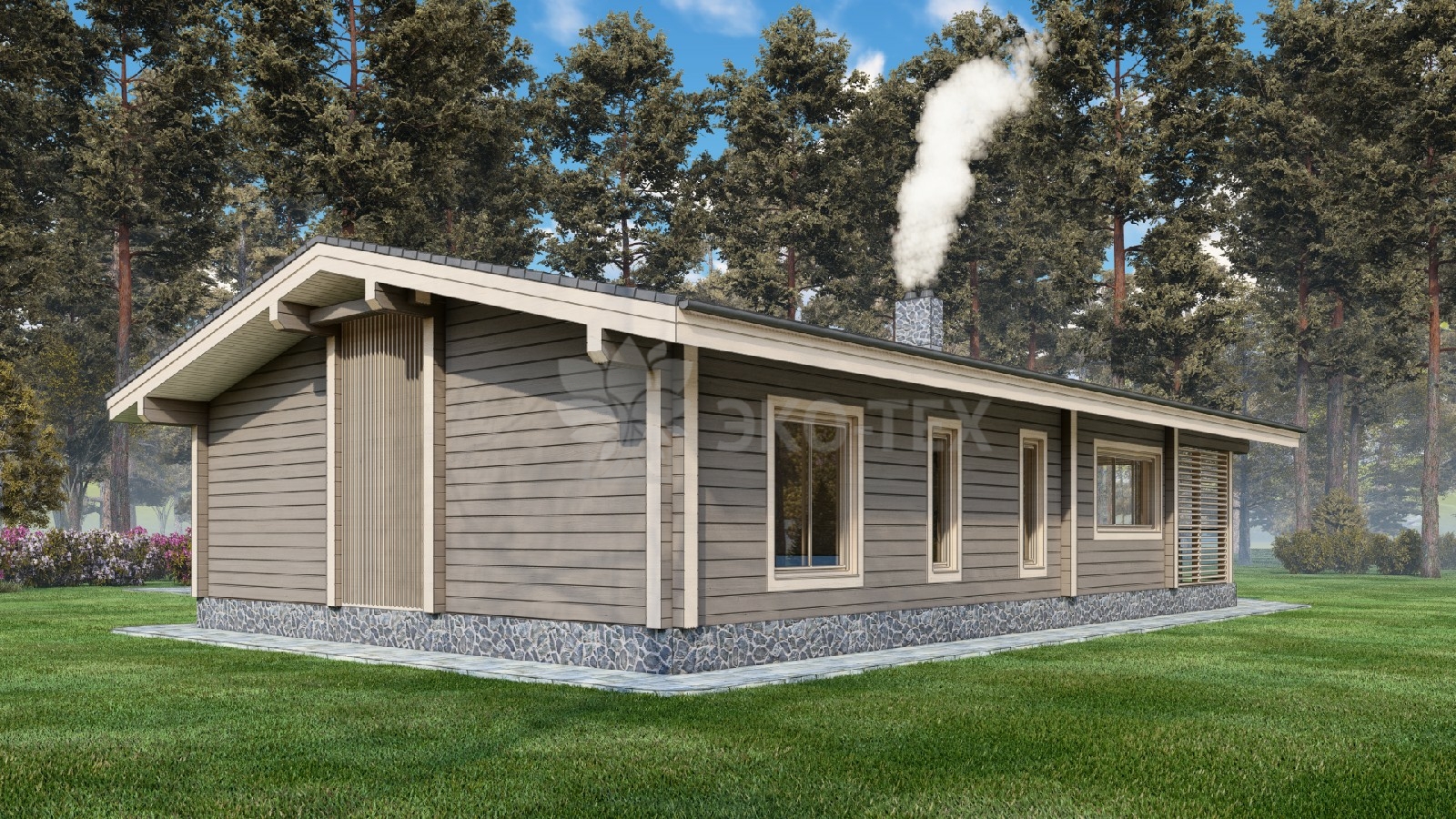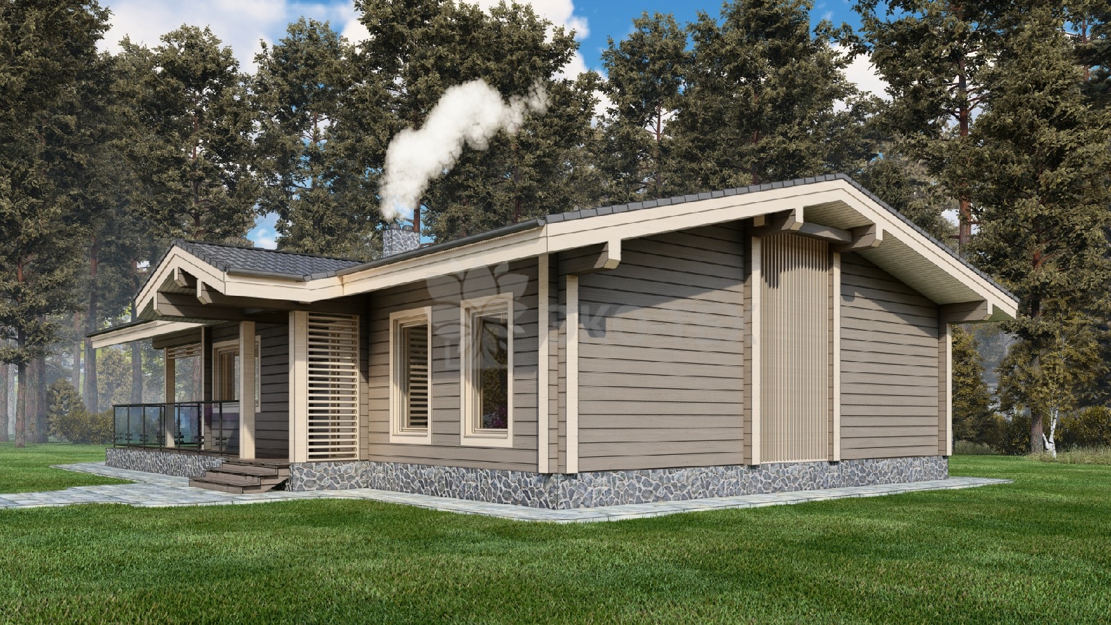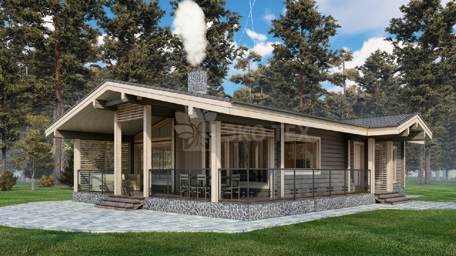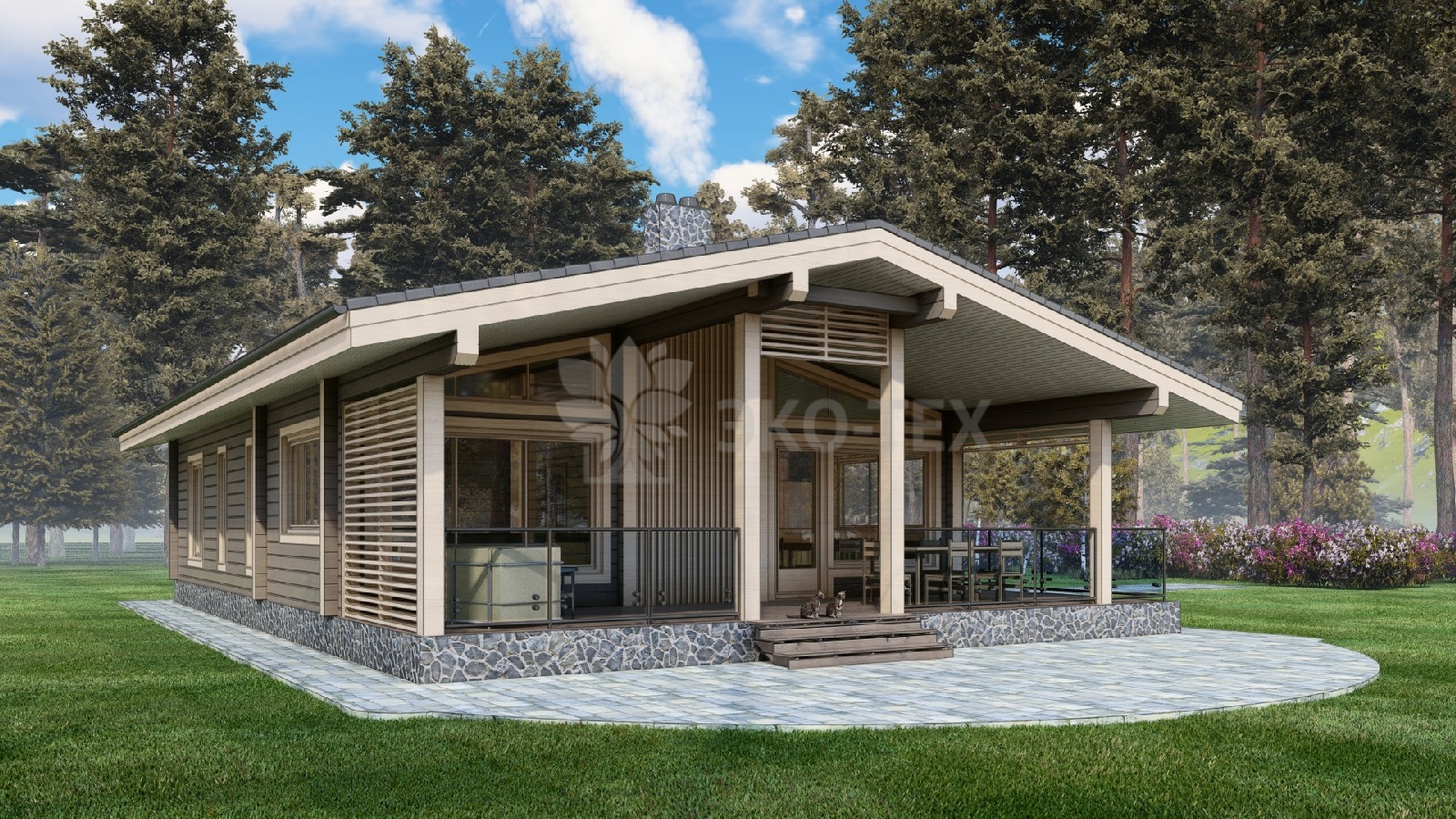 Одноэтажный дом с большой террасой и гостиной, материал клееный брус