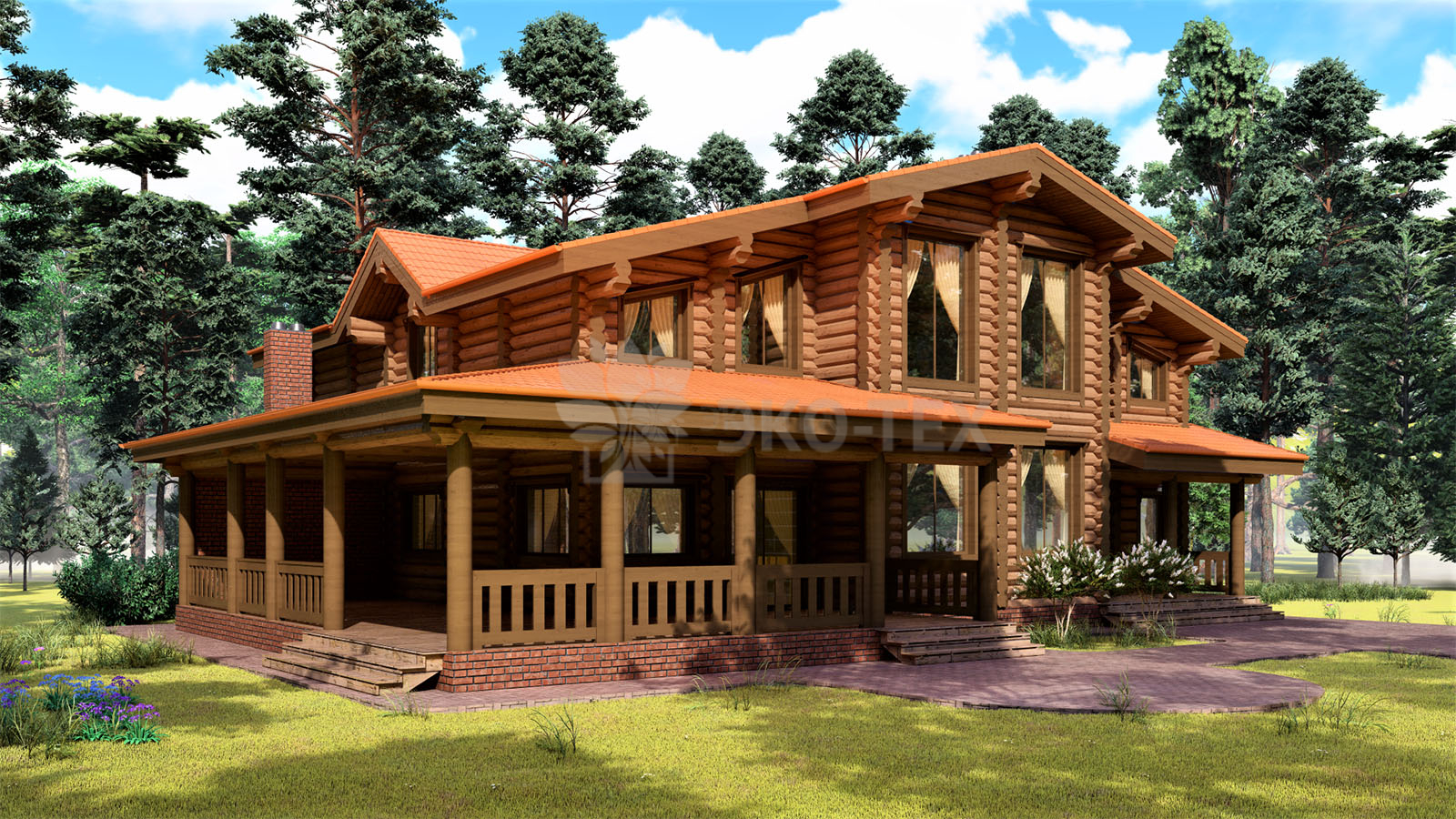 Величественный загородный дом с большой террасой.