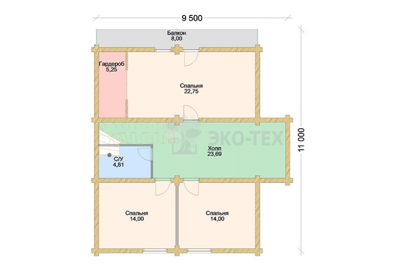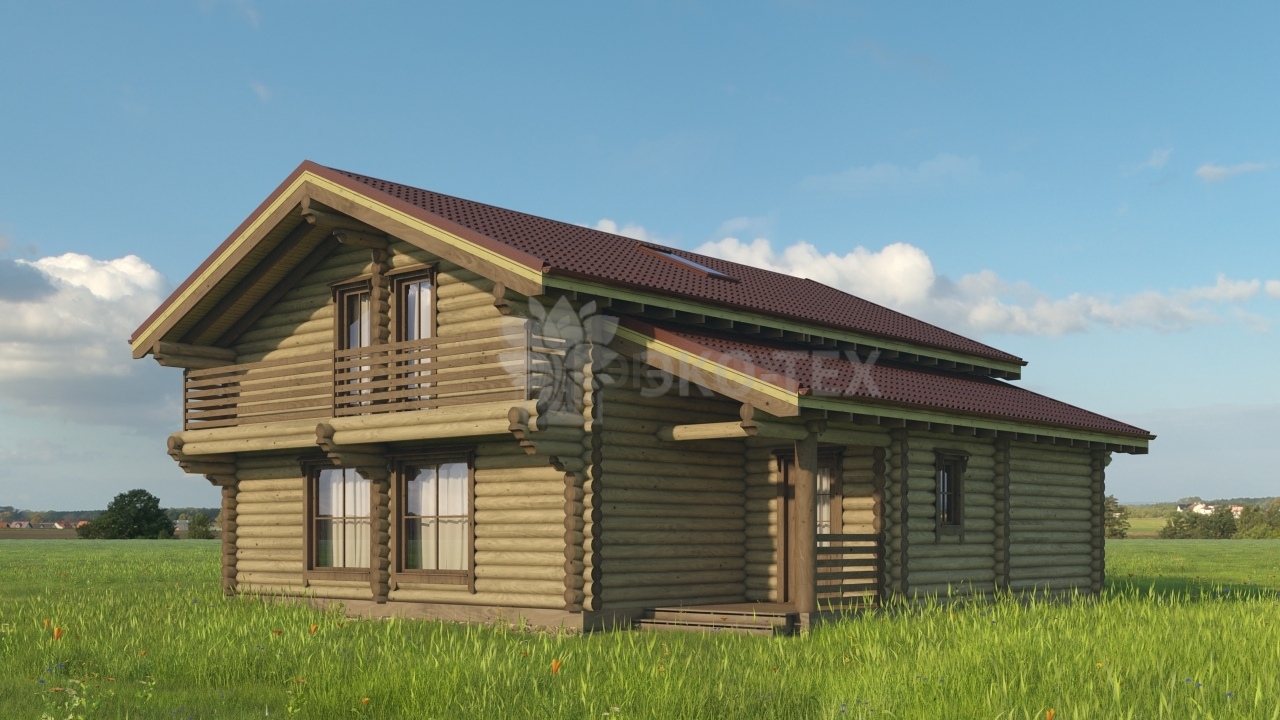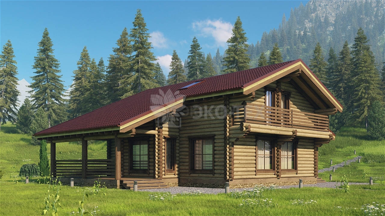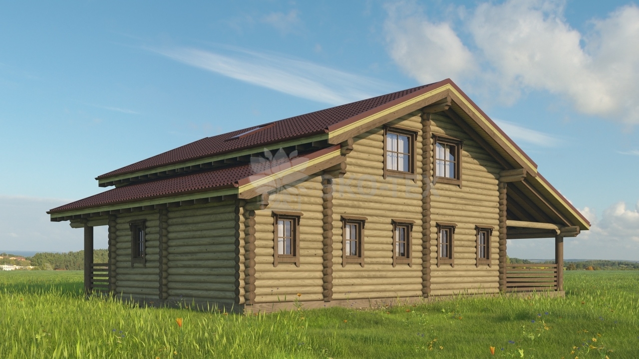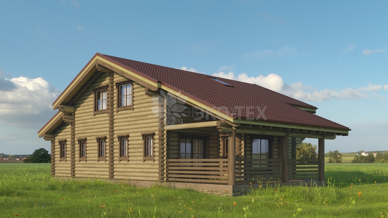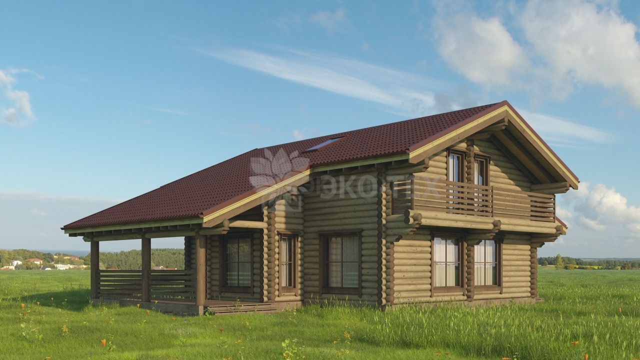 Двухэтажный дом из бревна, в проекте 4 спальни, большая терраса.