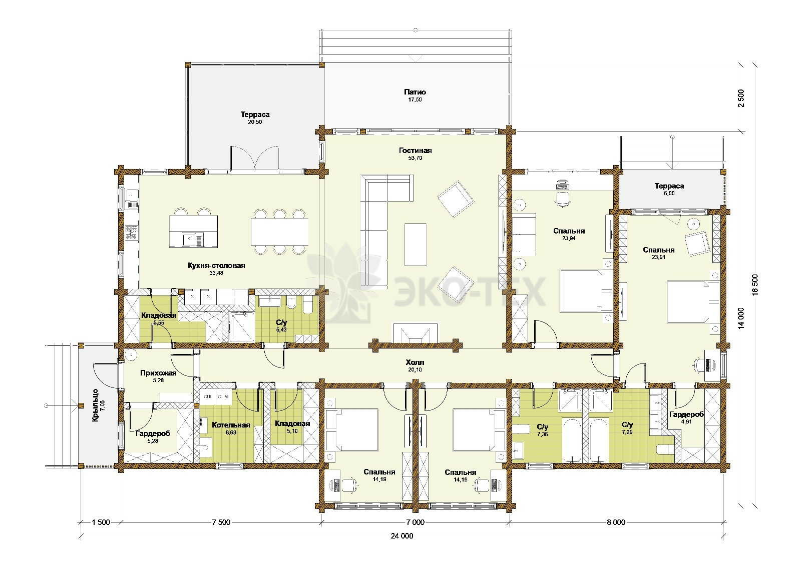 Большой одноэтажный дом с патио, 4 спальни