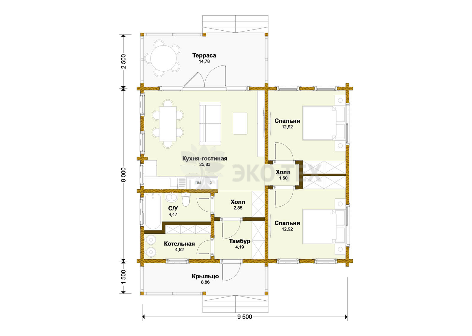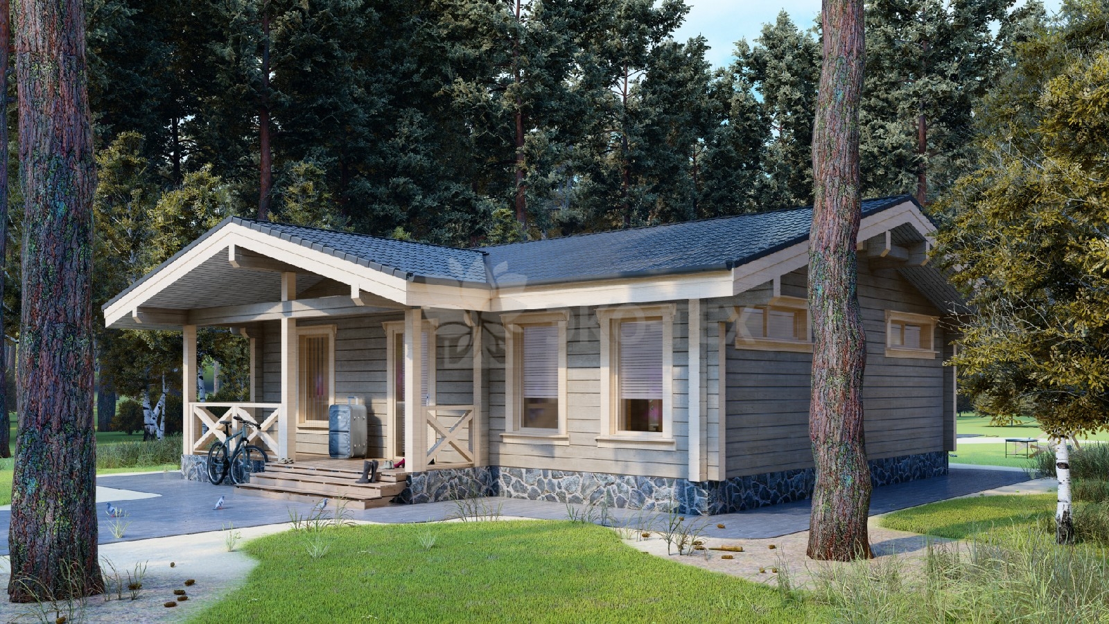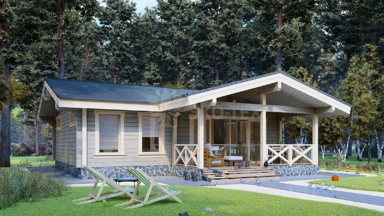 Проект уютного одноэтажного дома для отдыха с террасой, материал клеенный брус