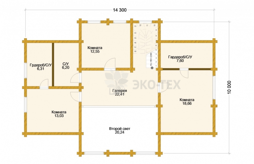 Проконсультироваться по проектуНа второй этаж дома ведёт удобная лестница. Здесь расположены три комнаты разной площади. Второй этаж представляет собой собственное приватное жилое пространство: в комнатах имеются собственные гардеробные, на этаже отдельный санузел. Подобное архитектурное решение удобно и обеспечивает полную независимость и свободу жителям каждого этажа. Все помещения объединяет общая галерея, с внутренним балконом, вид с которого открывается на гостиную.