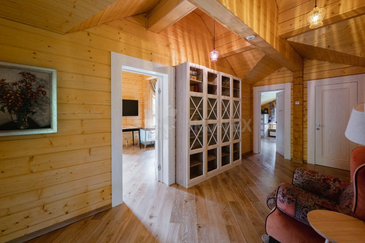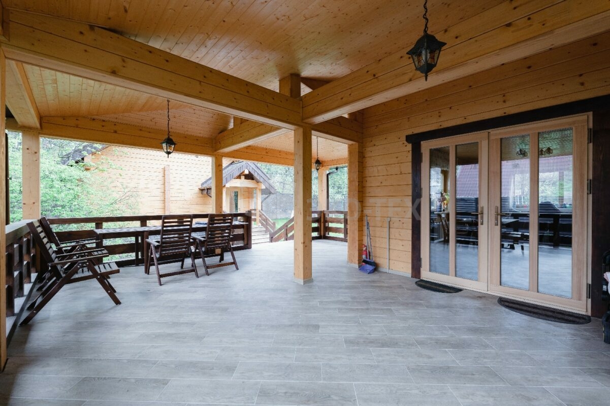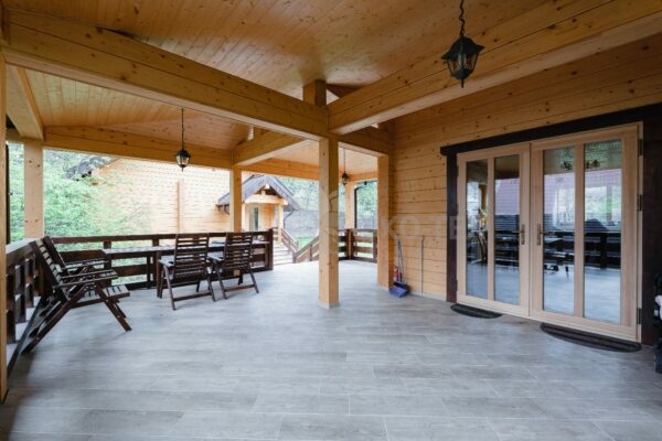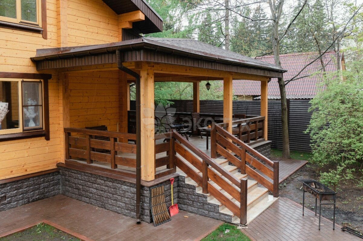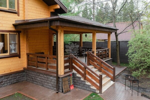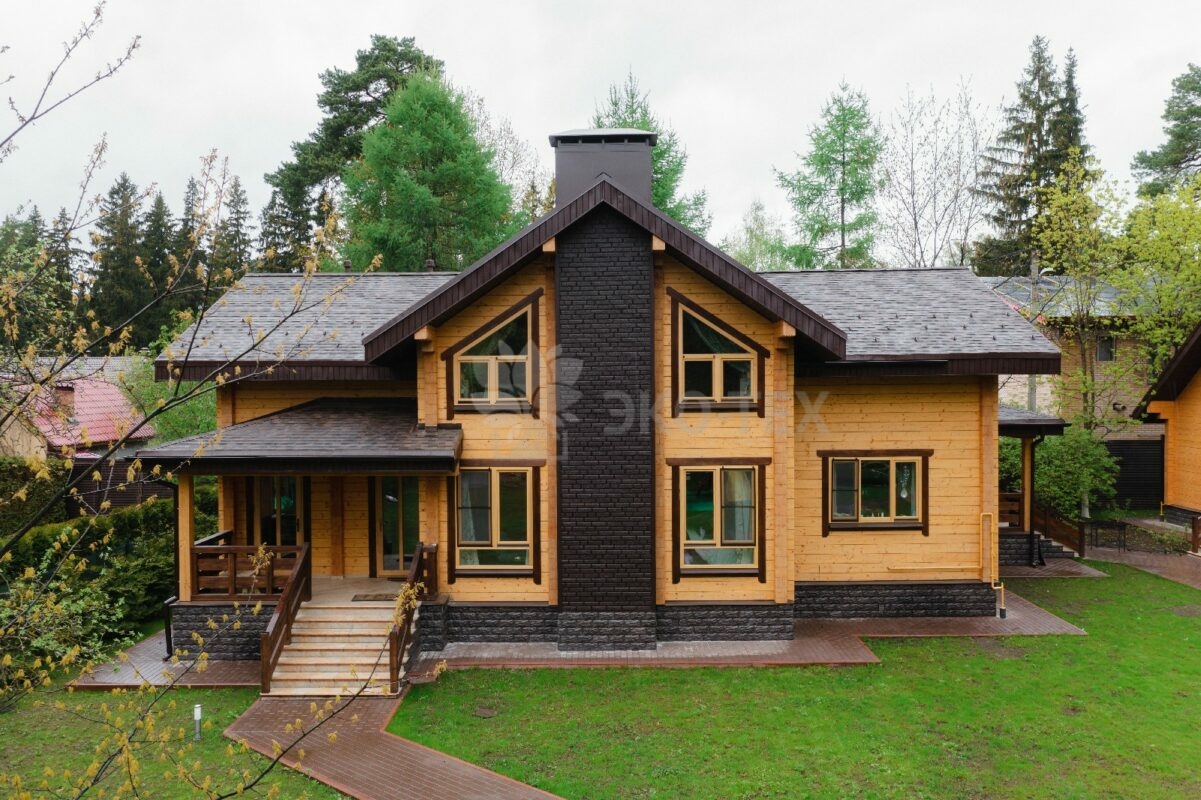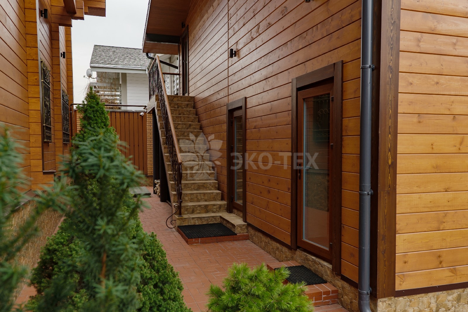 С первого же взгляда приходит понимание, что перед вами настоящий красавец — идеально ровные поверхности стен, образованные клеёным брусом, подчёркнуты большими красивыми окнами необычной формы. Невысокие и удобные ступени ведут на широкую террасу, которая открывает для владельца дома возможности проведения здесь в тёплое время, незабываемых душевных встреч. Красивые шоколадные оттенки отделочных материалов прекрасно сочетаются с цветом живого дерева, дом прекрасно вписывается в окружающую природу.
