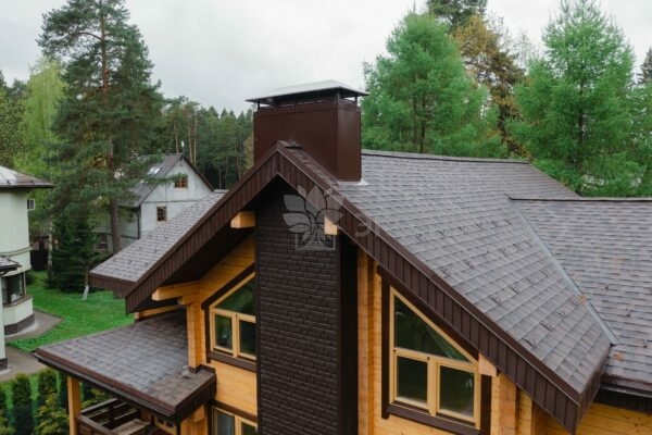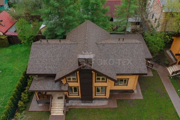 Второй этаж особняка имеет переменную этажность — высота потолков изменяется от двух до четырёх метров, крыша имеет сложный профиль. Кровельный материал, используемый нами для возведения кровли, обеспечивает прекрасную звукоизоляцию и защиту дома.