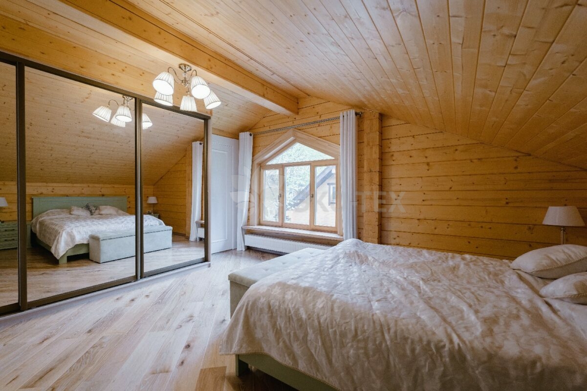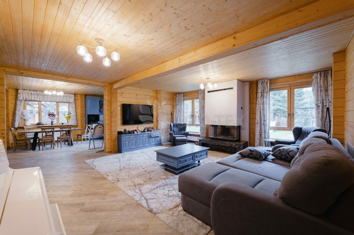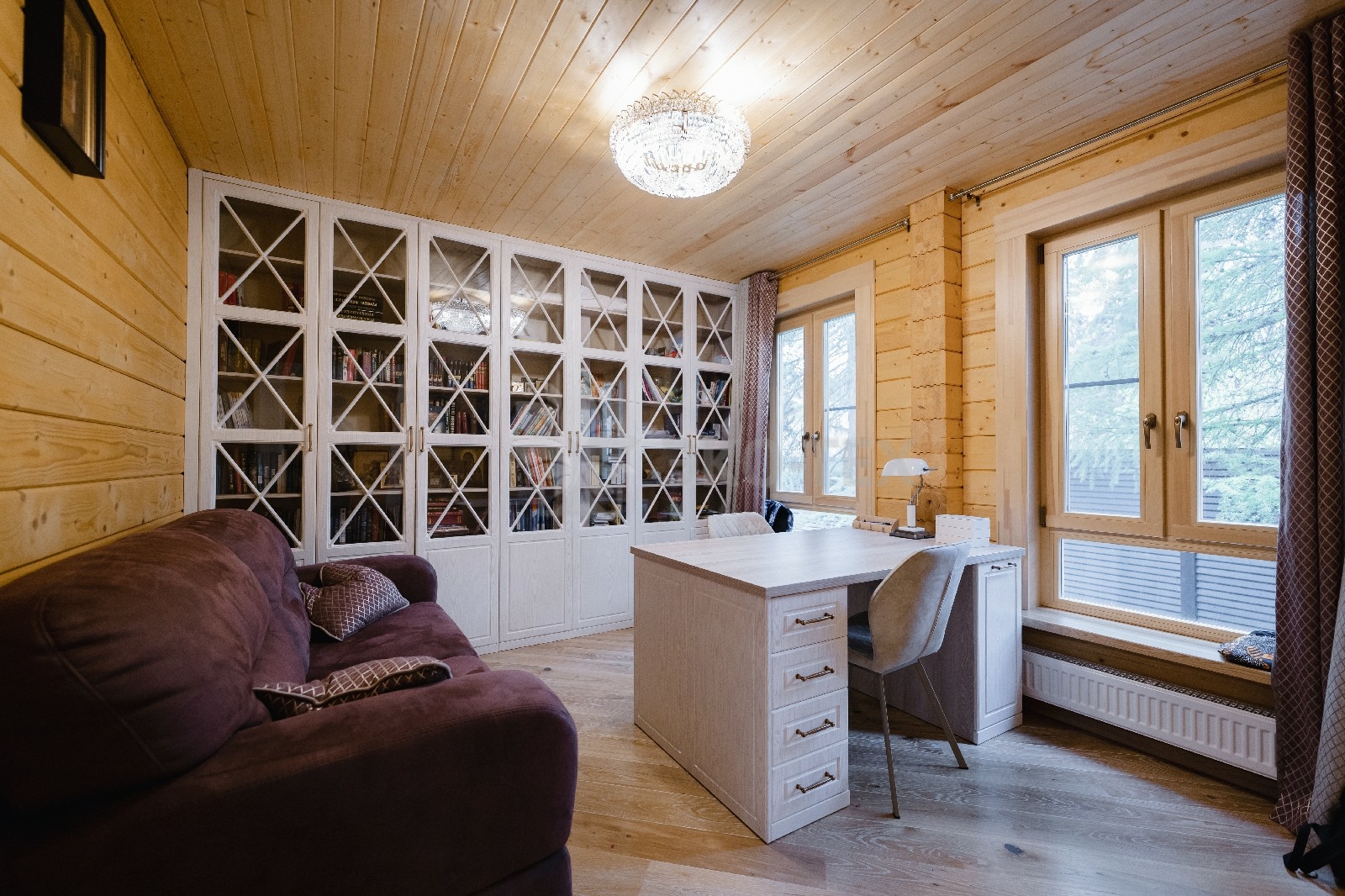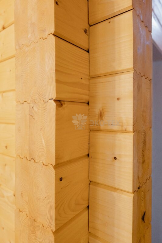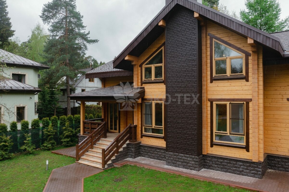 Особняк выполнен клеёного бруса, который является на данный момент одним из наиболее востребованных строительных материалов. Его популярность объясняется способностью идеально удерживать геометрическую форму и, практически, полным отсутствием деформации. Это качество делает постройку из клеёного бруса неподверженной усадке,долговечной и прочной. Кроме того, клеёный брус, за счёт особенностей технологии, отличается улучшенной тепло — и звукоизоляцией.
