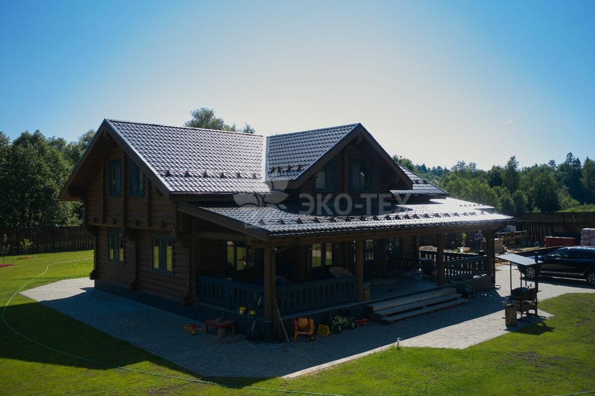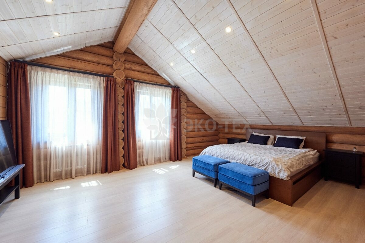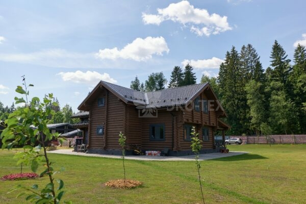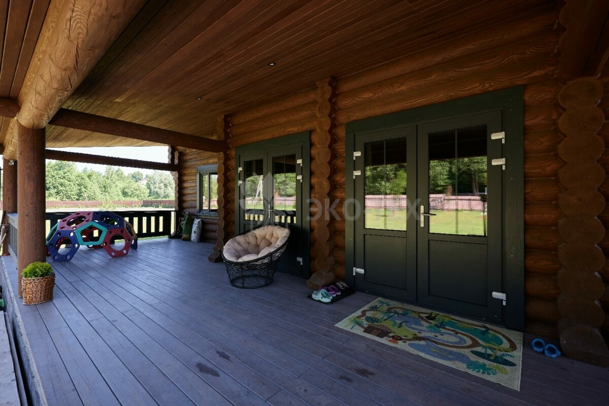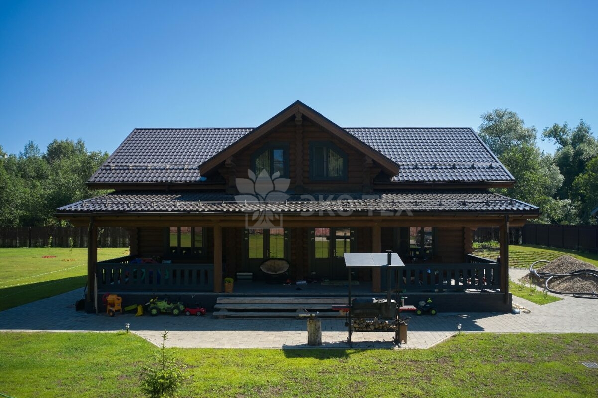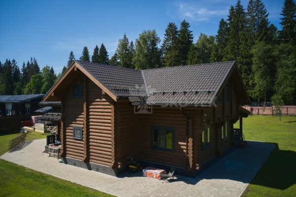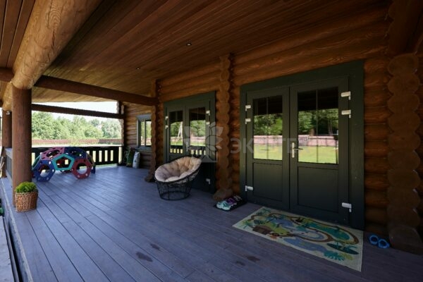 Величественный фасад украшен огромными окнами, а технология второй свет — всегда признак богатства и роскоши владельца. Красивый естественный рисунок живого дерева, из которого выполнен дом, идеально вписывается в любой окружающий ландшафт. Большая просторная терраса является естественным продолжением дома и в тёплое время года позволяет проводить досуг на открытом воздухе. .