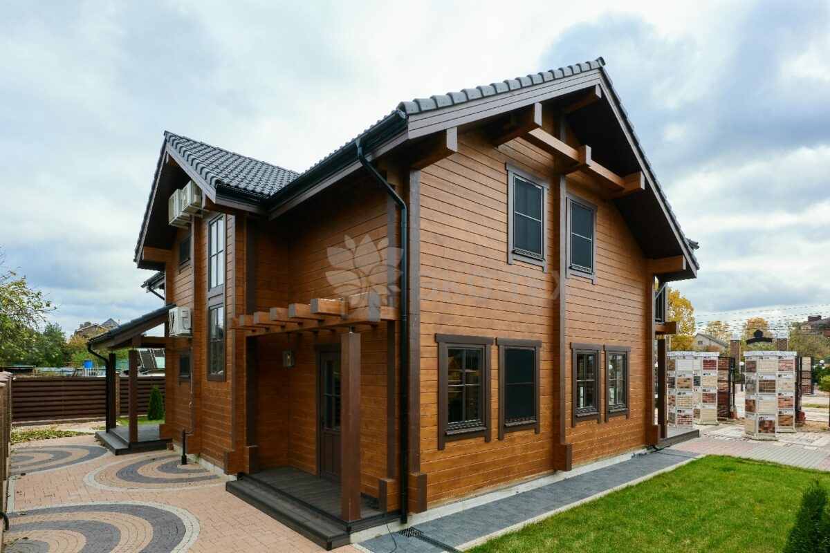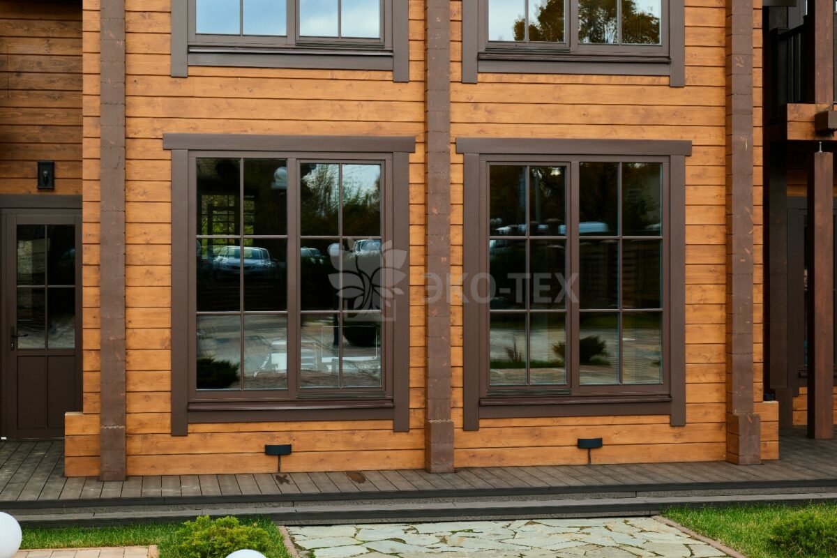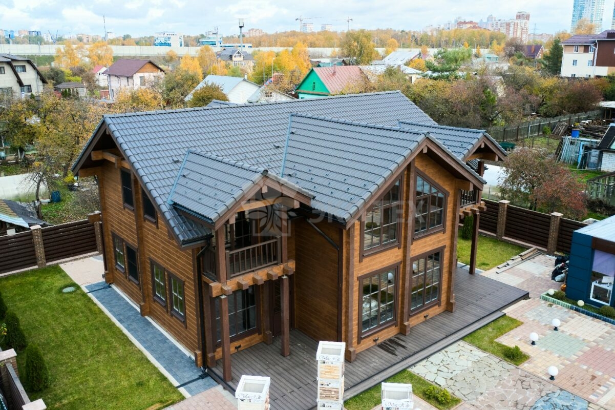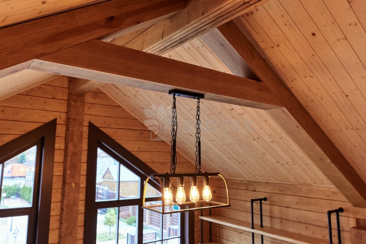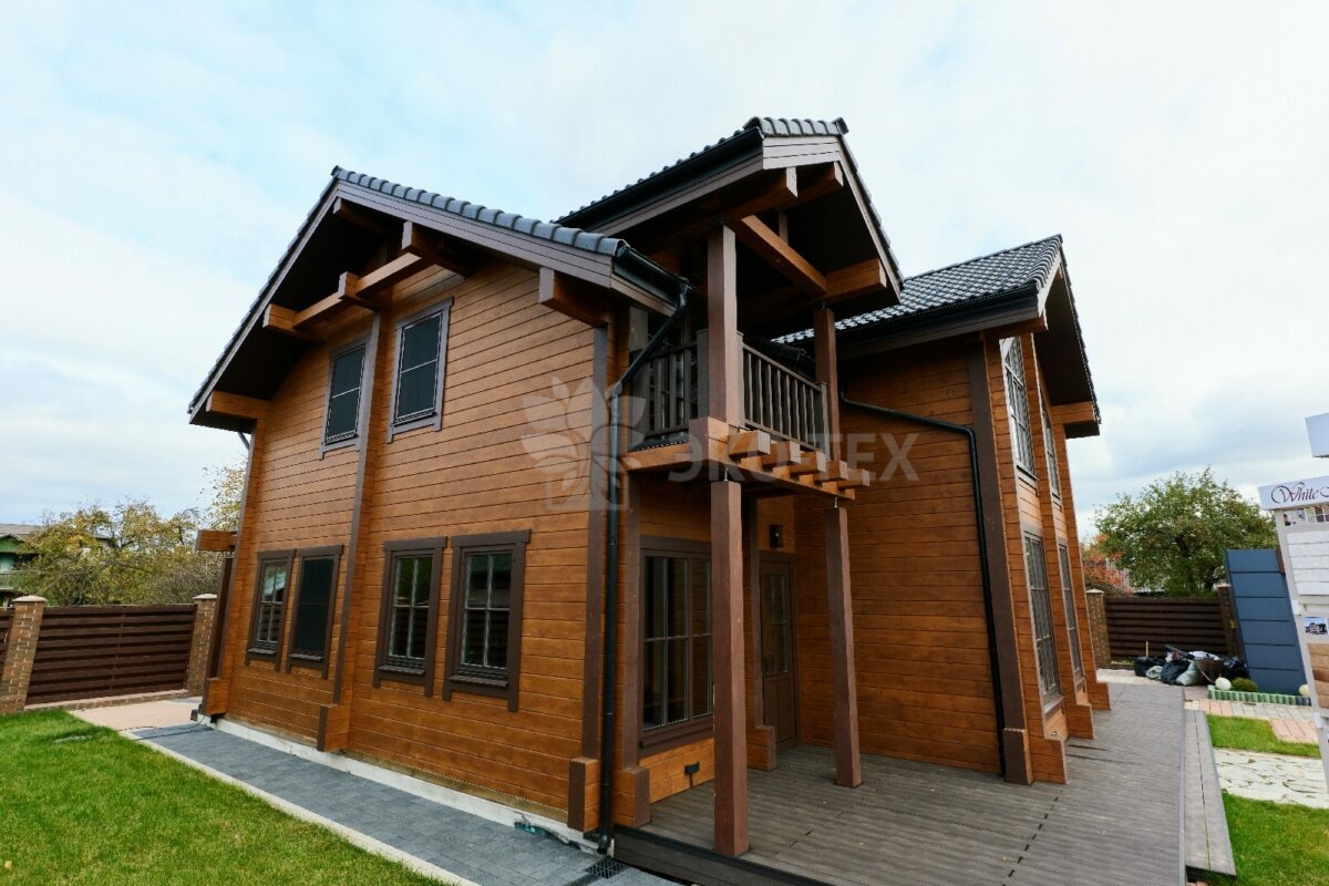 Дом построен из современного строительного материала — клеёного бруса. Он имеет ряд преимуществ перед другими строительными материалами из дерева, к ним относятся: повышенная прочность, устойчивость к деформациям и влаге, долговечность и самое главное – отсутствие усадки конструкции.