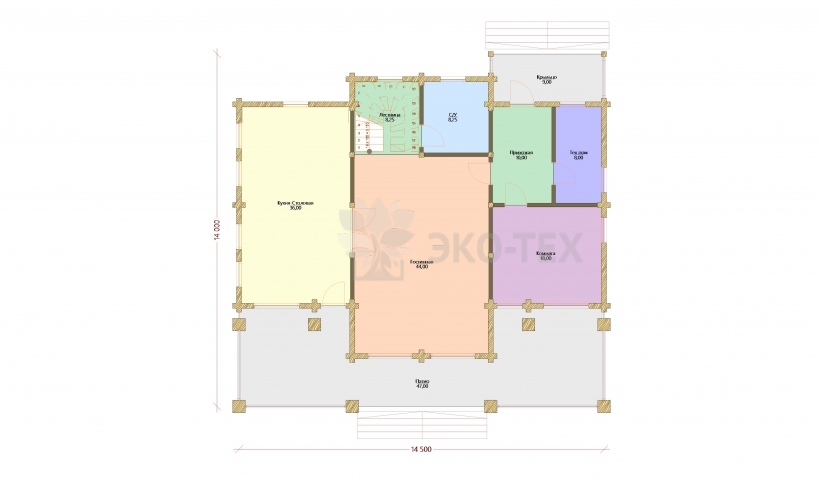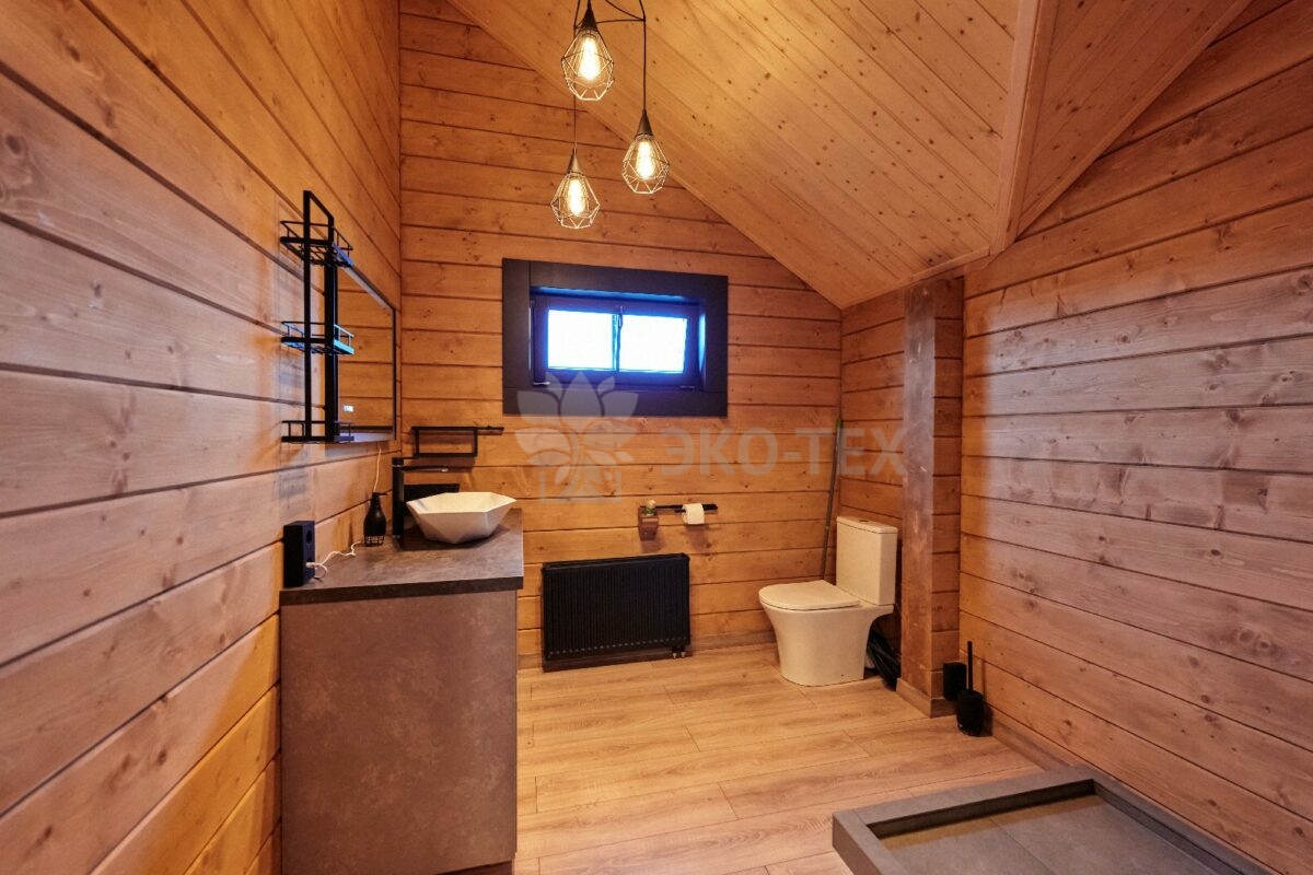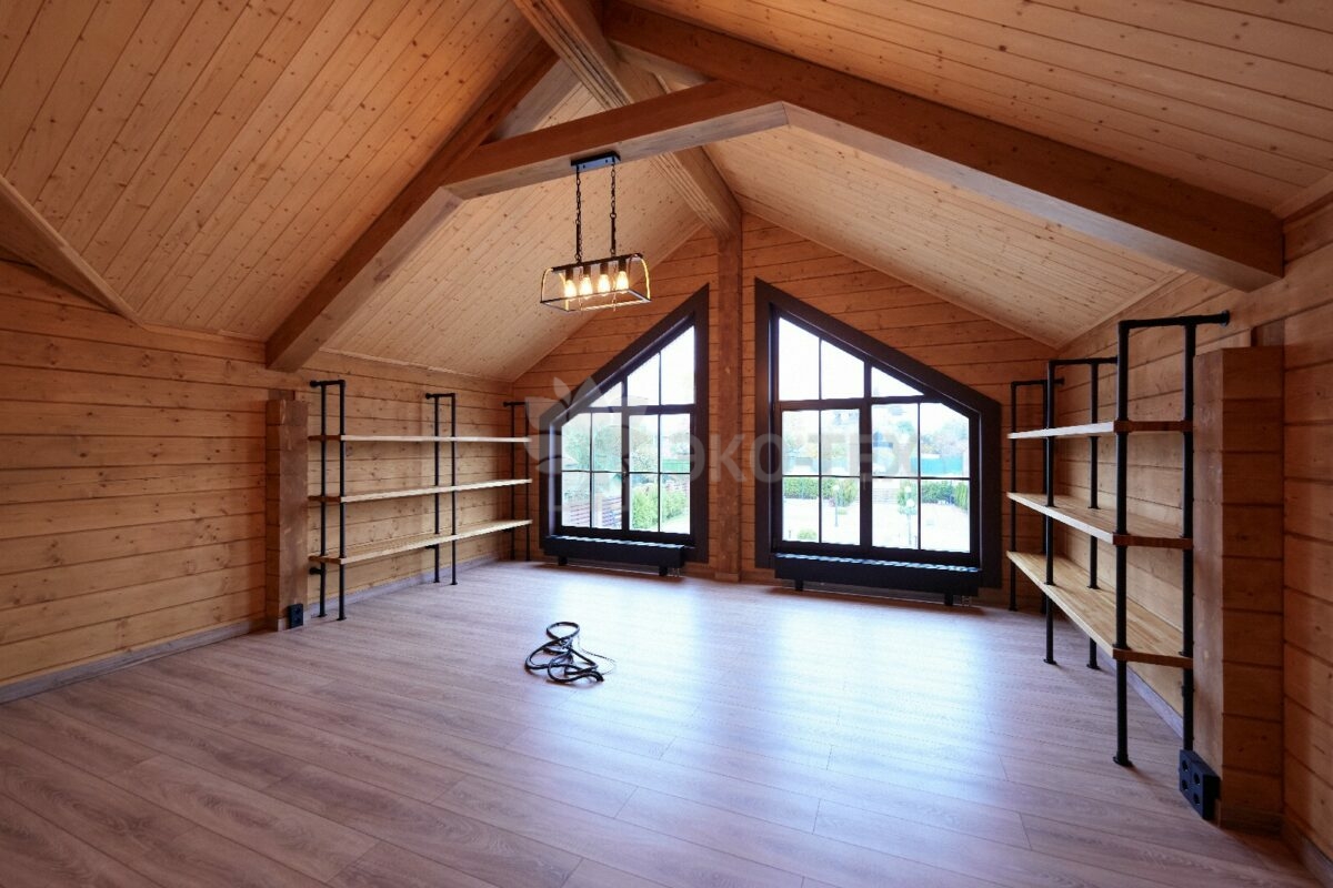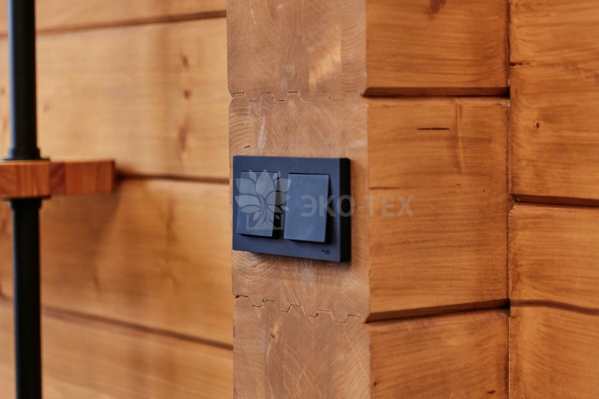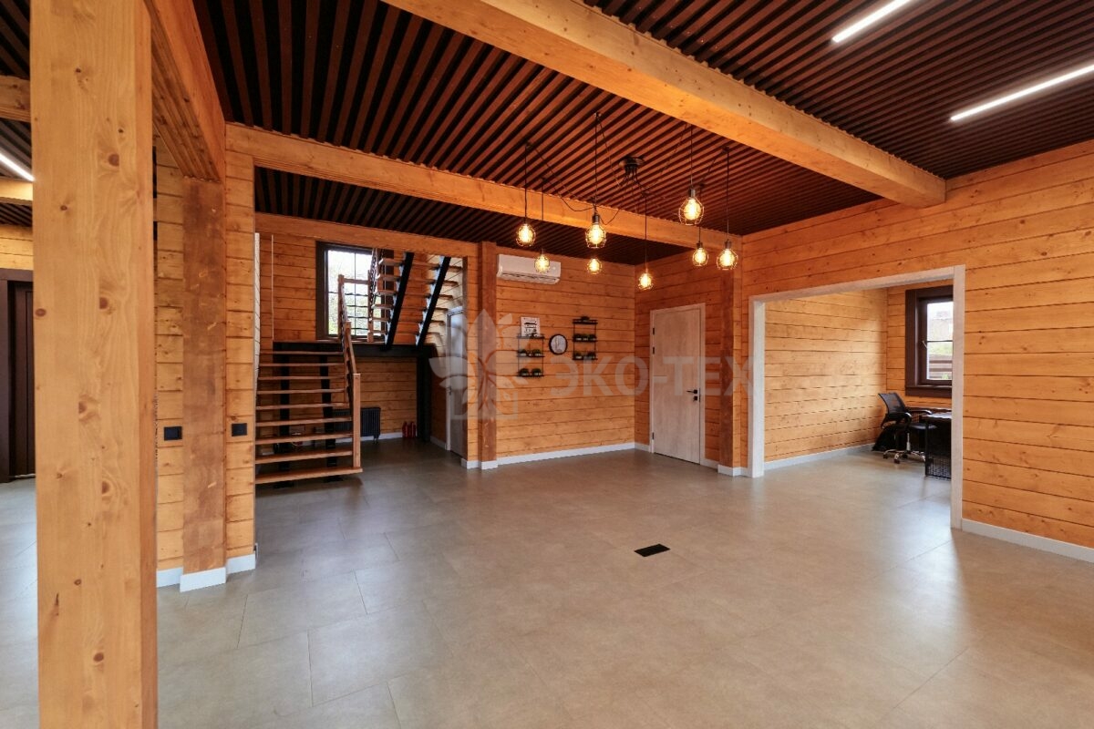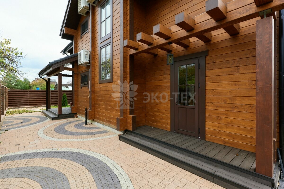 Дом построен из современного строительного материала — клеёного бруса. Он имеет ряд преимуществ перед другими строительными материалами из дерева, к ним относятся: повышенная прочность, устойчивость к деформациям и влаге, долговечность и самое главное – отсутствие усадки конструкции.