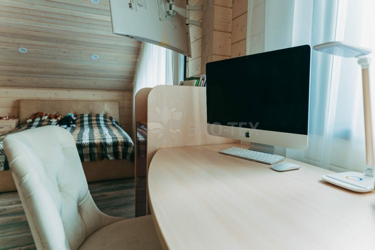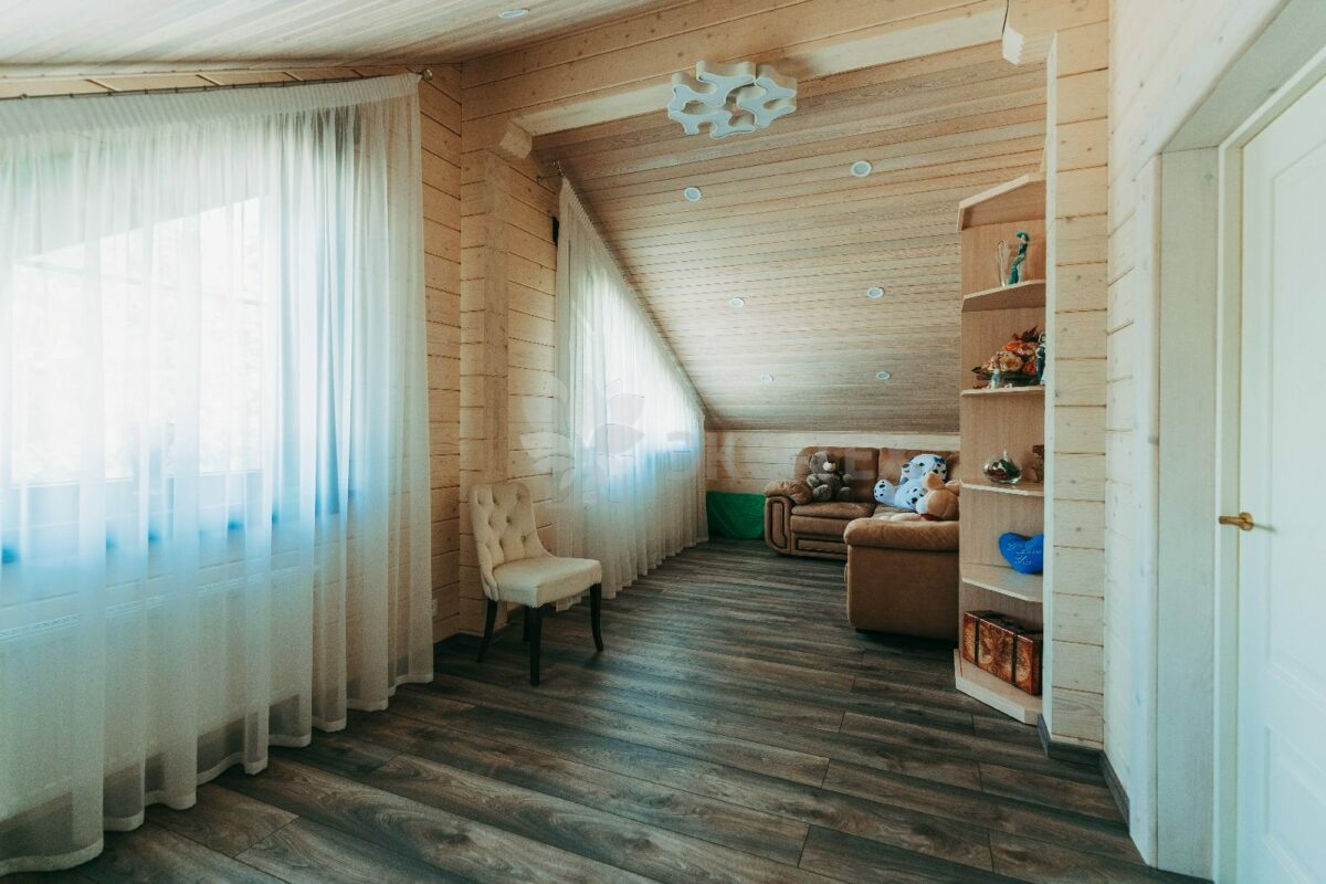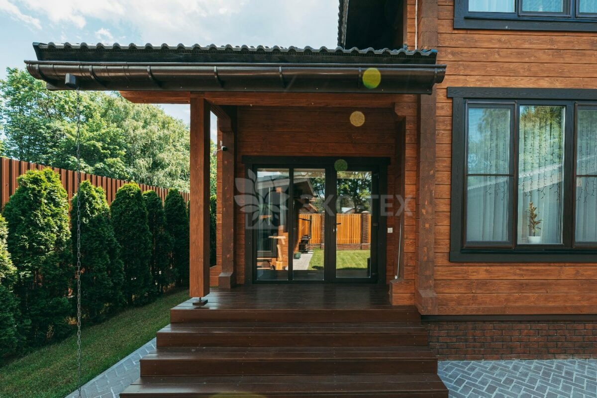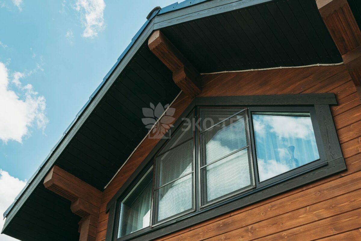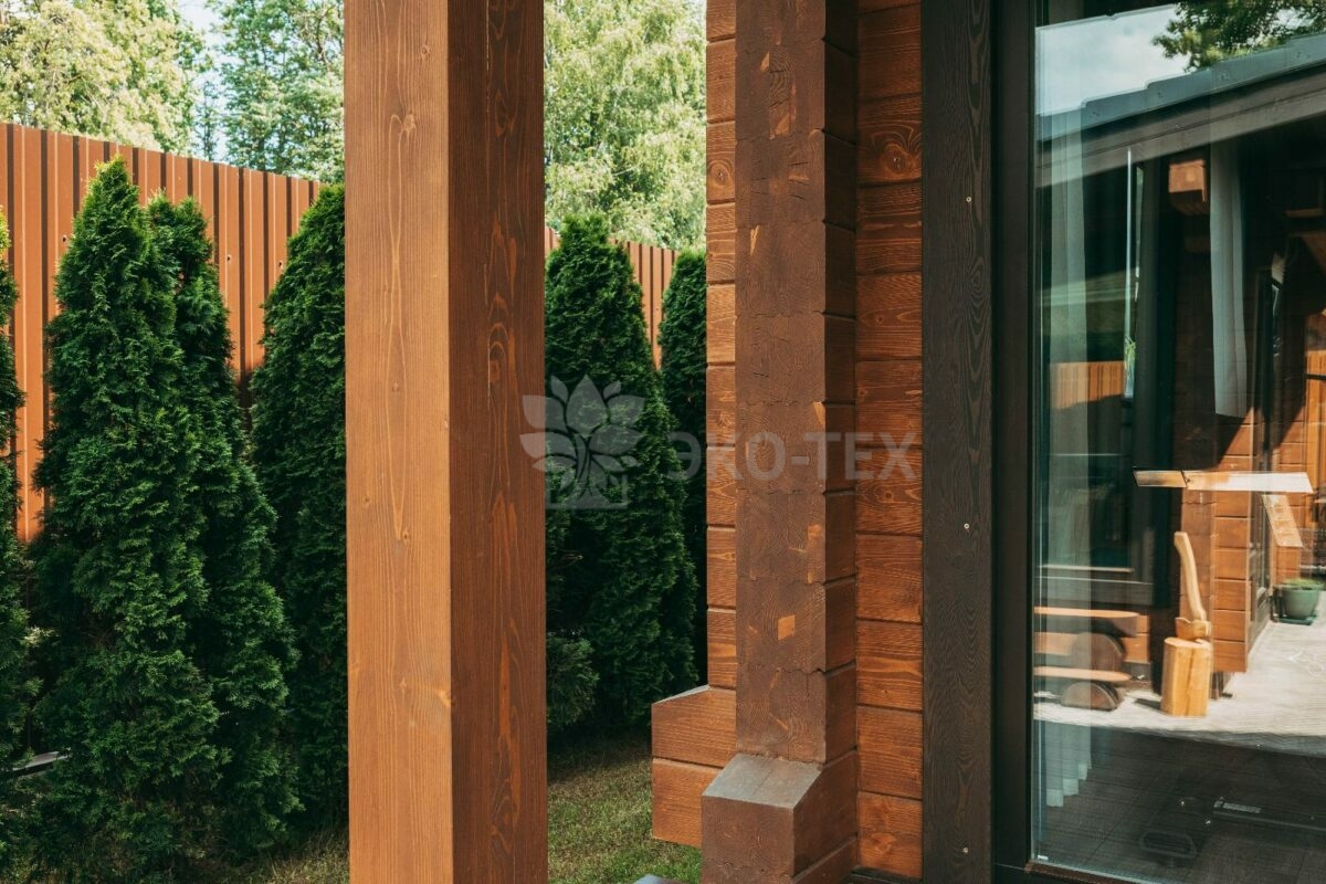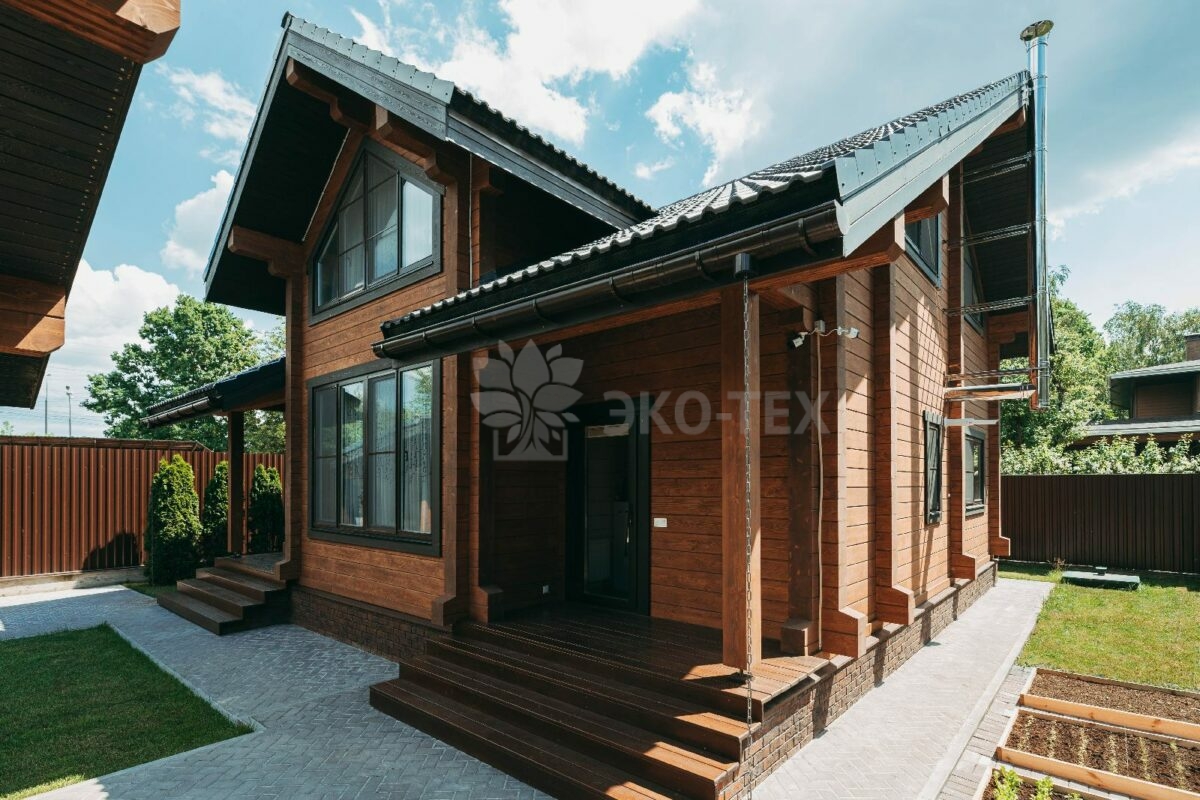 Особняк выполнен из современного и экологичного материала -из клеёного бруса. По сравнению с другими материалами из дерева, клееный брус имеет ряд преимуществ, главным из которых является отсутствие усадки конструкции. Технология производства клеёного бруса обеспечивает высокое качество и прочность материала. Красивый и привлекательный внешний вид позволяет не делать дополнительную отделку как внутри, так и снаружи здания, вид которого отличается естественной природной фактурой.