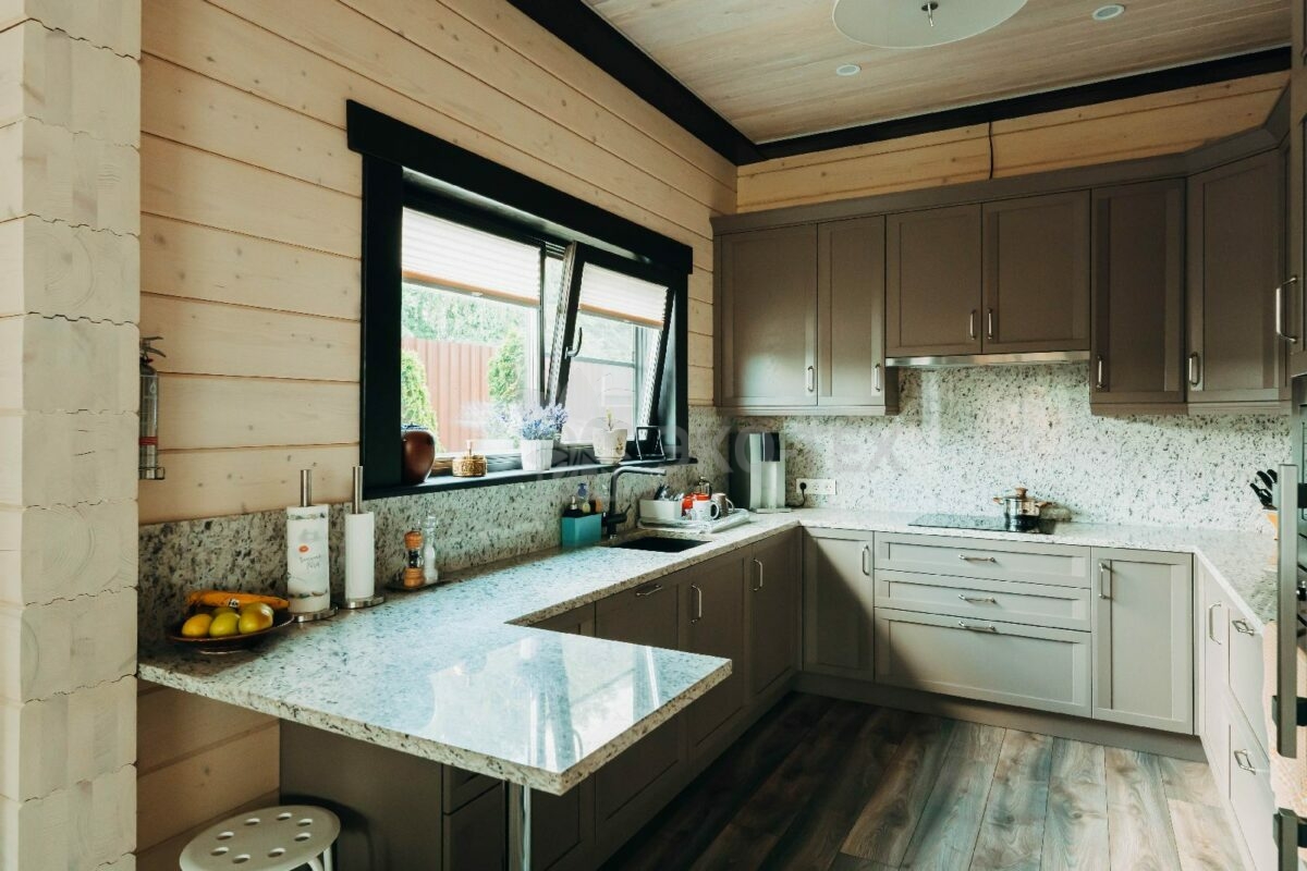 Проконсультироваться по проектуГостиная совмещена с кухней, что позволяет хозяевам даже при приготовлении угощения, поддерживать живое общение с гостями.