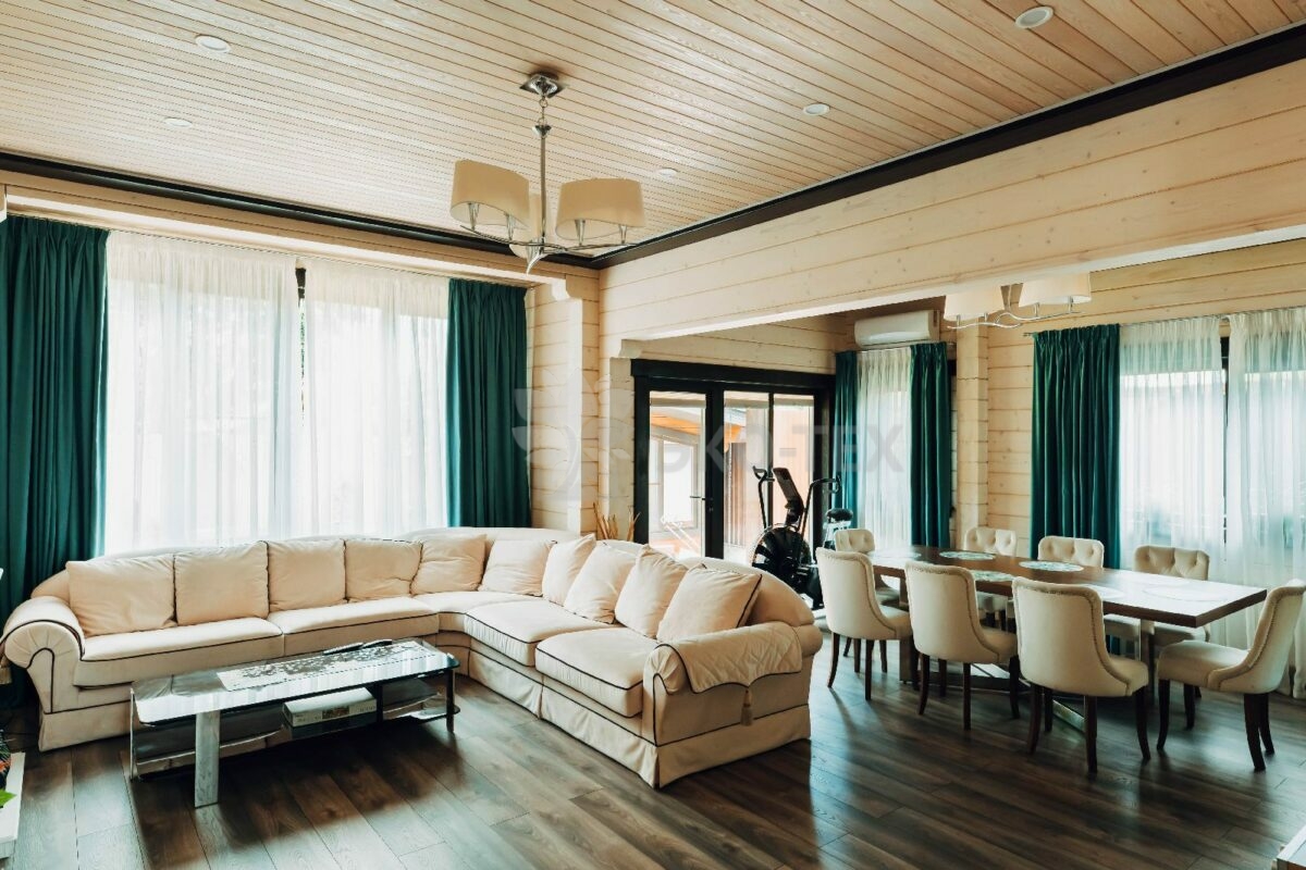 С просторного крыльца мы попадаем в наполненную светом, лёгкую, воздушную атмосферу гостиной. Светлые тона обивки мягкой мебели прекрасно сочетаются с натуральной внутренней отделкой. А огромный угловой диван и большой обеденный стол позволяют удобно разместиться здесь большой и дружной компанией.