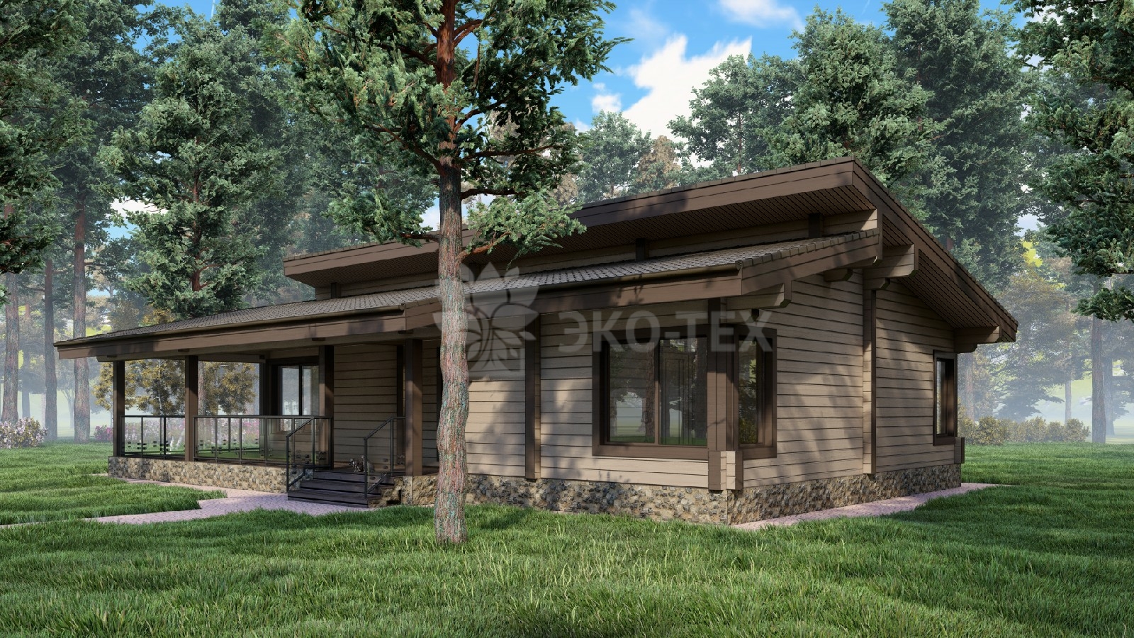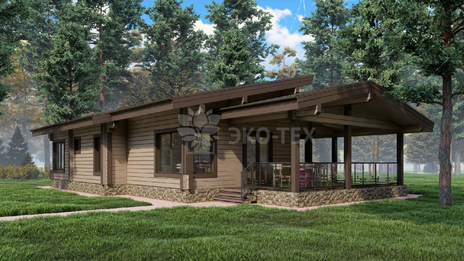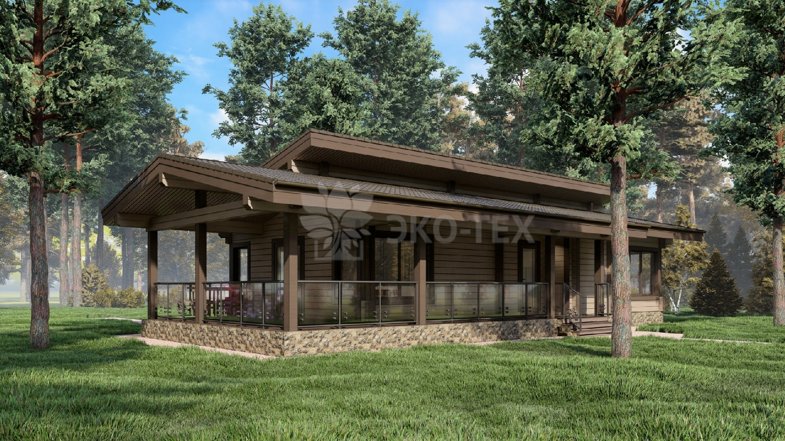 Одноэтажный дом с большой террасой, материал клееный брус