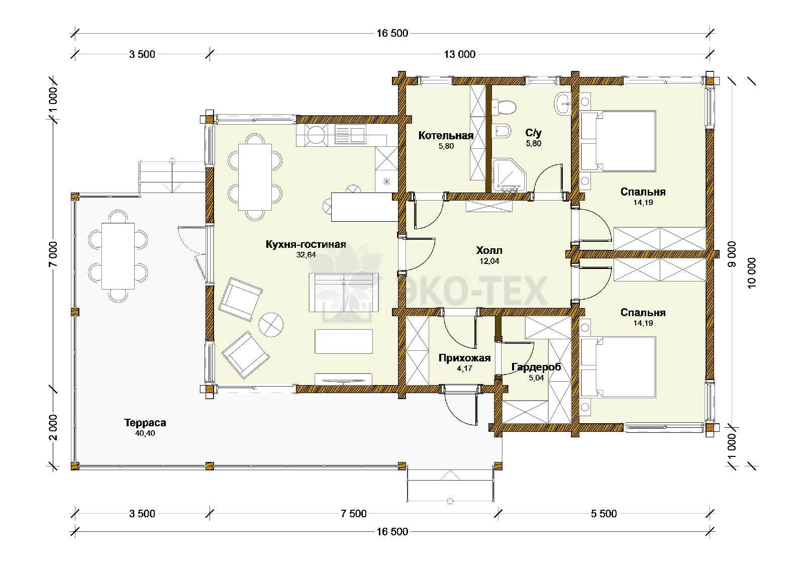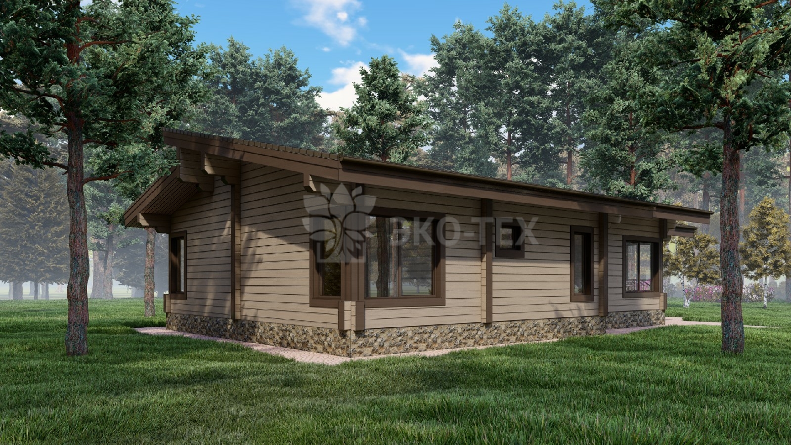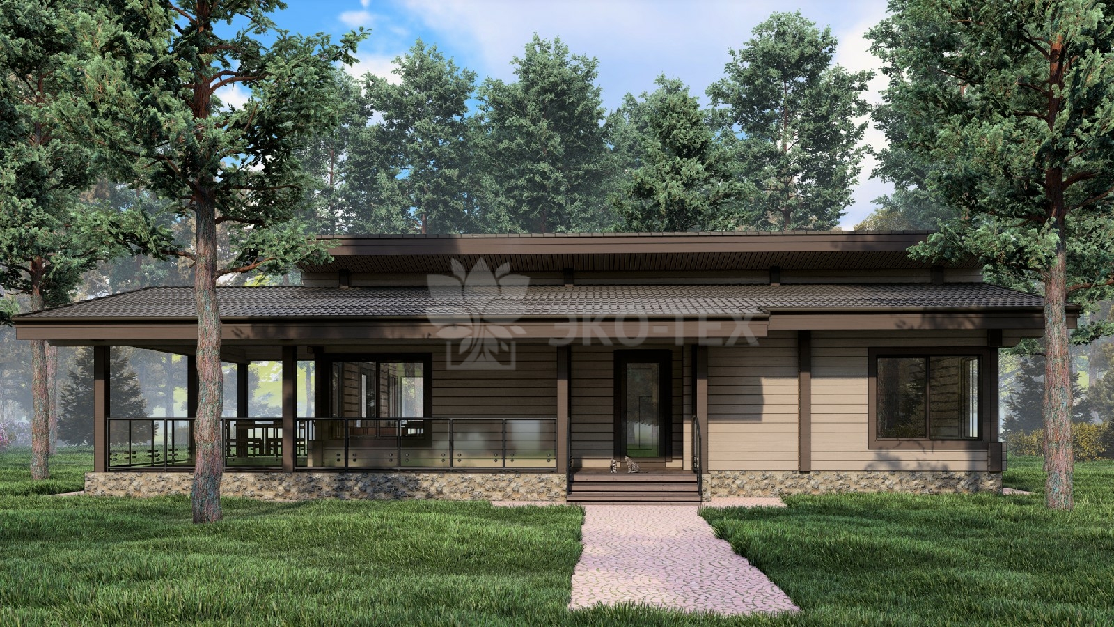 Одноэтажный дом с большой террасой, материал клееный брус