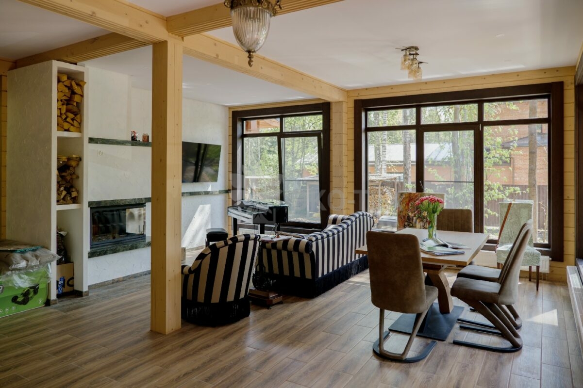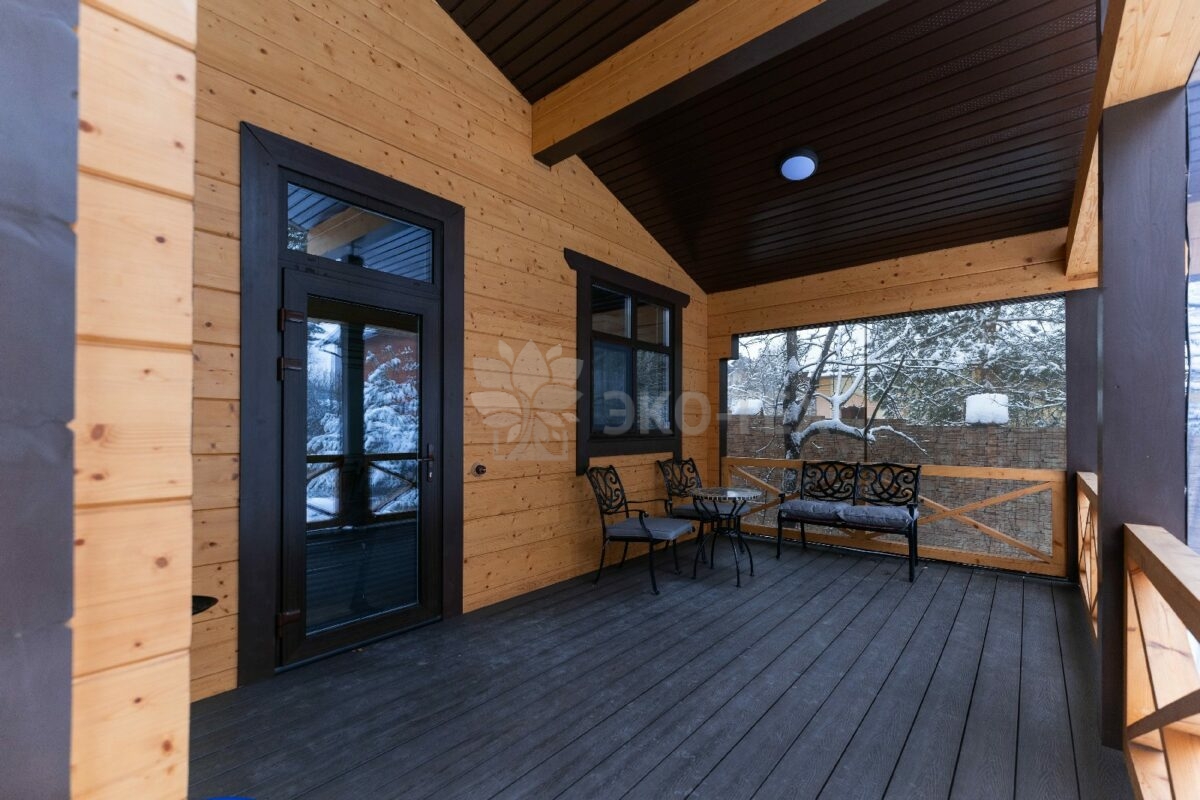 Отдельного внимания заслуживает большая терраса, которая в тёплое время года является естественным продолжением дома— здесь можно проводить свободное время, устраивать чаепития или проводить часы досуга, уединившись с любимой книгой.
