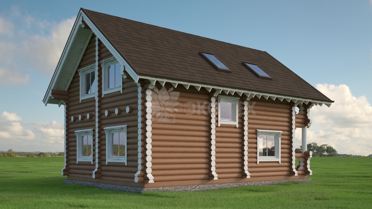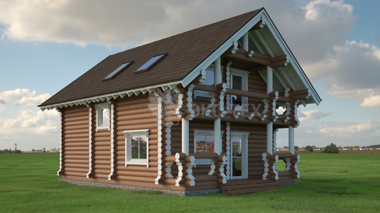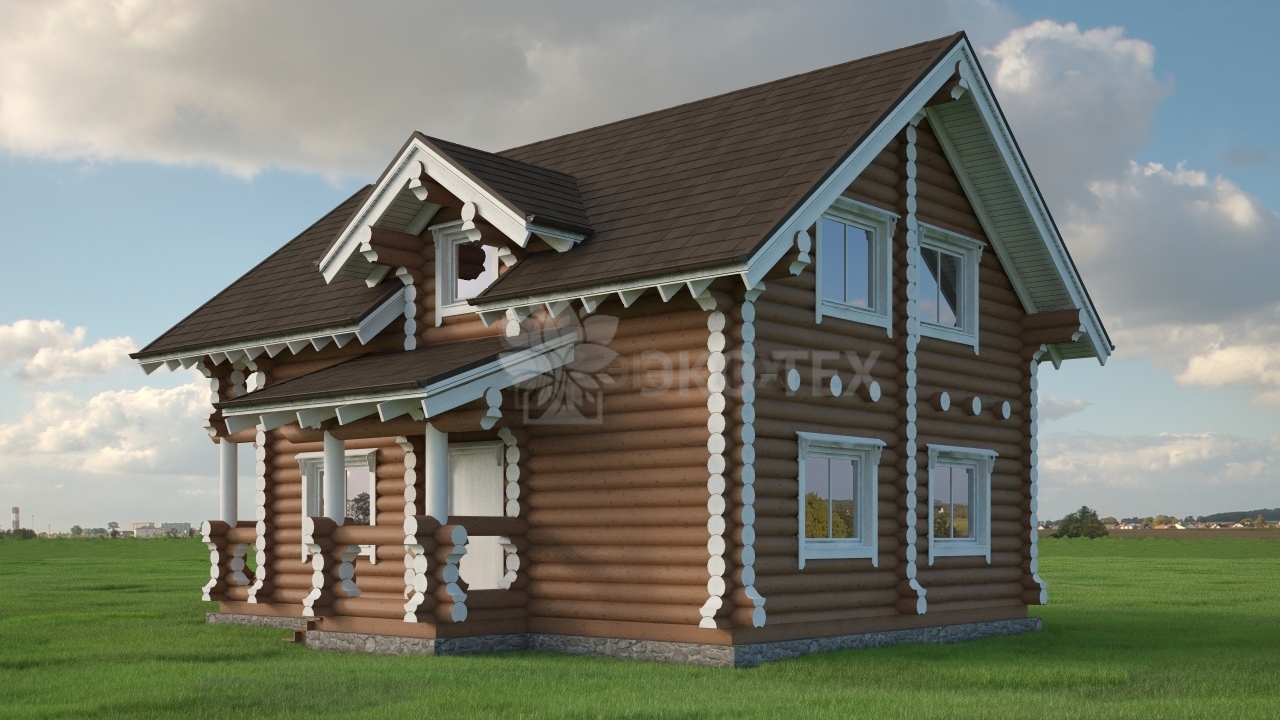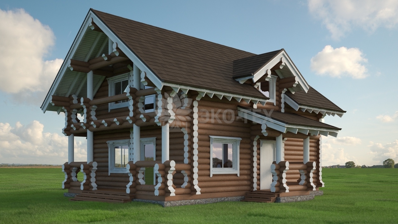 Двухэтажный дом с террасой и мансардой, материал оцилиндрованное бревно