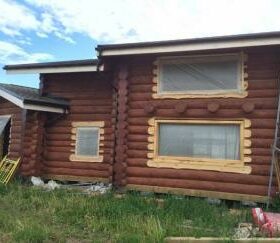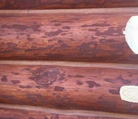 Отёс бревен. Перед отёсом под бревно укладывают и надежно закрепляют 1-2 подкладки. Данный вид обработки производится на 1,2,3, либо 4 канта в соответствии с предварительно нанесенными линиями-меткам. Что делается с использованием намеленного шнура, который натягивается и закрепляется на концах бревна. Поднимаем натянутый шнур и отпускаем, в результате по всей длине заготовки остаются меловые пометки, по которым делается отёс. Производится он по направлению вершина-комль для предотвращения задирания древесины и получения более гладкой поверхности бревна.
