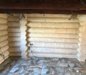 Для того чтобы закрепить брёвна от раскачивания в процессе последующей обработки, применяют обратную скобу. Иногда осуществляют стесывание по краю бревна, и тоже крепят скобой, либо делают вырубку прямоугольной формы в вспомогательной подкладке, куда укладывается край бревна и закрепляется клиньями.