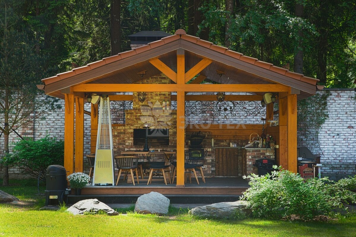 Для постройки беседки, обычно используют деревянные материала — оцилиндрованное бревно, рубленое бревно, клееный или профилированный брус, а также стараются обустроить внутреннее пространство с помощью деревянных изделий, элементов дизайна и интерьера. Многие внутрь устанавливают барную стойку для удобства организации вечеринок и всевозможных праздников, а если пользование беседкой предполагается систематическое, то рядом с мангалом устанавливают что-то, где можно сложить все для пикника необходимое для удобства использования.