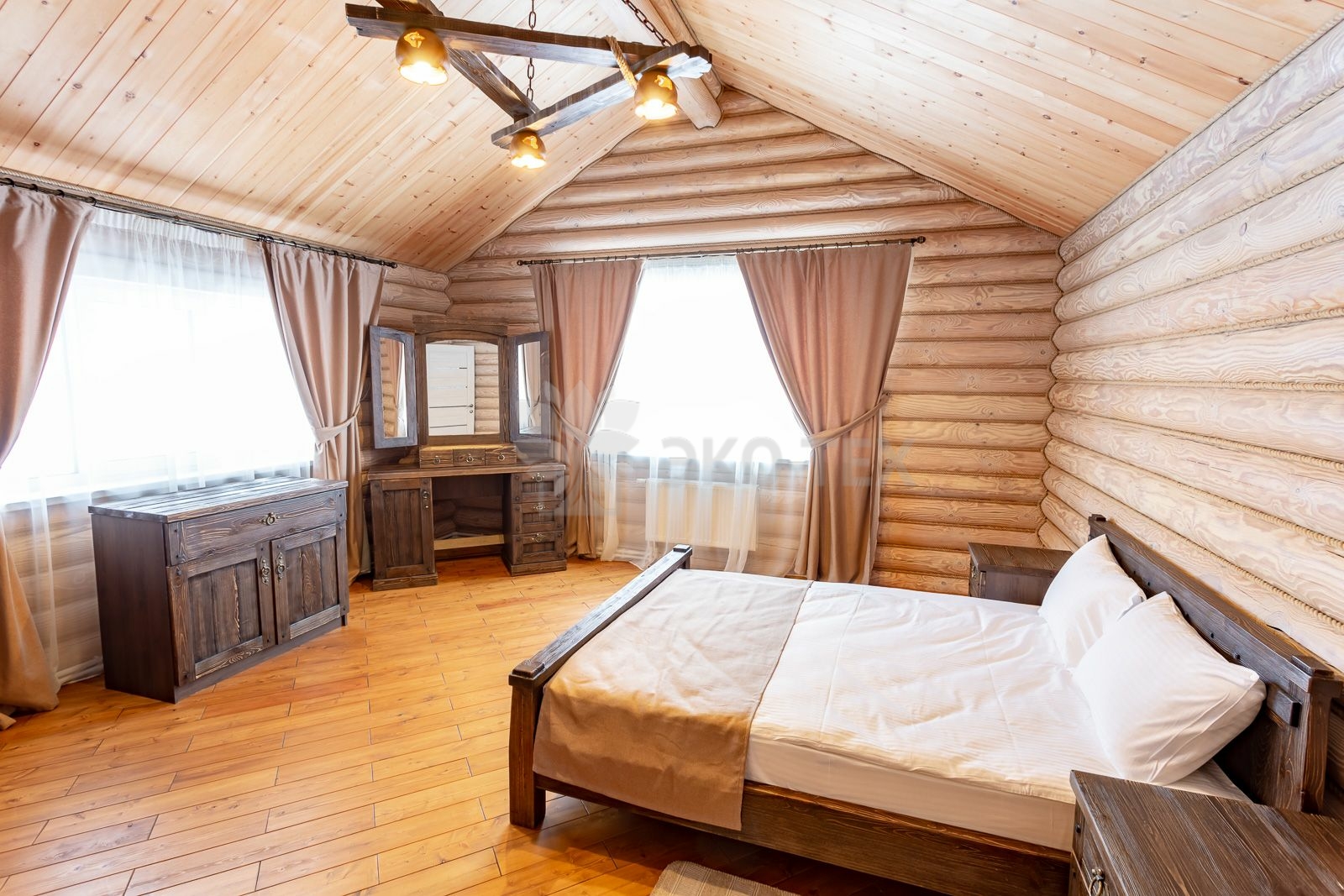 Дизайн спальни в бревенчатом доме подразумевает натуральные оттенки, которые способствуют здоровому сну и отдыху. Обязательные предметы – кровать, шкаф, комод. Нужны яркие детали? Повесьте красочные шторы, например, синие. Кровать с оригинальным изголовьем станет центральным акцентом. Интересно смотрится мебель с коваными элементами.