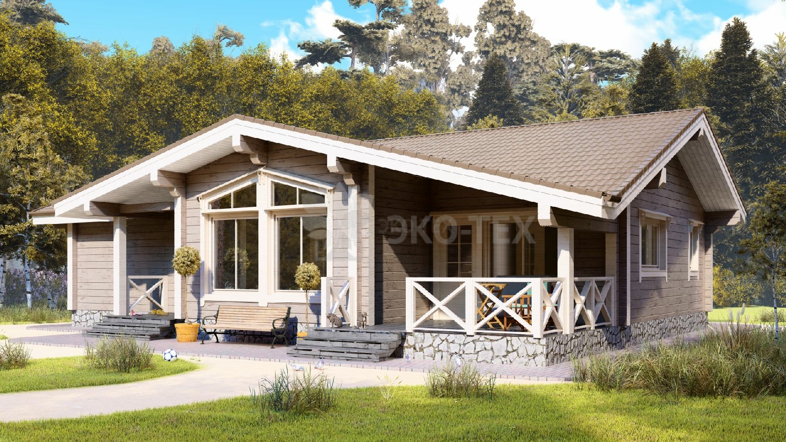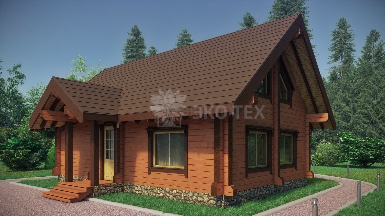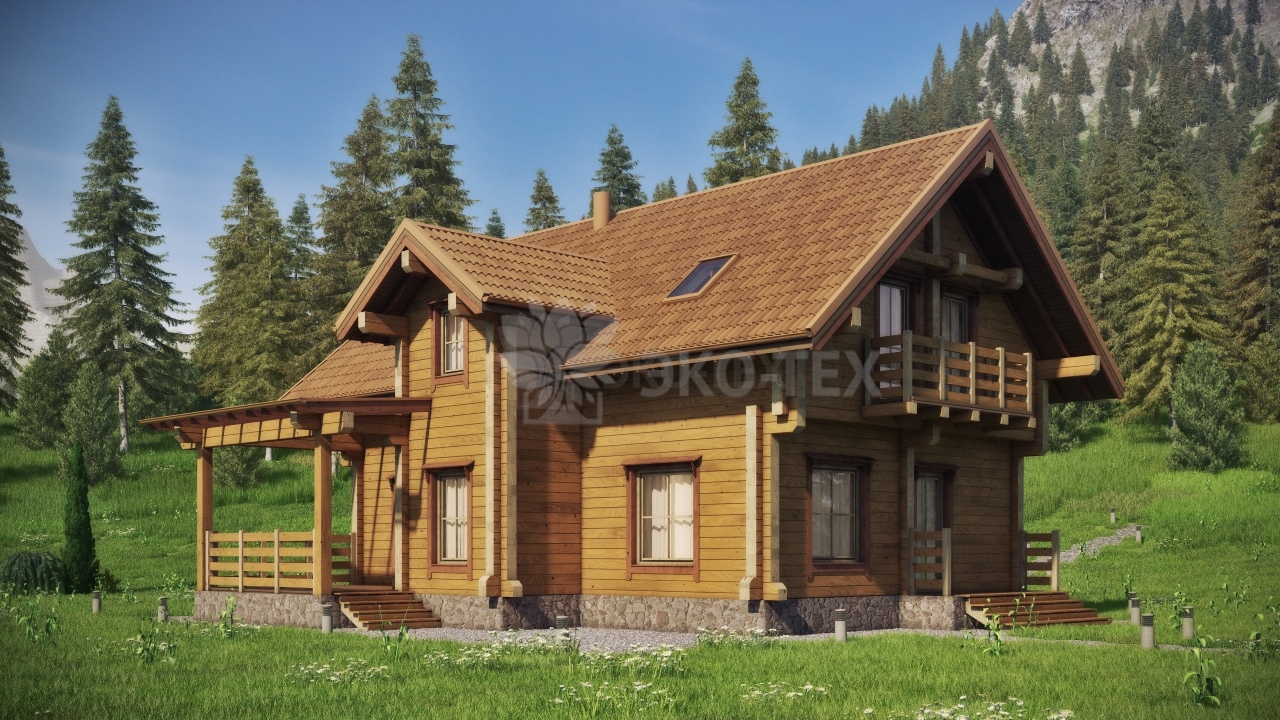 Это обычно одноэтажное строение с мансардой. Крыша пологая двухскатная с отвесом длиной до 3 метров. Таким навесом защищают от дождя, снега балкон, террасу. Уютным шале может стать и одноэтажный маленький дом из клееного бруса. В интерьере присутствуют массивные перекрытия, балки.