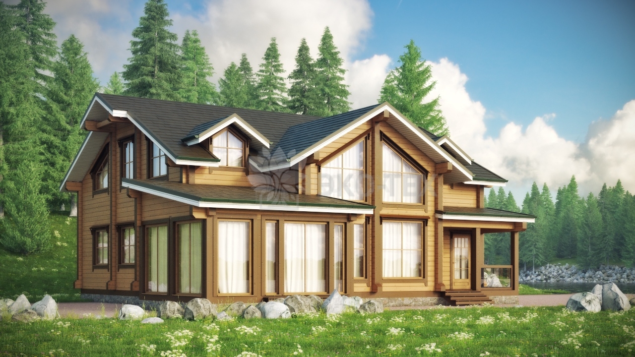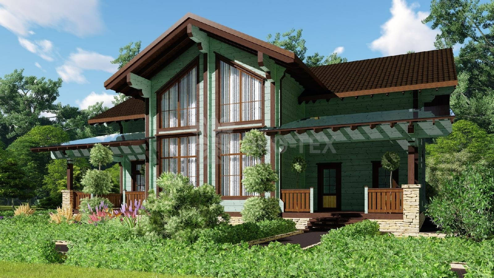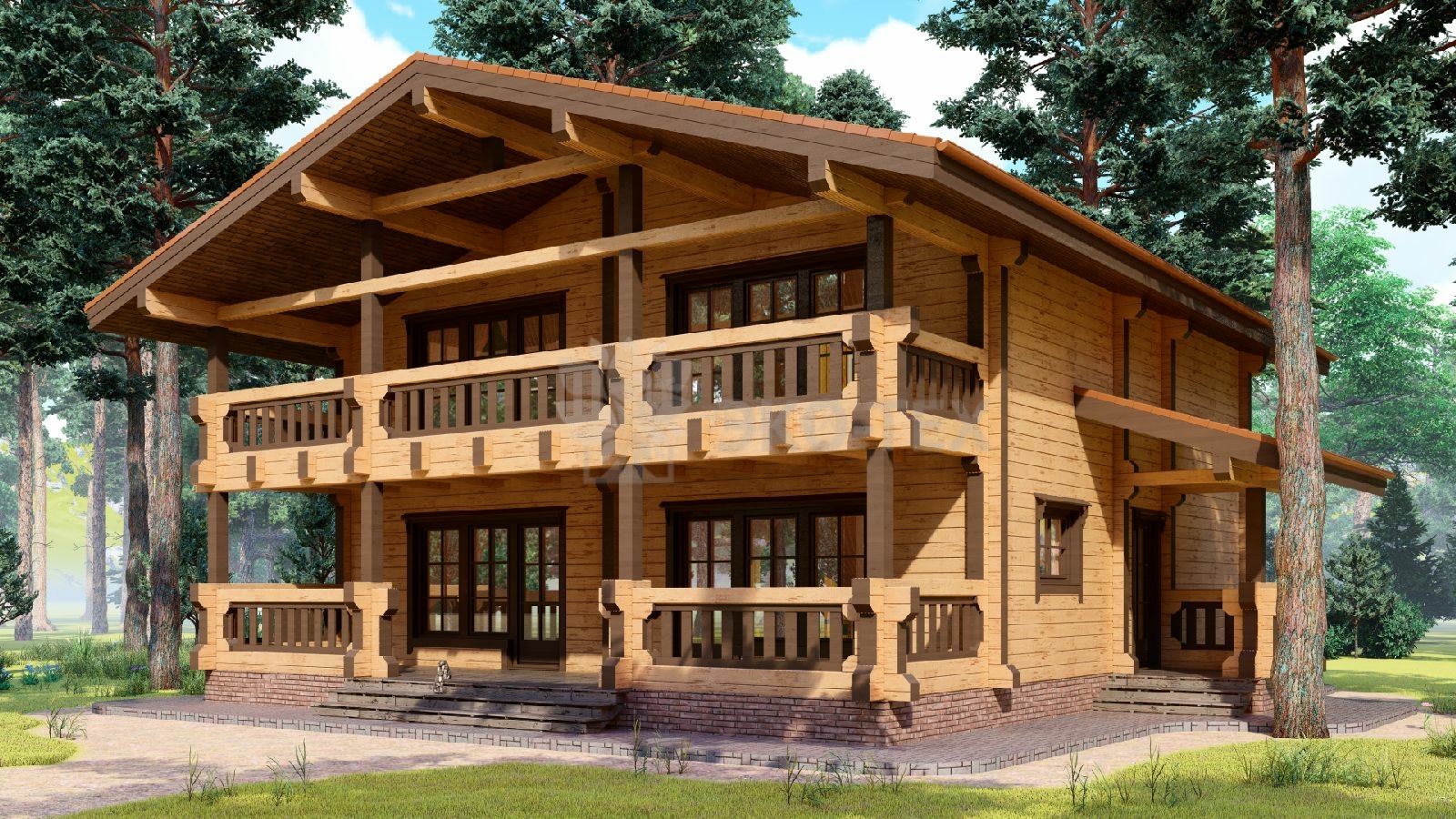 Русский дом совмещает традиции деревянного домостроения и современные материалы и технологии. Все чаще для строительства домов в русском стиле используют клееный брус. Дом сочетает характерные элементы и надежность, прочность бруса. В отделке присутствует резьба, роспись с изображением животных. Стены дома покрывает двухскатная крыша.