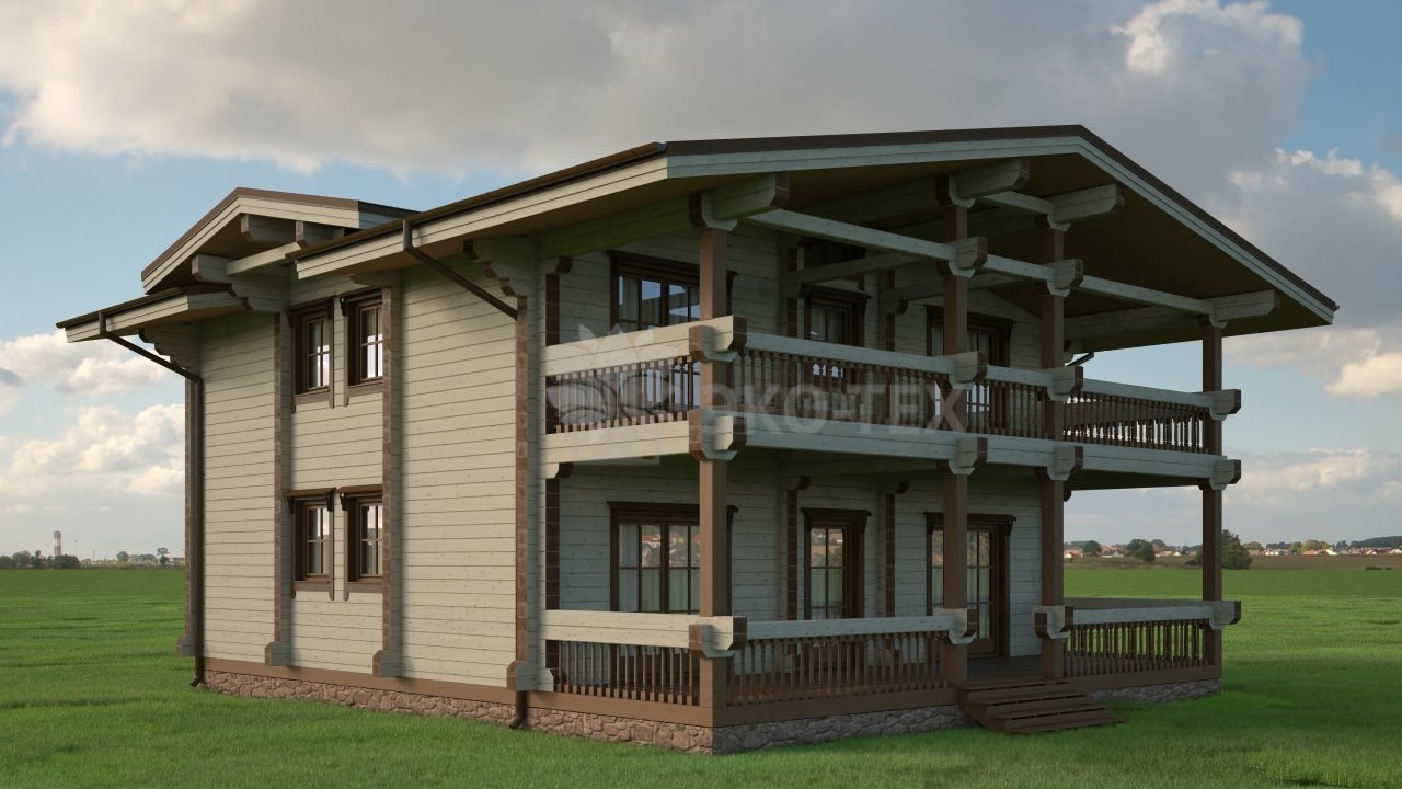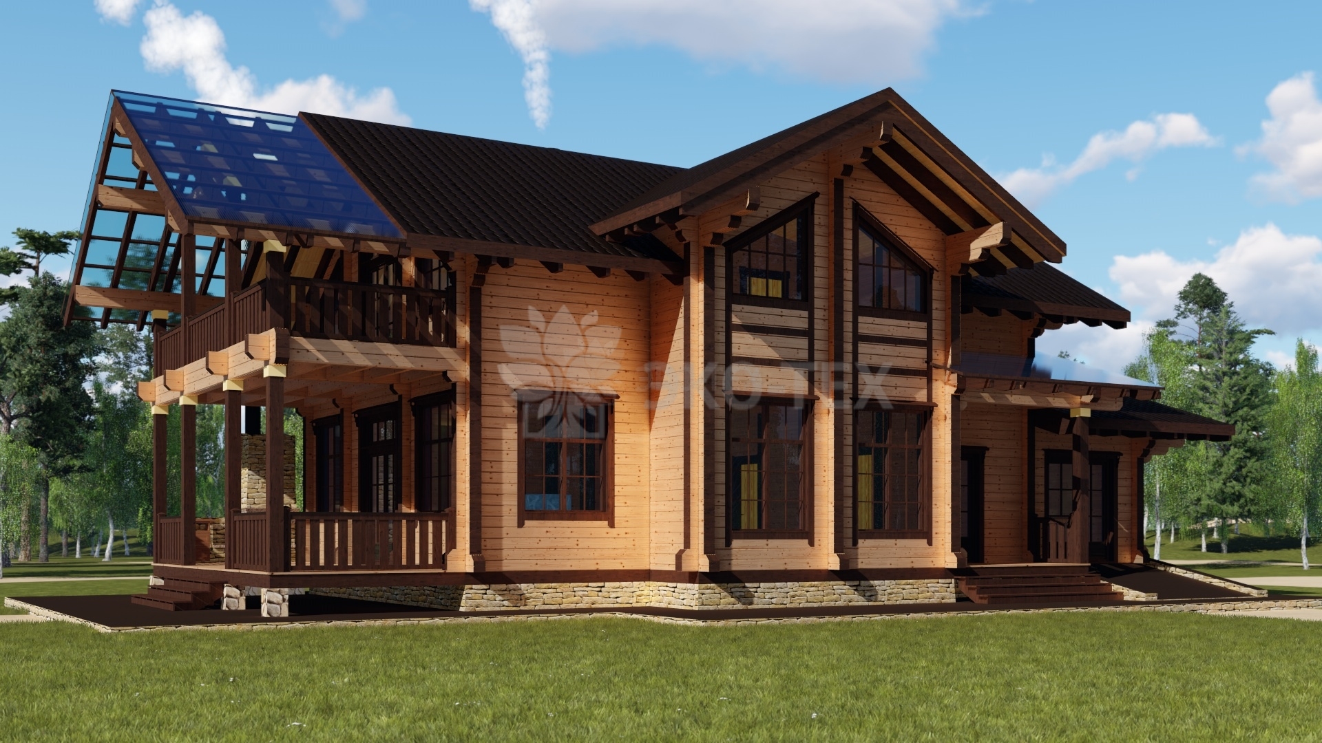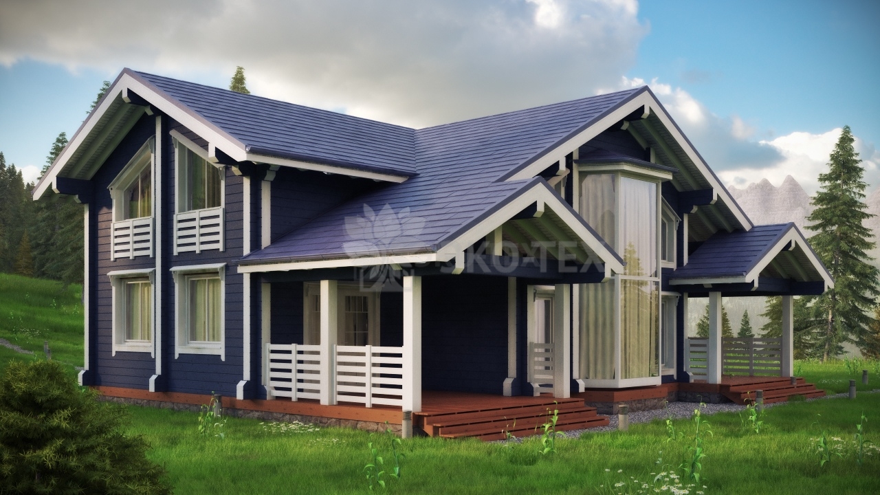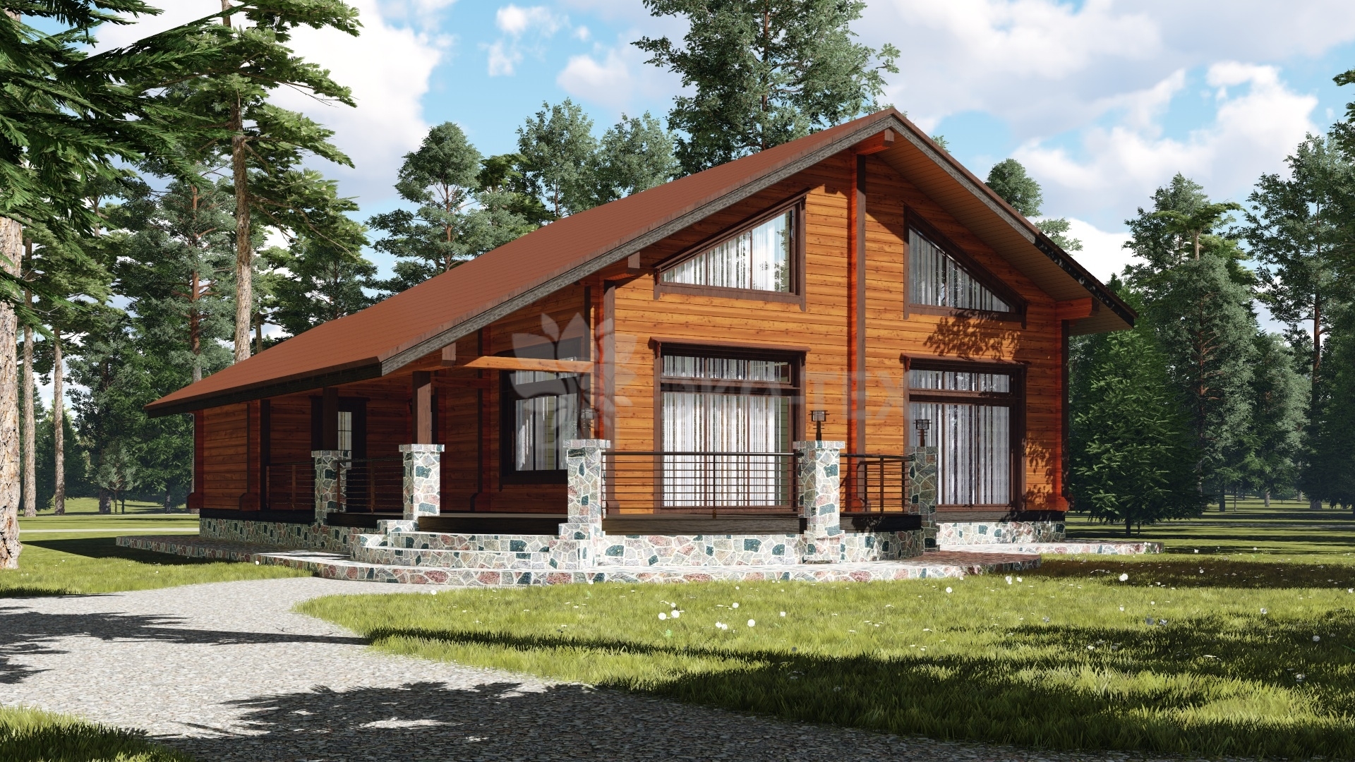 Русский дом совмещает традиции деревянного домостроения и современные материалы и технологии. Все чаще для строительства домов в русском стиле используют клееный брус. Дом сочетает характерные элементы и надежность, прочность бруса. В отделке присутствует резьба, роспись с изображением животных. Стены дома покрывает двухскатная крыша.